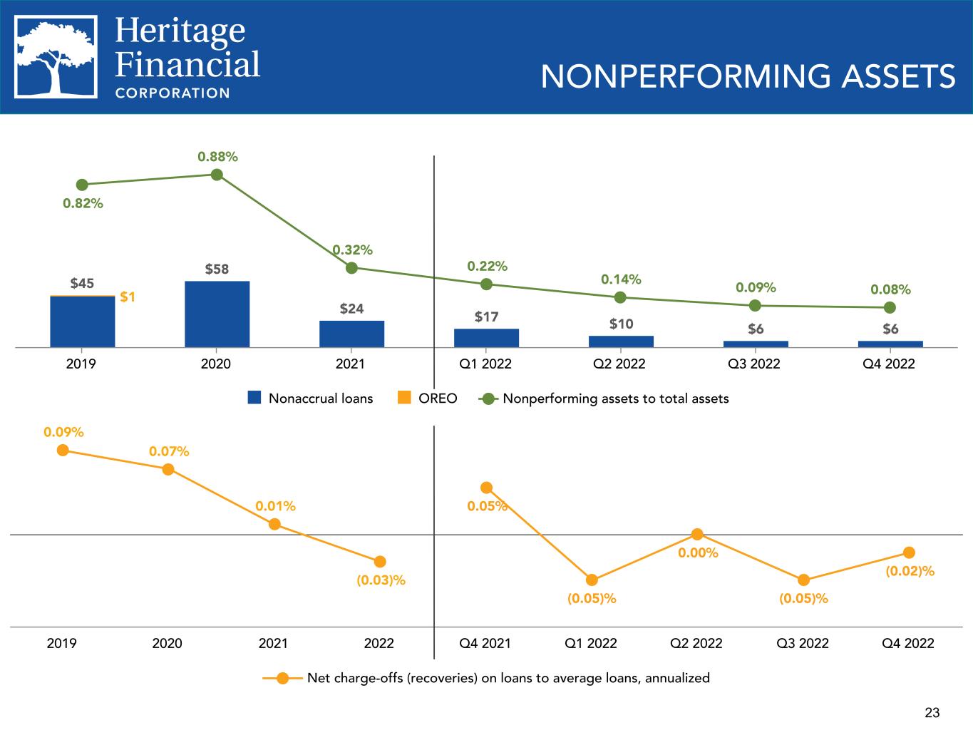 23 $45 $58 $24 $17 $10 $6 $6 Nonaccrual loans OREO Nonperforming assets to total assets 2019 2020 2021 Q1 2022 Q2 2022 Q3 2022 Q4 2022 0.82% 0.88% 0.32% 0.22% 0.14% 0.09% 0.08% NONPERFORMING ASSETS $1 0.09% 0.07% 0.01% (0.03)% 0.05% (0.05)% 0.00% (0.05)% (0.02)% Net charge-offs (recoveries) on loans to average loans, annualized 2019 2020 2021 2022 Q4 2021 Q1 2022 Q2 2022 Q3 2022 Q4 2022