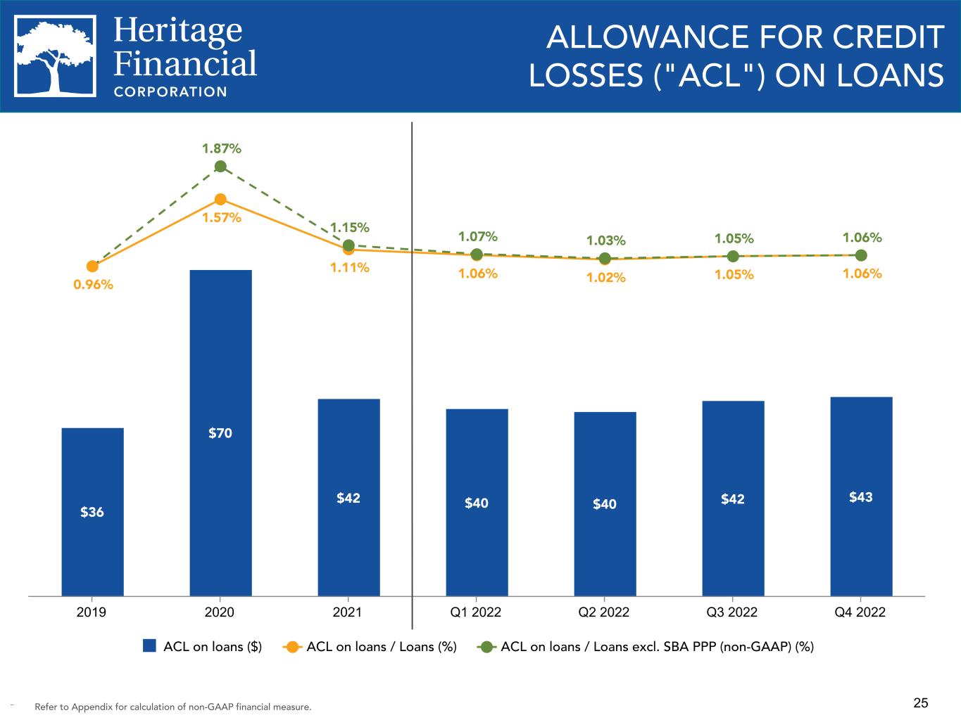 24 CRITICIZED LOANS $143 $291 $183 $175 $166 $150 $135 $45 $58 $24 $17 $10 $6 $6 $49 $100 $89 $95 $84 $60 $60 $49 $132 $71 $63 $72 $84 $69 Substandard - nonaccrual Substandard - accrual Special mention 2019 2020 2021 Q1 2022 Q2 2022 Q3 200 Q4 2022 Criticized Loans by Collateral Type Commercial & industrial 23.1% Owner- occupied CRE 28.6% Non-owner occupied CRE 40.3% Residential real estate 0.1% Construction & land development 6.2% Consumer 1.7% Criticized Loans by Loan Segment Motel / hotel 24.7% Office 17.0% Retail store / shopping center 9.3%Mixed use property 5.3% Elder care 6.2% Farms 3.4% Assisted Living 4.2% Restaurant 2.0% Industrial 6.7% Warehouse 3.1% Other CRE 5.6% Non-CRE 12.5%
