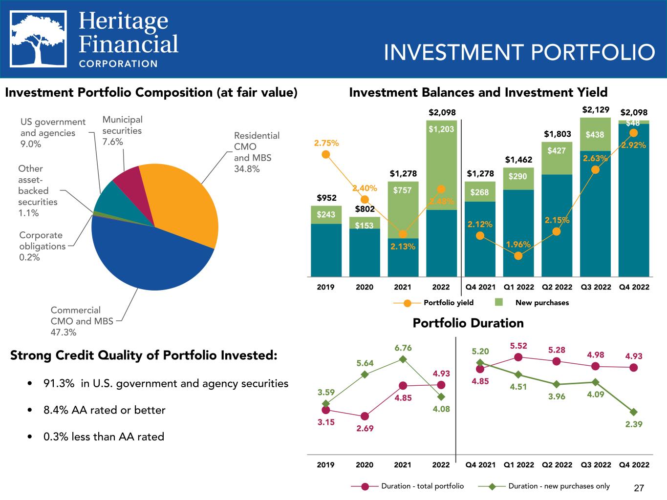 27 $952 $802 $1,278 $2,098 $1,278 $1,462 $1,803 $2,129 $2,098 $243 $153 $757 $1,203 $268 $290 $427 $438 $48 2.75% 2.40% 2.13% 2.48% 2.12% 1.96% 2.15% 2.63% 2.92% Portfolio yield New purchases 2019 2020 2021 2022 Q4 2021 Q1 2022 Q2 2022 Q3 2022 Q4 2022 Investment Balances and Investment Yield INVESTMENT PORTFOLIO Investment Portfolio Composition (at fair value) US government and agencies 9.0% Municipal securities 7.6% Residential CMO and MBS 34.8% Commercial CMO and MBS 47.3% Corporate obligations 0.2% Other asset- backed securities 1.1% 3.15 2.69 4.85 4.93 3.59 5.64 6.76 4.08 4.85 5.52 5.28 4.98 4.935.20 4.51 3.96 4.09 2.39 Duration - total portfolio Duration - new purchases only 2019 2020 2021 2022 Q4 2021 Q1 2022 Q2 2022 Q3 2022 Q4 2022 Portfolio Duration Strong Credit Quality of Portfolio Invested: • 91.3% in U.S. government and agency securities • 8.4% AA rated or better • 0.3% less than AA rated