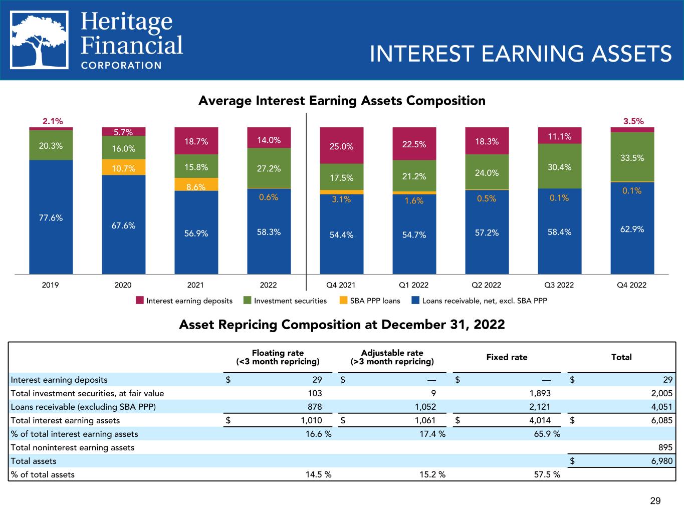 29 Asset Repricing Composition at December 31, 2022 Floating rate (<3 month repricing) Adjustable rate (>3 month repricing) Fixed rate Total Interest earning deposits $ 29 $ — $ — $ 29 Total investment securities, at fair value 103 9 1,893 2,005 Loans receivable (excluding SBA PPP) 878 1,052 2,121 4,051 Total interest earning assets $ 1,010 $ 1,061 $ 4,014 $ 6,085 % of total interest earning assets 16.6 % 17.4 % 65.9 % Total noninterest earning assets 895 Total assets $ 6,980 % of total assets 14.5 % 15.2 % 57.5 % INTEREST EARNING ASSETS Average Interest Earning Assets Composition 77.6% 67.6% 56.9% 58.3% 54.4% 54.7% 57.2% 58.4% 62.9% 10.7% 8.6% 0.6% 3.1% 1.6% 0.5% 0.1% 0.1% 20.3% 16.0% 15.8% 27.2% 17.5% 21.2% 24.0% 30.4% 33.5% 5.7% 18.7% 14.0% 25.0% 22.5% 18.3% 11.1% Interest earning deposits Investment securities SBA PPP loans Loans receivable, net, excl. SBA PPP 2019 2020 2021 2022 Q4 2021 Q1 2022 Q2 2022 Q3 2022 Q4 2022 2.1% 3.5%