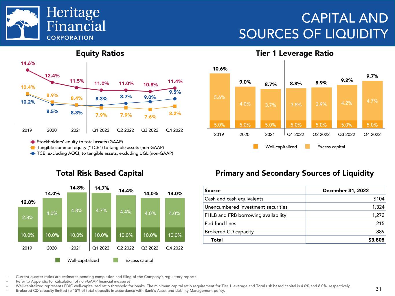 30 $67.6 $46.6 $98.0 $81.9 $85.4 $89.3 $91.1 $98.0 Net income (GAAP) PTPP income (non-GAAP) 2019 2020 2021 2022 Q4 2021 Q1 2022 Q2 2022 Q3 2022 Q4 2022 $19.4 $19.8 $18.6 $21.0 $22.5 $19.3 $19.8 $21.4 $27.6 $29.3 PROFITABILITY TRENDS ROAE (GAAP) and ROATCE (non-GAAP) Noninterest Expense/Avg. Assets ROAA (GAAP) and PTPP ROAA (non-GAAP) 1.25% 0.74% 1.38% 1.12% 1.04% 1.08% 1.01% 1.13% 1.26% 1.58% 1.42% 1.28% 1.34% 1.03% 1.08% 1.16% 1.49% 1.64% ROAA (GAAP) PTPP ROAA (non-GAAP) 2019 2020 2021 2022 Q4 2021 Q1 2022 Q2 2022 Q3 2022 Q4 2022 Net Income (GAAP) and PTPP Income (non- GAAP), in millions 13.35% 8.98% 17.05% 14.94% 13.27% 13.83% 13.68% 15.20% 17.21% 8.56% 5.78% 11.64% 10.08% 9.06% 9.47% 9.19% 10.27% 11.46% ROAE (GAAP) ROATCE (non-GAAP) 2019 2020 2021 2022 Q4 2021 Q1 2022 Q2 2022 Q3 2022 Q4 2022 2.71% 2.37% 2.09% 2.06% 2.06% 1.95% 1.94% 2.11% 2.26% 2019 2020 2021 2022 Q4 2021 Q1 2022 Q2 2022 Q3 2022 Q4 2022 – Refer to Appendix for calculation of non-GAAP financial measures – ROAA - Return on average assets – PTPP - Pre-tax, pre-provision – ROAE - Return on average equity – ROATCE - Return on average tangible common equity