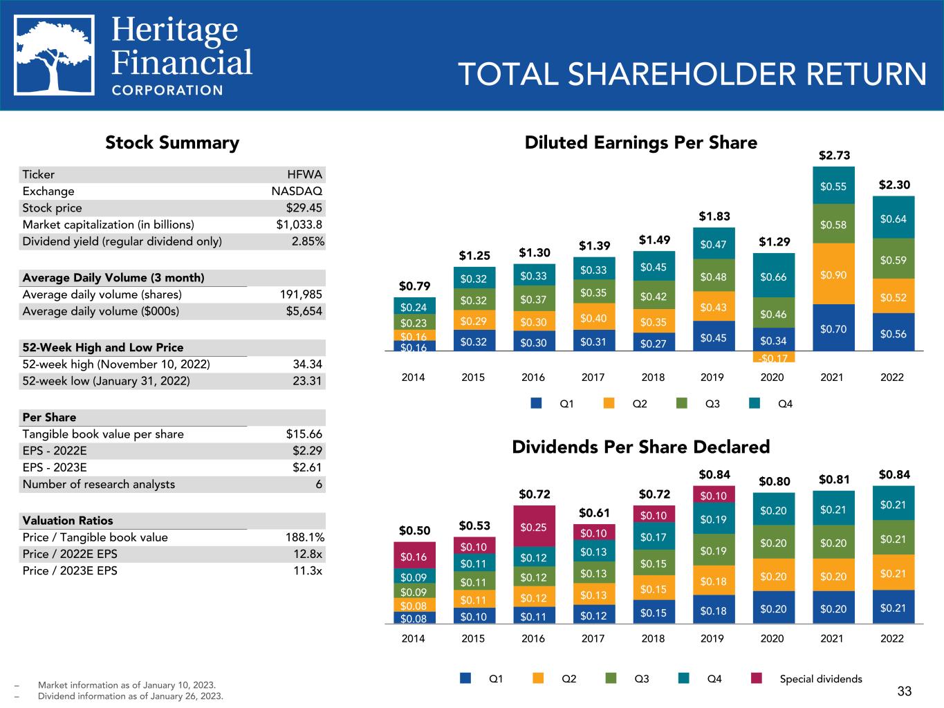 33 TOTAL SHAREHOLDER RETURN Stock Summary Ticker HFWA Exchange NASDAQ Stock price $29.45 Market capitalization (in billions) $1,033.8 Dividend yield (regular dividend only) 2.85% Average Daily Volume (3 month) Average daily volume (shares) 191,985 Average daily volume ($000s) $5,654 52-Week High and Low Price 52-week high (November 10, 2022) 34.34 52-week low (January 31, 2022) 23.31 Per Share Tangible book value per share $15.66 EPS - 2022E $2.29 EPS - 2023E $2.61 Number of research analysts 6 Valuation Ratios Price / Tangible book value 188.1% Price / 2022E EPS 12.8x Price / 2023E EPS 11.3x Dividends Per Share Declared $0.50 $0.53 $0.72 $0.61 $0.72 $0.84 $0.80 $0.81 $0.84 $0.08 $0.10 $0.11 $0.12 $0.15 $0.18 $0.20 $0.20 $0.21$0.08 $0.11 $0.12 $0.13 $0.15 $0.18 $0.20 $0.20 $0.21 $0.09 $0.11 $0.12 $0.13 $0.15 $0.19 $0.20 $0.20 $0.21 $0.09 $0.11 $0.12 $0.13 $0.17 $0.19 $0.20 $0.21 $0.21 $0.16 $0.10 $0.25 $0.10 $0.10 $0.10 Q1 Q2 Q3 Q4 Special dividends 2014 2015 2016 2017 2018 2019 2020 2021 2022 Diluted Earnings Per Share – Market information as of January 10, 2023. – Dividend information as of January 26, 2023. $0.79 $1.25 $1.30 $1.39 $1.49 $1.83 $1.29 $2.73 $2.30 $0.16 $0.32 $0.30 $0.31 $0.27 $0.45 $0.34 $0.70 $0.56$0.16 $0.29 $0.30 $0.40 $0.35 $0.43 -$0.17 $0.90 $0.52 $0.23 $0.32 $0.37 $0.35 $0.42 $0.48 $0.46 $0.58 $0.59 $0.24 $0.32 $0.33 $0.33 $0.45 $0.47 $0.66 $0.55 $0.64 Q1 Q2 Q3 Q4 2014 2015 2016 2017 2018 2019 2020 2021 2022