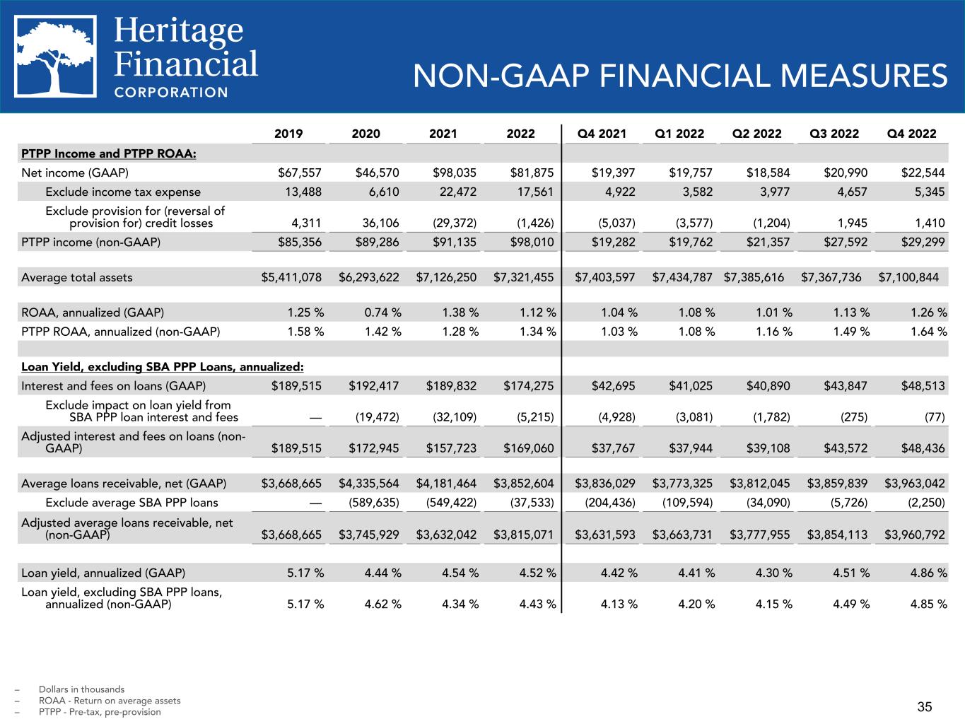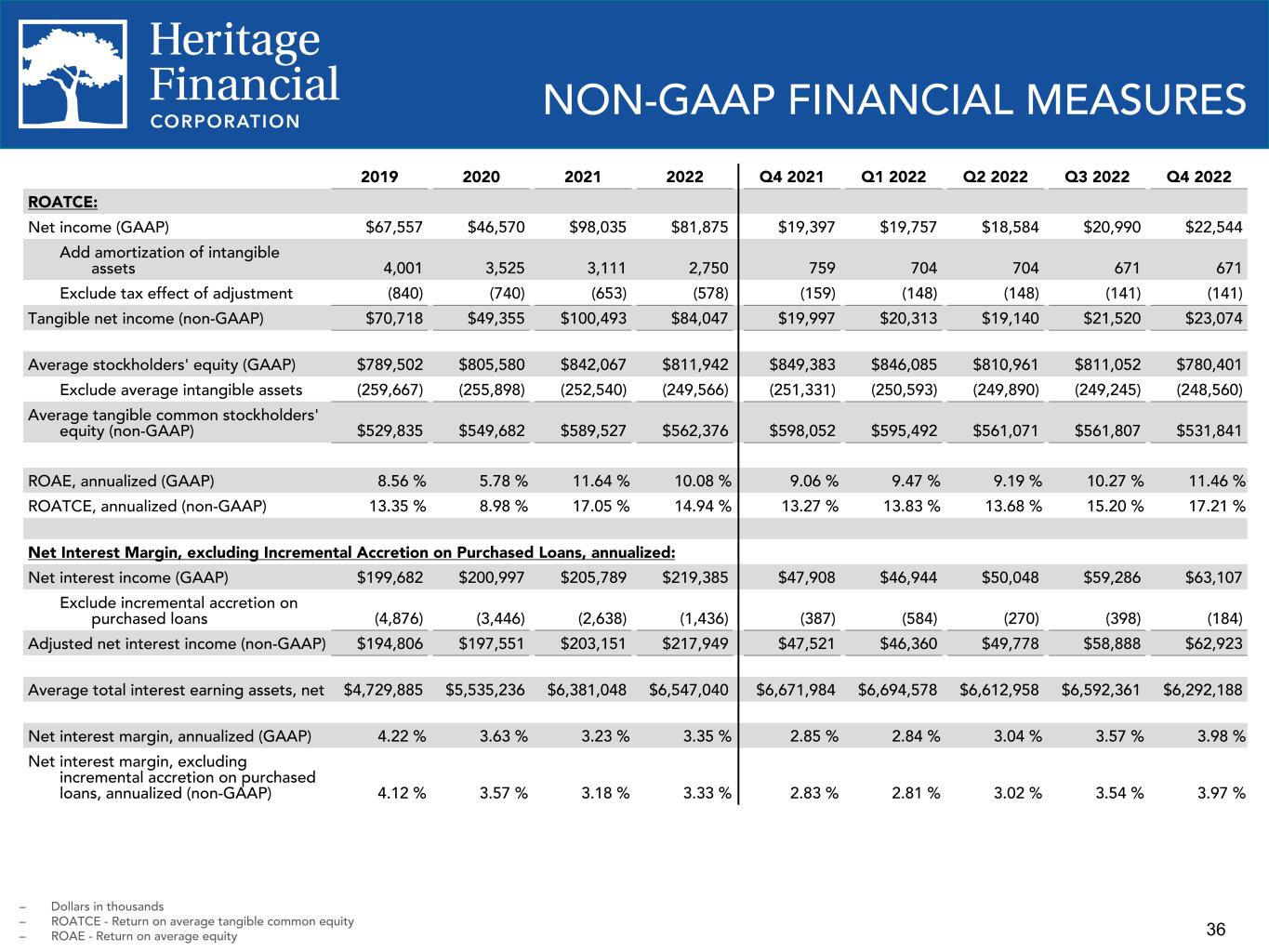 35 NON-GAAP FINANCIAL MEASURES 2019 2020 2021 2022 Q4 2021 Q1 2022 Q2 2022 Q3 2022 Q4 2022 PTPP Income and PTPP ROAA: Net income (GAAP) $67,557 $46,570 $98,035 $81,875 $19,397 $19,757 $18,584 $20,990 $22,544 Exclude income tax expense 13,488 6,610 22,472 17,561 4,922 3,582 3,977 4,657 5,345 Exclude provision for (reversal of provision for) credit losses 4,311 36,106 (29,372) (1,426) (5,037) (3,577) (1,204) 1,945 1,410 PTPP income (non-GAAP) $85,356 $89,286 $91,135 $98,010 $19,282 $19,762 $21,357 $27,592 $29,299 Average total assets $5,411,078 $6,293,622 $7,126,250 $7,321,455 $7,403,597 $7,434,787 $7,385,616 $7,367,736 $7,100,844 ROAA, annualized (GAAP) 1.25 % 0.74 % 1.38 % 1.12 % 1.04 % 1.08 % 1.01 % 1.13 % 1.26 % PTPP ROAA, annualized (non-GAAP) 1.58 % 1.42 % 1.28 % 1.34 % 1.03 % 1.08 % 1.16 % 1.49 % 1.64 % Loan Yield, excluding SBA PPP Loans, annualized: Interest and fees on loans (GAAP) $189,515 $192,417 $189,832 $174,275 $42,695 $41,025 $40,890 $43,847 $48,513 Exclude impact on loan yield from SBA PPP loan interest and fees — (19,472) (32,109) (5,215) (4,928) (3,081) (1,782) (275) (77) Adjusted interest and fees on loans (non- GAAP) $189,515 $172,945 $157,723 $169,060 $37,767 $37,944 $39,108 $43,572 $48,436 Average loans receivable, net (GAAP) $3,668,665 $4,335,564 $4,181,464 $3,852,604 $3,836,029 $3,773,325 $3,812,045 $3,859,839 $3,963,042 Exclude average SBA PPP loans — (589,635) (549,422) (37,533) (204,436) (109,594) (34,090) (5,726) (2,250) Adjusted average loans receivable, net (non-GAAP) $3,668,665 $3,745,929 $3,632,042 $3,815,071 $3,631,593 $3,663,731 $3,777,955 $3,854,113 $3,960,792 Loan yield, annualized (GAAP) 5.17 % 4.44 % 4.54 % 4.52 % 4.42 % 4.41 % 4.30 % 4.51 % 4.86 % Loan yield, excluding SBA PPP loans, annualized (non-GAAP) 5.17 % 4.62 % 4.34 % 4.43 % 4.13 % 4.20 % 4.15 % 4.49 % 4.85 % – Dollars in thousands – ROAA - Return on average assets – PTPP - Pre-tax, pre-provision
