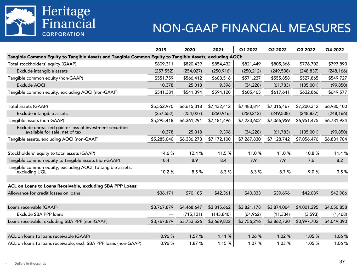 36 2019 2020 2021 2022 Q4 2021 Q1 2022 Q2 2022 Q3 2022 Q4 2022 ROATCE: Net income (GAAP) $67,557 $46,570 $98,035 $81,875 $19,397 $19,757 $18,584 $20,990 $22,544 Add amortization of intangible assets 4,001 3,525 3,111 2,750 759 704 704 671 671 Exclude tax effect of adjustment (840) (740) (653) (578) (159) (148) (148) (141) (141) Tangible net income (non-GAAP) $70,718 $49,355 $100,493 $84,047 $19,997 $20,313 $19,140 $21,520 $23,074 Average stockholders' equity (GAAP) $789,502 $805,580 $842,067 $811,942 $849,383 $846,085 $810,961 $811,052 $780,401 Exclude average intangible assets (259,667) (255,898) (252,540) (249,566) (251,331) (250,593) (249,890) (249,245) (248,560) Average tangible common stockholders' equity (non-GAAP) $529,835 $549,682 $589,527 $562,376 $598,052 $595,492 $561,071 $561,807 $531,841 ROAE, annualized (GAAP) 8.56 % 5.78 % 11.64 % 10.08 % 9.06 % 9.47 % 9.19 % 10.27 % 11.46 % ROATCE, annualized (non-GAAP) 13.35 % 8.98 % 17.05 % 14.94 % 13.27 % 13.83 % 13.68 % 15.20 % 17.21 % Net Interest Margin, excluding Incremental Accretion on Purchased Loans, annualized: Net interest income (GAAP) $199,682 $200,997 $205,789 $219,385 $47,908 $46,944 $50,048 $59,286 $63,107 Exclude incremental accretion on purchased loans (4,876) (3,446) (2,638) (1,436) (387) (584) (270) (398) (184) Adjusted net interest income (non-GAAP) $194,806 $197,551 $203,151 $217,949 $47,521 $46,360 $49,778 $58,888 $62,923 Average total interest earning assets, net $4,729,885 $5,535,236 $6,381,048 $6,547,040 $6,671,984 $6,694,578 $6,612,958 $6,592,361 $6,292,188 Net interest margin, annualized (GAAP) 4.22 % 3.63 % 3.23 % 3.35 % 2.85 % 2.84 % 3.04 % 3.57 % 3.98 % Net interest margin, excluding incremental accretion on purchased loans, annualized (non-GAAP) 4.12 % 3.57 % 3.18 % 3.33 % 2.83 % 2.81 % 3.02 % 3.54 % 3.97 % NON-GAAP FINANCIAL MEASURES – Dollars in thousands – ROATCE - Return on average tangible common equity – ROAE - Return on average equity