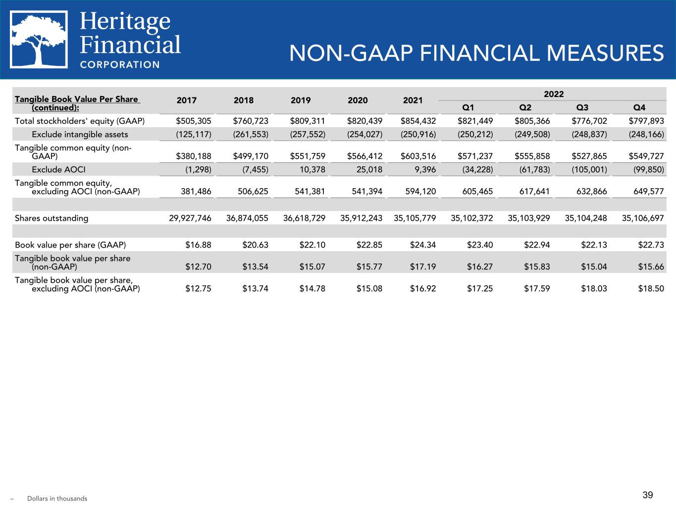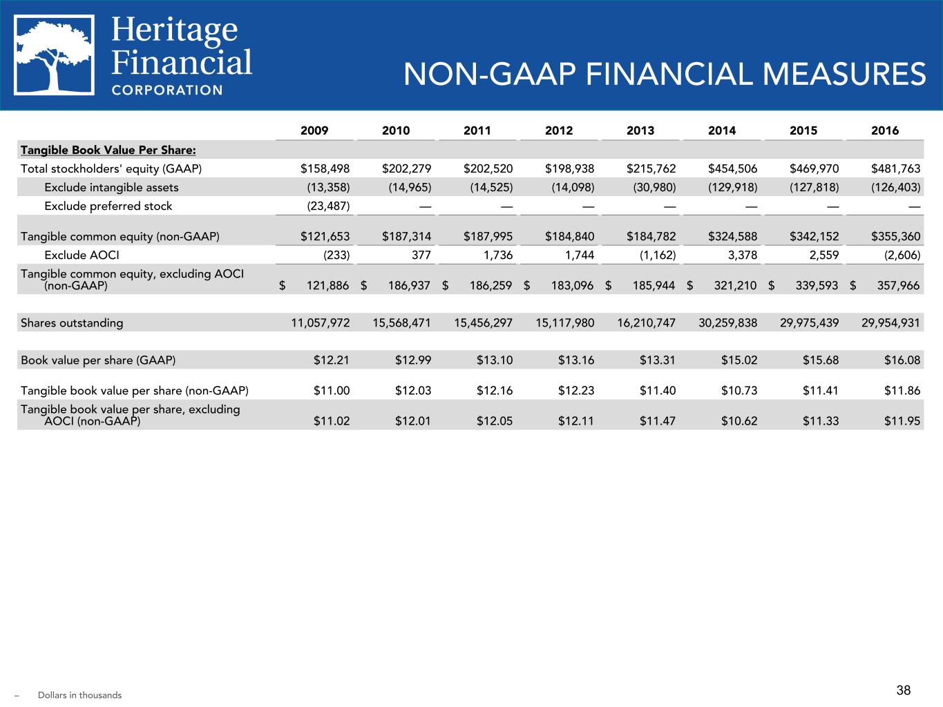 38 2009 2010 2011 2012 2013 2014 2015 2016 Tangible Book Value Per Share: Total stockholders' equity (GAAP) $158,498 $202,279 $202,520 $198,938 $215,762 $454,506 $469,970 $481,763 Exclude intangible assets (13,358) (14,965) (14,525) (14,098) (30,980) (129,918) (127,818) (126,403) Exclude preferred stock (23,487) — — — — — — — Tangible common equity (non-GAAP) $121,653 $187,314 $187,995 $184,840 $184,782 $324,588 $342,152 $355,360 Exclude AOCI (233) 377 1,736 1,744 (1,162) 3,378 2,559 (2,606) Tangible common equity, excluding AOCI (non-GAAP) $ 121,886 $ 186,937 $ 186,259 $ 183,096 $ 185,944 $ 321,210 $ 339,593 $ 357,966 Shares outstanding 11,057,972 15,568,471 15,456,297 15,117,980 16,210,747 30,259,838 29,975,439 29,954,931 Book value per share (GAAP) $12.21 $12.99 $13.10 $13.16 $13.31 $15.02 $15.68 $16.08 Tangible book value per share (non-GAAP) $11.00 $12.03 $12.16 $12.23 $11.40 $10.73 $11.41 $11.86 Tangible book value per share, excluding AOCI (non-GAAP) $11.02 $12.01 $12.05 $12.11 $11.47 $10.62 $11.33 $11.95 NON-GAAP FINANCIAL MEASURES – Dollars in thousands