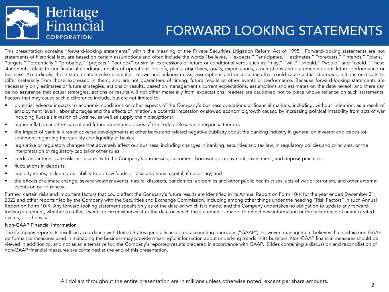 2 This presentation contains “forward-looking statements” within the meaning of the Private Securities Litigation Reform Act of 1995. Forward-looking statements are not statements of historical fact, are based on certain assumptions and often include the words “believes,” “expects,” “anticipates,” “estimates,” “forecasts,” “intends,” “plans,” “targets,” “potentially,” “probably,” “projects,” “outlook” or similar expressions or future or conditional verbs such as “may,” “will,” “should,” “would” and “could.” These statements relate to our financial condition, results of operations, beliefs, plans, objectives, goals, expectations, assumptions and statements about future performance or business. Accordingly, these statements involve estimates, known and unknown risks, assumptions and uncertainties that could cause actual strategies, actions or results to differ materially from those expressed in them, and are not guarantees of timing, future results or other events or performance. Because forward-looking statements are necessarily only estimates of future strategies, actions or results, based on management’s current expectations, assumptions and estimates on the date hereof, and there can be no assurance that actual strategies, actions or results will not differ materially from expectations, readers are cautioned not to place undue reliance on such statements. Factors that may cause such a difference include, but are not limited to: • potential adverse impacts to economic conditions or other aspects of the Company’s business operations or financial markets, including, without limitation, as a result of employment levels, labor shortages and the effects of inflation, a potential recession or slowed economic growth caused by increasing political instability from acts of war including Russia’s invasion of Ukraine, as well as supply chain disruptions; • higher inflation and the current and future monetary policies of the Federal Reserve in response thereto; • the impact of bank failures or adverse developments at other banks and related negative publicity about the banking industry in general on investor and depositor sentiment regarding the stability and liquidity of banks; • legislative or regulatory changes that adversely affect our business, including changes in banking, securities and tax law, in regulatory policies and principles, or the interpretation of regulatory capital or other rules; • credit and interest rate risks associated with the Company’s businesses, customers, borrowings, repayment, investment, and deposit practices; • fluctuations in deposits; • liquidity issues, including our ability to borrow funds or raise additional capital, if necessary; and • the effects of climate change, severe weather events, natural disasters, pandemics, epidemics and other public health crises, acts of war or terrorism, and other external events on our business. Further, certain risks and important factors that could affect the Company’s future results are identified in its Annual Report on Form 10-K for the year ended December 31, 2022 and other reports filed by the Company with the Securities and Exchange Commission, including among other things under the heading “Risk Factors” in such Annual Report on Form 10-K. Any forward-looking statement speaks only as of the date on which it is made, and the Company undertakes no obligation to update any forward- looking statement, whether to reflect events or circumstances after the date on which the statement is made, to reflect new information or the occurrence of unanticipated events, or otherwise. Non-GAAP Financial Information The Company reports its results in accordance with United States generally accepted accounting principles (“GAAP”). However, management believes that certain non-GAAP performance measures used in managing the business may provide meaningful information about underlying trends in its business. Non-GAAP financial measures should be viewed in addition to, and not as an alternative for, the Company’s reported results prepared in accordance with GAAP. Slides containing a discussion and reconciliation of non-GAAP financial measures are contained at the end of this presentation. All dollars throughout the entire presentation are in millions unless otherwise noted, except per share amounts. FORWARD LOOKING STATEMENTS