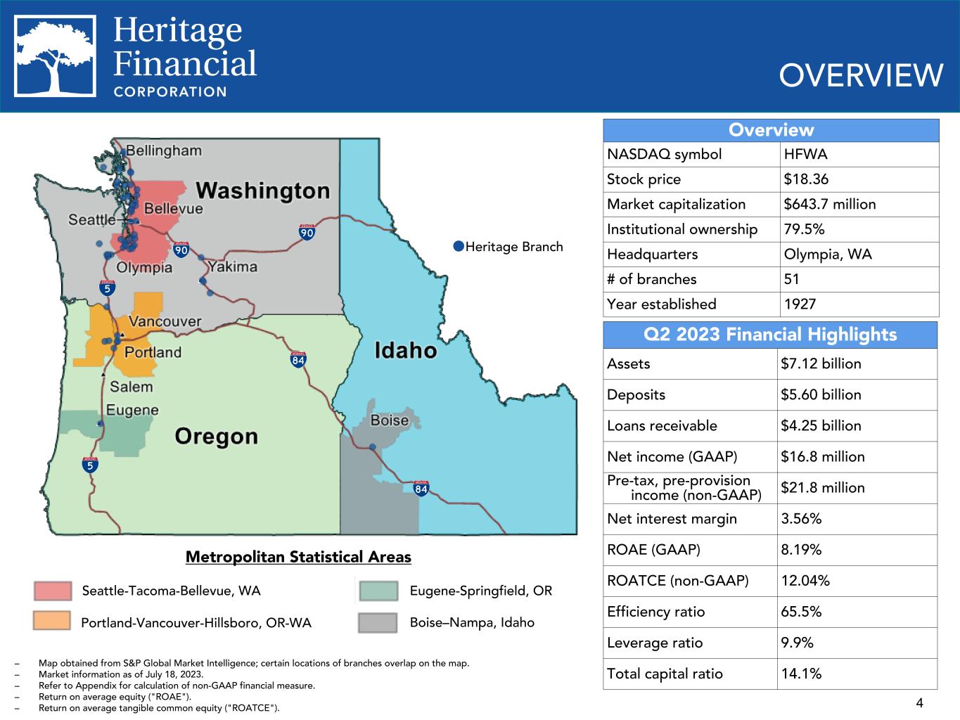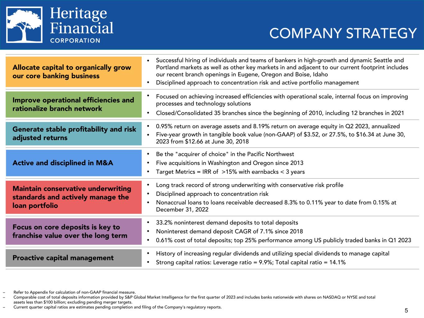4 OVERVIEW Overview NASDAQ symbol HFWA Stock price $18.36 Market capitalization $643.7 million Institutional ownership 79.5% Headquarters Olympia, WA # of branches 51 Year established 1927 Q2 2023 Financial Highlights Assets $7.12 billion Deposits $5.60 billion Loans receivable $4.25 billion Net income (GAAP) $16.8 million Pre-tax, pre-provision income (non-GAAP) $21.8 million Net interest margin 3.56% ROAE (GAAP) 8.19% ROATCE (non-GAAP) 12.04% Efficiency ratio 65.5% Leverage ratio 9.9% Total capital ratio 14.1% – Map obtained from S&P Global Market Intelligence; certain locations of branches overlap on the map. – Market information as of July 18, 2023. – Refer to Appendix for calculation of non-GAAP financial measure. – Return on average equity ("ROAE"). – Return on average tangible common equity ("ROATCE"). Metropolitan Statistical Areas Seattle-Tacoma-Bellevue, WA Portland-Vancouver-Hillsboro, OR-WA Eugene-Springfield, OR Boise–Nampa, Idaho Heritage Branch