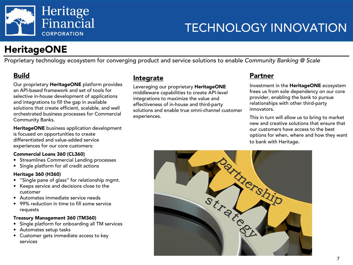 6 TECHNOLOGY STRATEGY Objective: Invest in technologies that enable Community Banking @ Scale HeritageONE Technology convergence & omni- channel experiences Ÿ Cutting-edge, proprietary ecosystem providing Heritage the ability to develop custom business applications and systems integrations Ÿ Results in opportunity to integrate processes and technologies to create highly converged, omni-channel customer experiences Ÿ Designed to minimize the cost of internal solution development and accelerate the Bank’s ability to integrate with best of breed vendor solutions Ÿ Investment in JAM FINTOP Blockchain fund, providing access to early-stage opportunities across the spectrum of Fintech innovation to partner and extend the capabilities of the HeritageONE ecosystem 2022-2024 Roadmap Integration and process efficiency Ÿ Continued investment in HeritageONE based solutions, expanding the capabilities of existing tools and adding several new tools to drive efficiency and unified customer- experiences Ÿ Enhance digital account opening capabilities in partnership with Q2; unified call, chat and self-service IVR solution in partnership with Cisco Ÿ Customize online banking and call center platforms to leverage data to drive personalized and omni-channel experiences Key Outcomes Community Banking @ Scale Ÿ Heritage Bank positioned to be a technology leader among Community Banks Ÿ Next generation front & back office integration delivering efficiency, consistency and scalability Ÿ Bankers equipped with better sales and service tools to meet growth & profitability objectives Ÿ Vastly improved customer experience for on-boarding & managing complex banking relationships