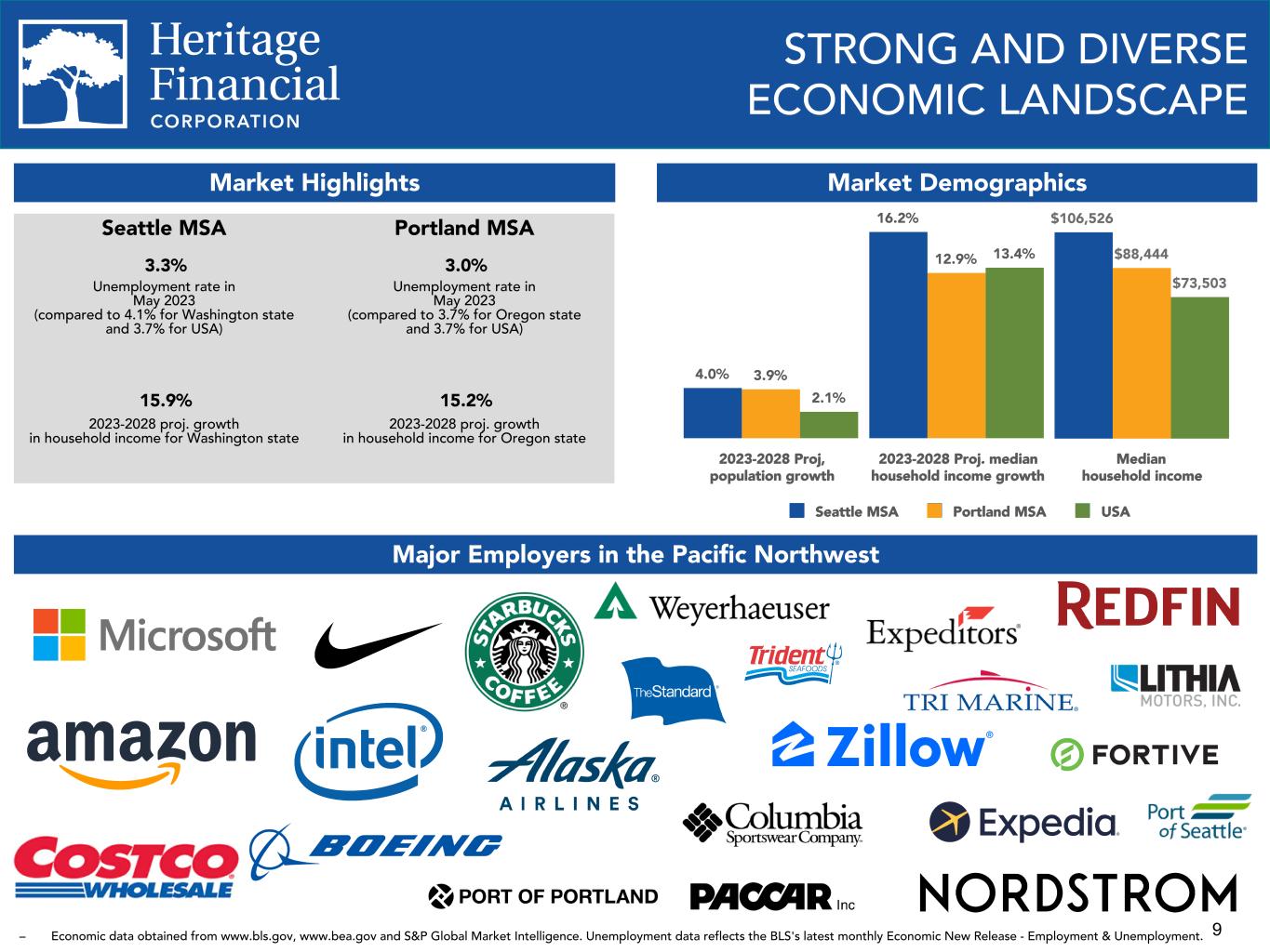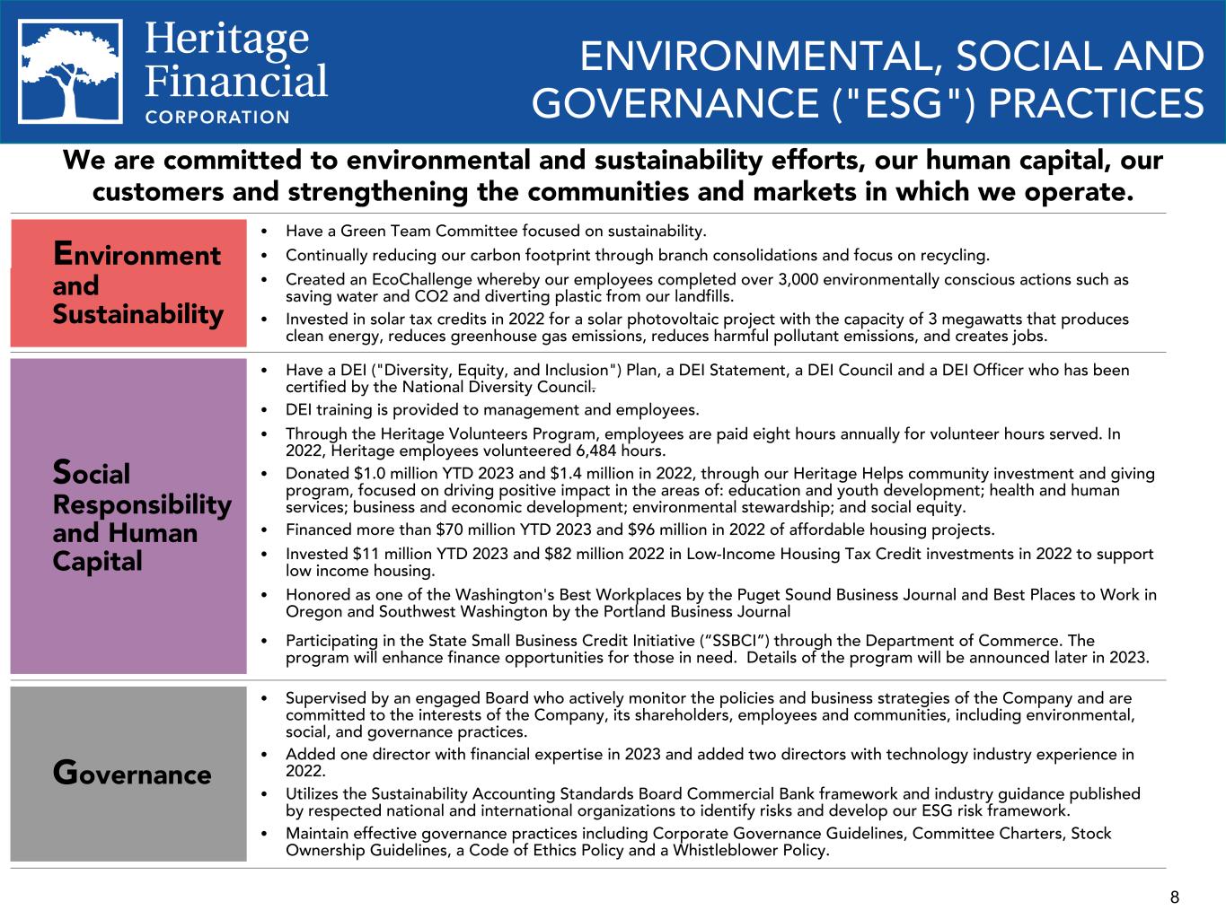 8 ENVIRONMENTAL, SOCIAL AND GOVERNANCE ("ESG") PRACTICES We are committed to environmental and sustainability efforts, our human capital, our customers and strengthening the communities and markets in which we operate. Environment and Sustainability Ÿ Have a Green Team Committee focused on sustainability. Ÿ Continually reducing our carbon footprint through branch consolidations and focus on recycling. Ÿ Created an EcoChallenge whereby our employees completed over 3,000 environmentally conscious actions such as saving water and CO2 and diverting plastic from our landfills. Ÿ Invested in solar tax credits in 2022 for a solar photovoltaic project with the capacity of 3 megawatts that produces clean energy, reduces greenhouse gas emissions, reduces harmful pollutant emissions, and creates jobs. Social Responsibility and Human Capital Ÿ Have a DEI ("Diversity, Equity, and Inclusion") Plan, a DEI Statement, a DEI Council and a DEI Officer who has been certified by the National Diversity Council. Ÿ DEI training is provided to management and employees. Ÿ Through the Heritage Volunteers Program, employees are paid eight hours annually for volunteer hours served. In 2022, Heritage employees volunteered 6,484 hours. Ÿ Donated $1.0 million YTD 2023 and $1.4 million in 2022, through our Heritage Helps community investment and giving program, focused on driving positive impact in the areas of: education and youth development; health and human services; business and economic development; environmental stewardship; and social equity. Ÿ Financed more than $70 million YTD 2023 and $96 million in 2022 of affordable housing projects. Ÿ Invested $11 million YTD 2023 and $82 million 2022 in Low-Income Housing Tax Credit investments in 2022 to support low income housing. Ÿ Honored as one of the Washington's Best Workplaces by the Puget Sound Business Journal and Best Places to Work in Oregon and Southwest Washington by the Portland Business Journal Ÿ Participating in the State Small Business Credit Initiative (“SSBCI”) through the Department of Commerce. The program will enhance finance opportunities for those in need. Details of the program will be announced later in 2023. Governance Ÿ Supervised by an engaged Board who actively monitor the policies and business strategies of the Company and are committed to the interests of the Company, its shareholders, employees and communities, including environmental, social, and governance practices. Ÿ Added one director with financial expertise in 2023 and added two directors with technology industry experience in 2022. Ÿ Utilizes the Sustainability Accounting Standards Board Commercial Bank framework and industry guidance published by respected national and international organizations to identify risks and develop our ESG risk framework. Ÿ Maintain effective governance practices including Corporate Governance Guidelines, Committee Charters, Stock Ownership Guidelines, a Code of Ethics Policy and a Whistleblower Policy.