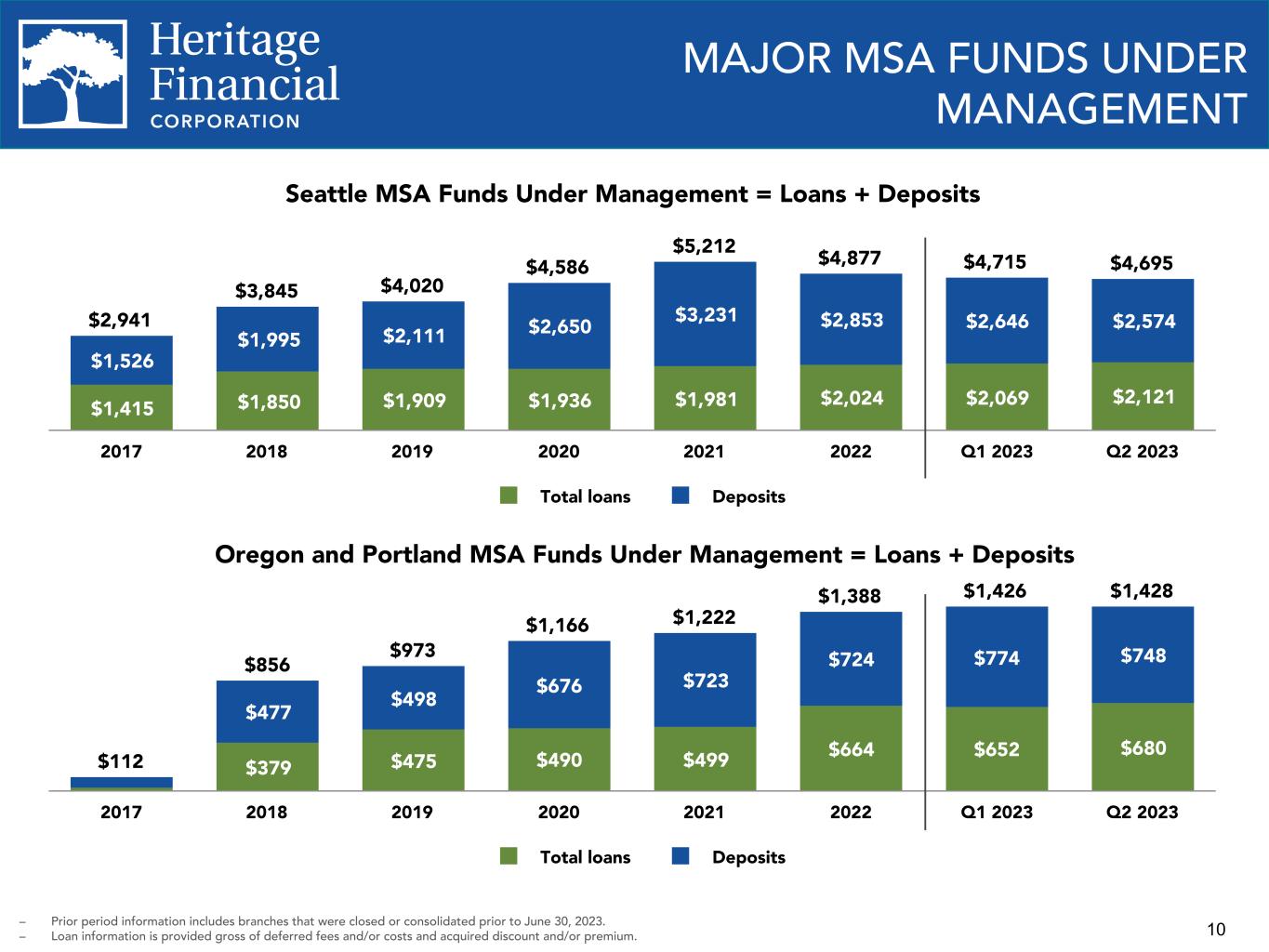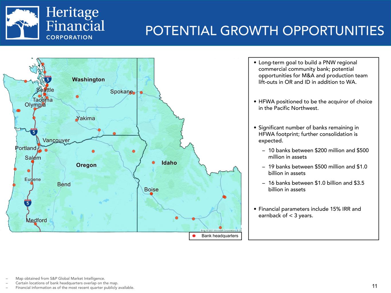 10 MAJOR MSA FUNDS UNDER MANAGEMENT Seattle MSA Funds Under Management = Loans + Deposits $2,941 $3,845 $4,020 $4,586 $5,212 $4,877 $4,715 $4,695 $1,415 $1,850 $1,909 $1,936 $1,981 $2,024 $2,069 $2,121 $1,526 $1,995 $2,111 $2,650 $3,231 $2,853 $2,646 $2,574 Total loans Deposits 2017 2018 2019 2020 2021 2022 Q1 2023 Q2 2023 – Prior period information includes branches that were closed or consolidated prior to June 30, 2023. – Loan information is provided gross of deferred fees and/or costs and acquired discount and/or premium. Oregon and Portland MSA Funds Under Management = Loans + Deposits $112 $856 $973 $1,166 $1,222 $1,388 $1,426 $1,428 $379 $475 $490 $499 $664 $652 $680 $477 $498 $676 $723 $724 $774 $748 Total loans Deposits 2017 2018 2019 2020 2021 2022 Q1 2023 Q2 2023