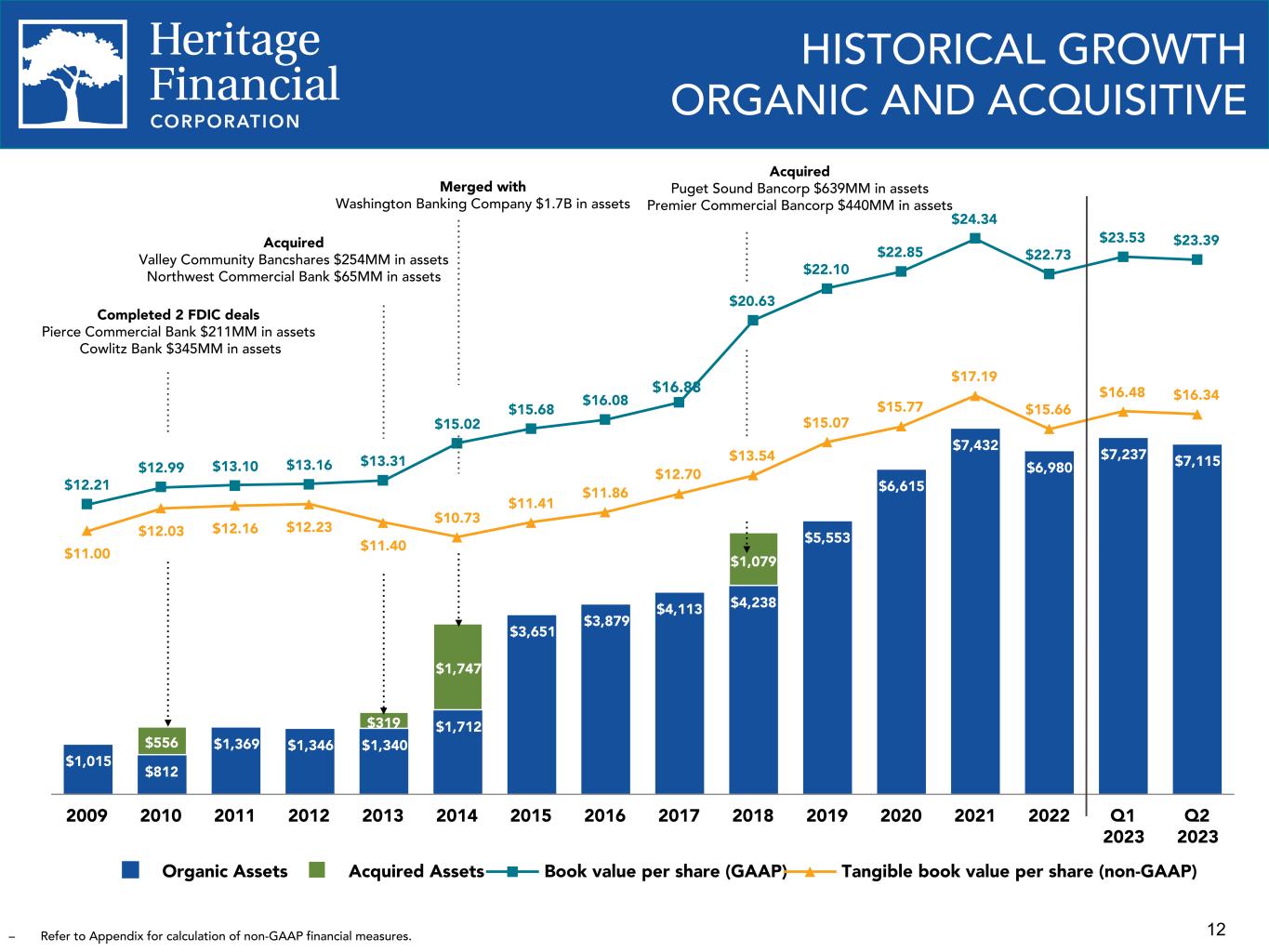 11 POTENTIAL GROWTH OPPORTUNITIES – Map obtained from S&P Global Market Intelligence. – Certain locations of bank headquarters overlap on the map. – Financial information as of the most recent quarter publicly available. • Long-term goal to build a PNW regional commercial community bank; potential opportunities for M&A and production team lift-outs in OR and ID in addition to WA. • HFWA positioned to be the acquiror of choice in the Pacific Northwest. • Significant number of banks remaining in HFWA footprint; further consolidation is expected. – 10 banks between $200 million and $500 million in assets – 19 banks between $500 million and $1.0 billion in assets – 16 banks between $1.0 billion and $3.5 billion in assets • Financial parameters include 15% IRR and earnback of < 3 years. Bank headquarters
