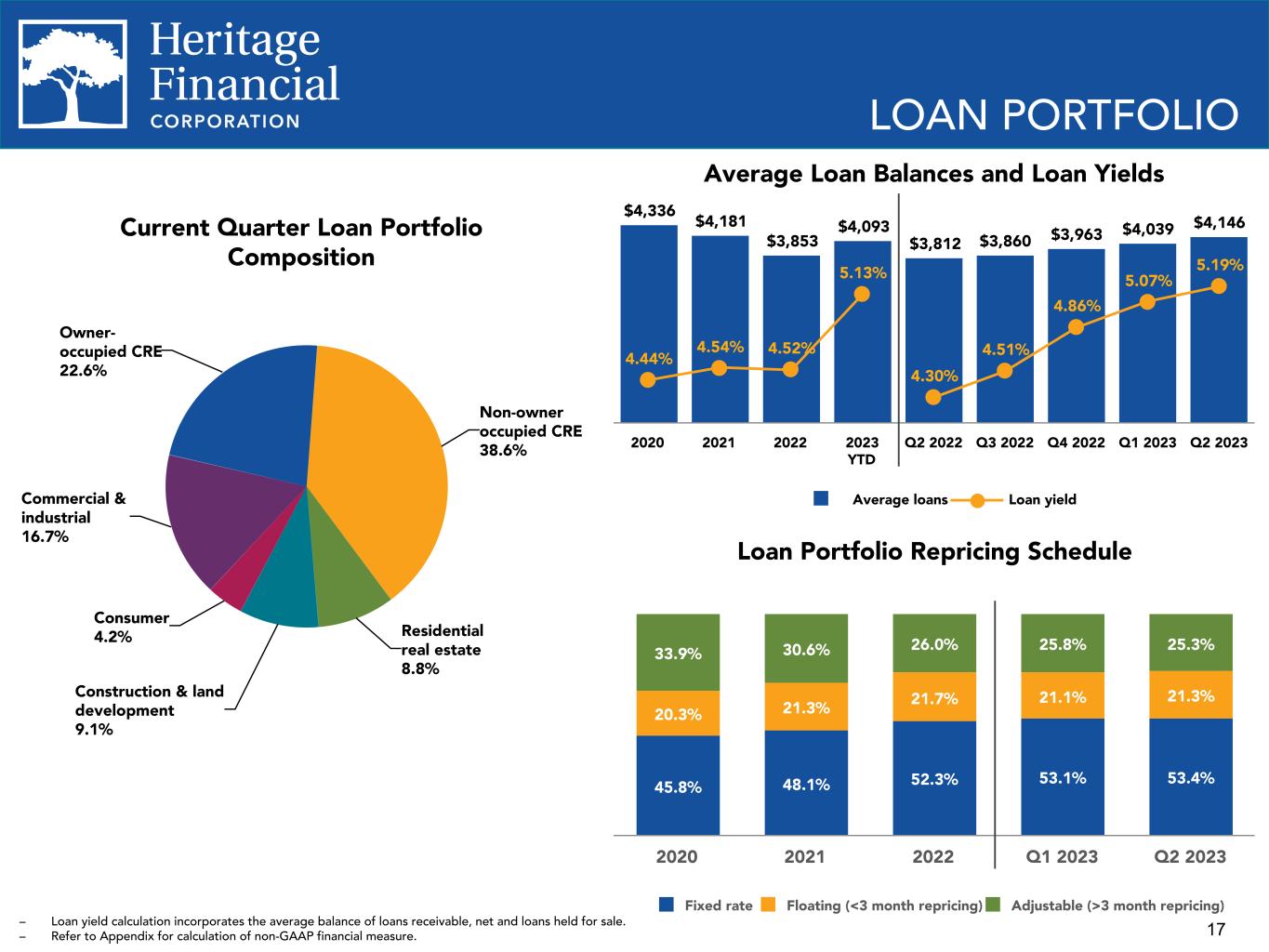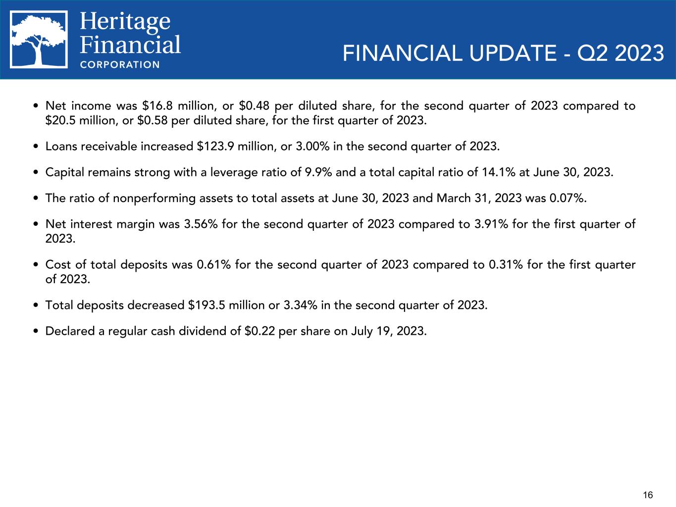 16 FINANCIAL UPDATE - Q2 2023 • Net income was $16.8 million, or $0.48 per diluted share, for the second quarter of 2023 compared to $20.5 million, or $0.58 per diluted share, for the first quarter of 2023. • Loans receivable increased $123.9 million, or 3.00% in the second quarter of 2023. • Capital remains strong with a leverage ratio of 9.9% and a total capital ratio of 14.1% at June 30, 2023. • The ratio of nonperforming assets to total assets at June 30, 2023 and March 31, 2023 was 0.07%. • Net interest margin was 3.56% for the second quarter of 2023 compared to 3.91% for the first quarter of 2023. • Cost of total deposits was 0.61% for the second quarter of 2023 compared to 0.31% for the first quarter of 2023. • Total deposits decreased $193.5 million or 3.34% in the second quarter of 2023. • Declared a regular cash dividend of $0.22 per share on July 19, 2023.