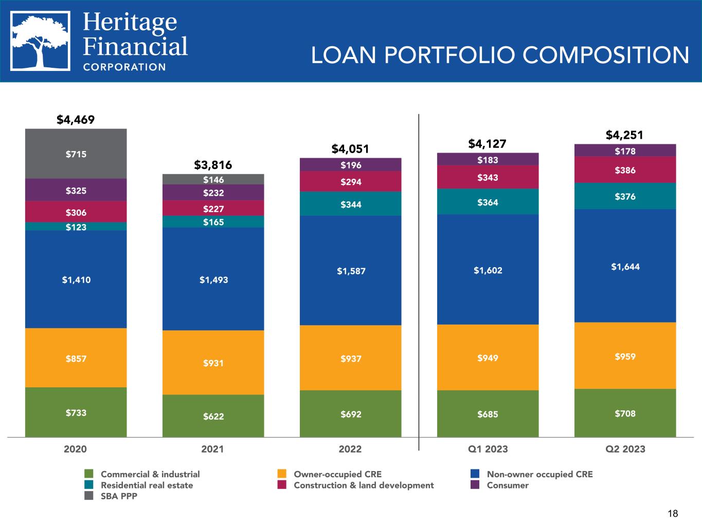 17 Average Loan Balances and Loan Yields $4,336 $4,181 $3,853 $4,093 $3,812 $3,860 $3,963 $4,039 $4,146 4.44% 4.54% 4.52% 5.13% 4.30% 4.51% 4.86% 5.07% 5.19% Average loans Loan yield 2020 2021 2022 2023 YTD Q2 2022 Q3 2022 Q4 2022 Q1 2023 Q2 2023 Commercial & industrial 16.7% Owner- occupied CRE 22.6% Non-owner occupied CRE 38.6% Residential real estate 8.8% Construction & land development 9.1% Consumer 4.2% LOAN PORTFOLIO Current Quarter Loan Portfolio Composition Loan Portfolio Repricing Schedule 33.9% 30.6% 26.0% 25.8% 25.3% 20.3% 21.3% 21.7% 21.1% 21.3% 45.8% 48.1% 52.3% 53.1% 53.4% Fixed rate Floating (<3 month repricing) Adjustable (>3 month repricing) 2020 2021 2022 Q1 2023 Q2 2023 – Loan yield calculation incorporates the average balance of loans receivable, net and loans held for sale. – Refer to Appendix for calculation of non-GAAP financial measure.