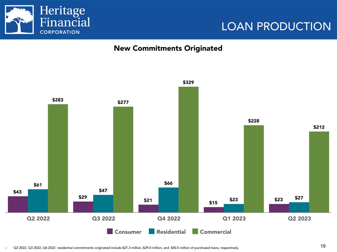 18 LOAN PORTFOLIO COMPOSITION $4,469 $3,816 $4,051 $4,127 $4,251 $733 $622 $692 $685 $708 $857 $931 $937 $949 $959 $1,410 $1,493 $1,587 $1,602 $1,644 $123 $165 $344 $364 $376 $306 $227 $294 $343 $386 $325 $232 $196 $183 $178$715 $146 Commercial & industrial Owner-occupied CRE Non-owner occupied CRE Residential real estate Construction & land development Consumer SBA PPP 2020 2021 2022 Q1 2023 Q2 2023