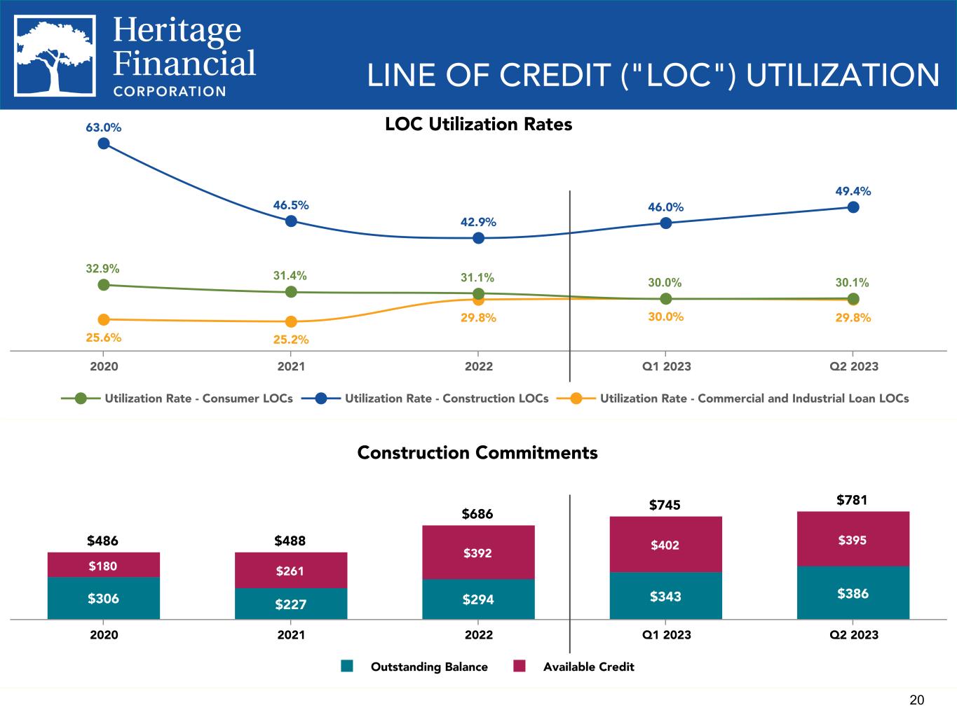 19 New Commitments Originated $43 $29 $21 $15 $23 $61 $47 $66 $23 $27 $283 $277 $329 $228 $212 Consumer Residential Commercial Q2 2022 Q3 2022 Q4 2022 Q1 2023 Q2 2023 LOAN PRODUCTION – Q2 2022, Q3 2022, Q4 2022 residential commitments originated include $27.3 million, $29.0 million, and $40.5 million of purchased loans, respectively.