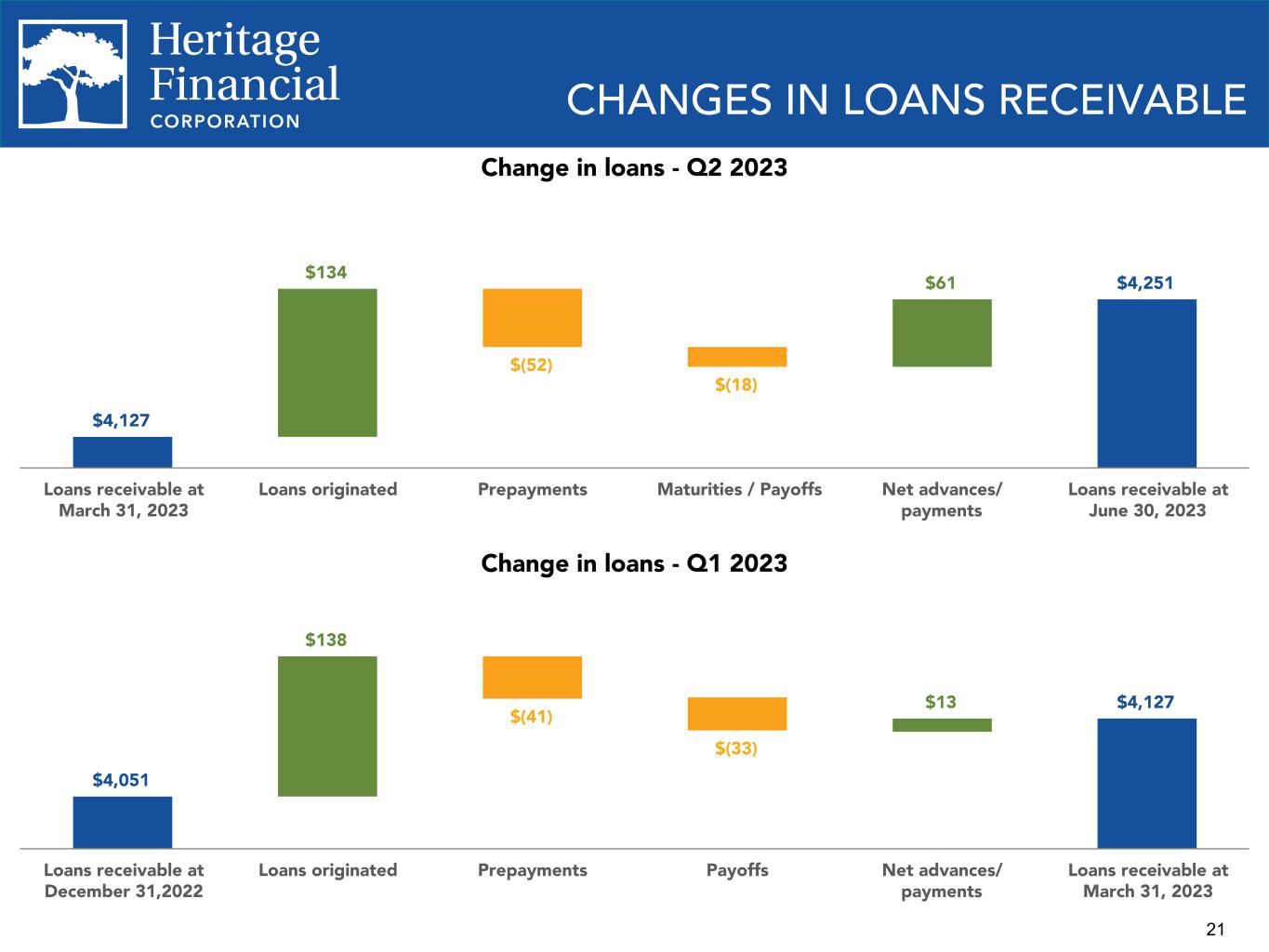 21 CHANGES IN LOANS RECEIVABLE $4,127 $134 $(52) $(18) $61 $4,251 Loans receivable at March 31, 2023 Loans originated Prepayments Maturities / Payoffs Net advances/ payments Loans receivable at June 30, 2023 $4,051 $138 $(41) $(33) $13 $4,127 Loans receivable at December 31,2022 Loans originated Prepayments Payoffs Net advances/ payments Loans receivable at March 31, 2023 Change in loans - Q2 2023 Change in loans - Q1 2023