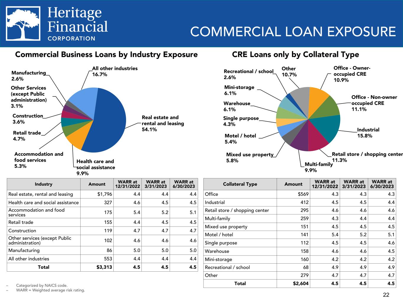 22 COMMERCIAL LOAN EXPOSURE Commercial Business Loans by Industry Exposure Industry Amount WARR at 12/31/2022 WARR at 3/31/2023 WARR at 6/30/2023 Real estate, rental and leasing $1,796 4.4 4.4 4.4 Health care and social assistance 327 4.6 4.5 4.5 Accommodation and food services 175 5.4 5.2 5.1 Retail trade 155 4.4 4.5 4.5 Construction 119 4.7 4.7 4.7 Other services (except Public administration) 102 4.6 4.6 4.6 Manufacturing 86 5.0 5.0 5.0 All other industries 553 4.4 4.4 4.4 Total $3,313 4.5 4.5 4.5 CRE Loans only by Collateral Type Collateral Type Amount WARR at 12/31/2022 WARR at 3/31/2023 WARR at 6/30/2023 Office $569 4.3 4.3 4.3 Industrial 412 4.5 4.5 4.4 Retail store / shopping center 295 4.6 4.6 4.6 Multi-family 259 4.3 4.4 4.4 Mixed use property 151 4.5 4.5 4.5 Motel / hotel 141 5.4 5.2 5.1 Single purpose 112 4.5 4.5 4.6 Warehouse 158 4.6 4.6 4.5 Mini-storage 160 4.2 4.2 4.2 Recreational / school 68 4.9 4.9 4.9 Other 279 4.7 4.7 4.7 Total $2,604 4.5 4.5 4.5– Categorized by NAICS code. – WARR = Weighted average risk rating. Office - Owner- occupied CRE 10.9% Office - Non-owner occupied CRE 11.1% Industrial 15.8% Retail store / shopping center 11.3% Multi-family 9.9% Mixed use property 5.8% Motel / hotel 5.4% Single purpose 4.3% Warehouse 6.1% Mini-storage 6.1% Recreational / school 2.6% Other 10.7% Real estate and rental and leasing 54.1% Health care and social assistance 9.9% Accommodation and food services 5.3% Retail trade 4.7% Construction 3.6% Other Services (except Public administration) 3.1% Manufacturing 2.6% All other industries 16.7%