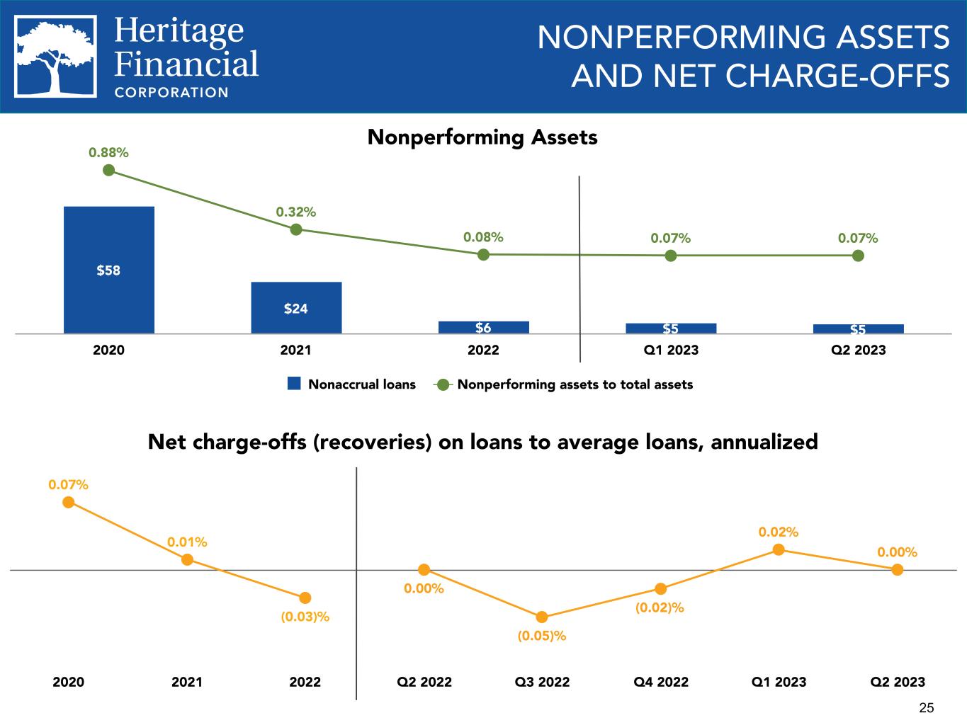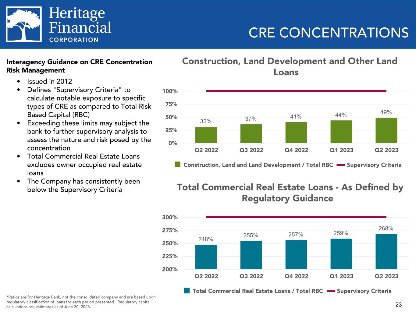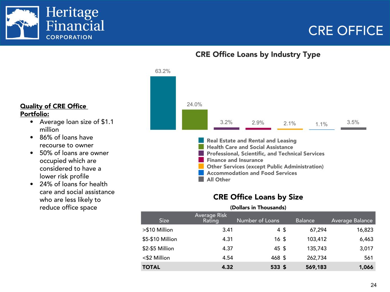 23 CRE CONCENTRATIONS Total Commercial Real Estate Loans - As Defined by Regulatory Guidance 248% 255% 257% 259% 268% Total Commercial Real Estate Loans / Total RBC Supervisory Criteria Q2 2022 Q3 2022 Q4 2022 Q1 2023 Q2 2023 200% 225% 250% 275% 300% Construction, Land Development and Other Land Loans 32% 37% 41% 44% 49% Construction, Land and Land Development / Total RBC Supervisory Criteria Q2 2022 Q3 2022 Q4 2022 Q1 2023 Q2 2023 0% 25% 50% 75% 100% Interagency Guidance on CRE Concentration Risk Management • Issued in 2012 • Defines "Supervisory Criteria" to calculate notable exposure to specific types of CRE as compared to Total Risk Based Capital (RBC) • Exceeding these limits may subject the bank to further supervisory analysis to assess the nature and risk posed by the concentration • Total Commercial Real Estate Loans excludes owner occupied real estate loans • The Company has consistently been below the Supervisory Criteria *Ratios are for Heritage Bank, not the consolidated company and are based upon regulatory classification of loans for each period presented. Regulatory capital calculations are estimates as of June 30, 2023.