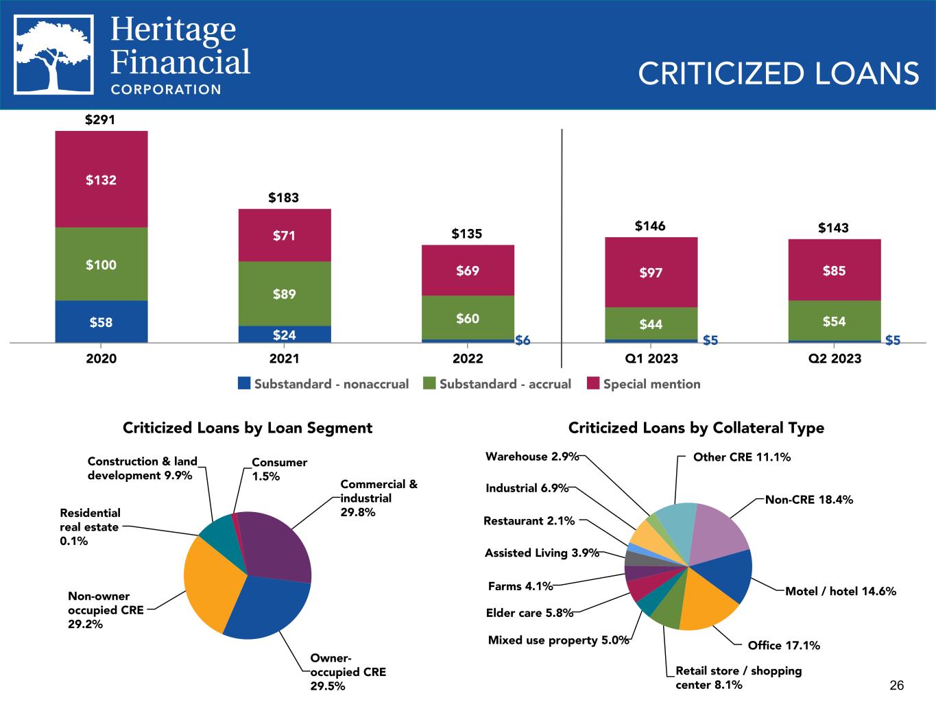 25 Net charge-offs (recoveries) on loans to average loans, annualized 0.07% 0.01% (0.03)% 0.00% (0.05)% (0.02)% 0.02% 0.00% 2020 2021 2022 Q2 2022 Q3 2022 Q4 2022 Q1 2023 Q2 2023 Nonperforming Assets $58 $24 $6 $5 $5 Nonaccrual loans Nonperforming assets to total assets 2020 2021 2022 Q1 2023 Q2 2023 0.88% 0.32% 0.08% 0.07% 0.07% NONPERFORMING ASSETS AND NET CHARGE-OFFS