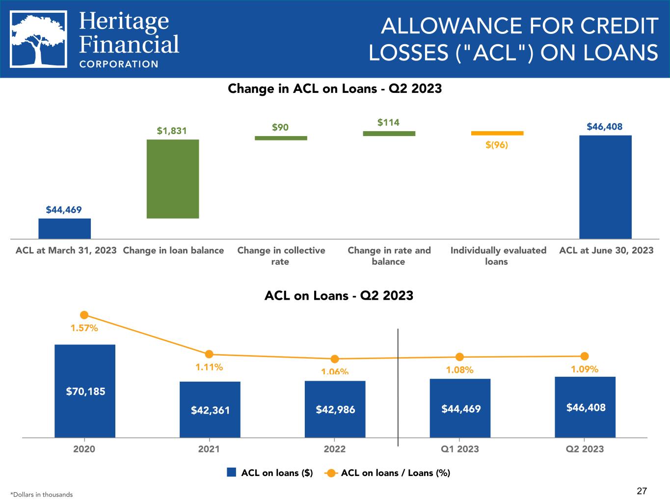 26 CRITICIZED LOANS $291 $183 $135 $146 $143 $58 $24 $100 $89 $60 $44 $54 $132 $71 $69 $97 $85 Substandard - nonaccrual Substandard - accrual Special mention 2020 2021 2022 Q1 2023 Q2 2023 Criticized Loans by Collateral Type Commercial & industrial 29.8% Owner- occupied CRE 29.5% Non-owner occupied CRE 29.2% Residential real estate 0.1% Construction & land development 9.9% Consumer 1.5% Criticized Loans by Loan Segment Motel / hotel 14.6% Office 17.1% Retail store / shopping center 8.1% Mixed use property 5.0% Elder care 5.8% Farms 4.1% Assisted Living 3.9% Restaurant 2.1% Industrial 6.9% Warehouse 2.9% Other CRE 11.1% Non-CRE 18.4% $5$6 $5