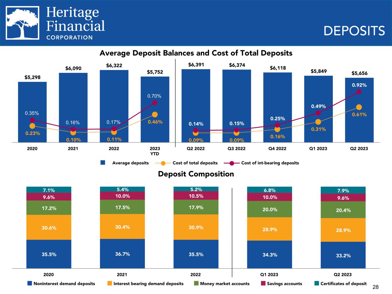 28 $5,298 $6,090 $6,322 $5,752 $6,391 $6,374 $6,118 $5,849 $5,656 0.23% 0.10% 0.11% 0.46% 0.09% 0.09% 0.16% 0.31% 0.61% 0.14% 0.15% 0.25% 0.49% 0.92% 0.35% 0.16% 0.17% 0.70% Average deposits Cost of total deposits Cost of int-bearing deposits 2020 2021 2022 2023 YTD Q2 2022 Q3 2022 Q4 2022 Q1 2023 Q2 2023 Deposit Composition DEPOSITS Average Deposit Balances and Cost of Total Deposits 35.5% 36.7% 35.5% 34.3% 33.2% 30.6% 30.4% 30.9% 28.9% 28.9% 17.2% 17.5% 17.9% 20.0% 20.4% 9.6% 10.0% 10.5% 10.0% 9.6% 7.1% 5.4% 5.2% 6.8% 7.9% Noninterest demand deposits Interest bearing demand deposits Money market accounts Savings accounts Certificates of deposit 2020 2021 2022 Q1 2023 Q2 2023