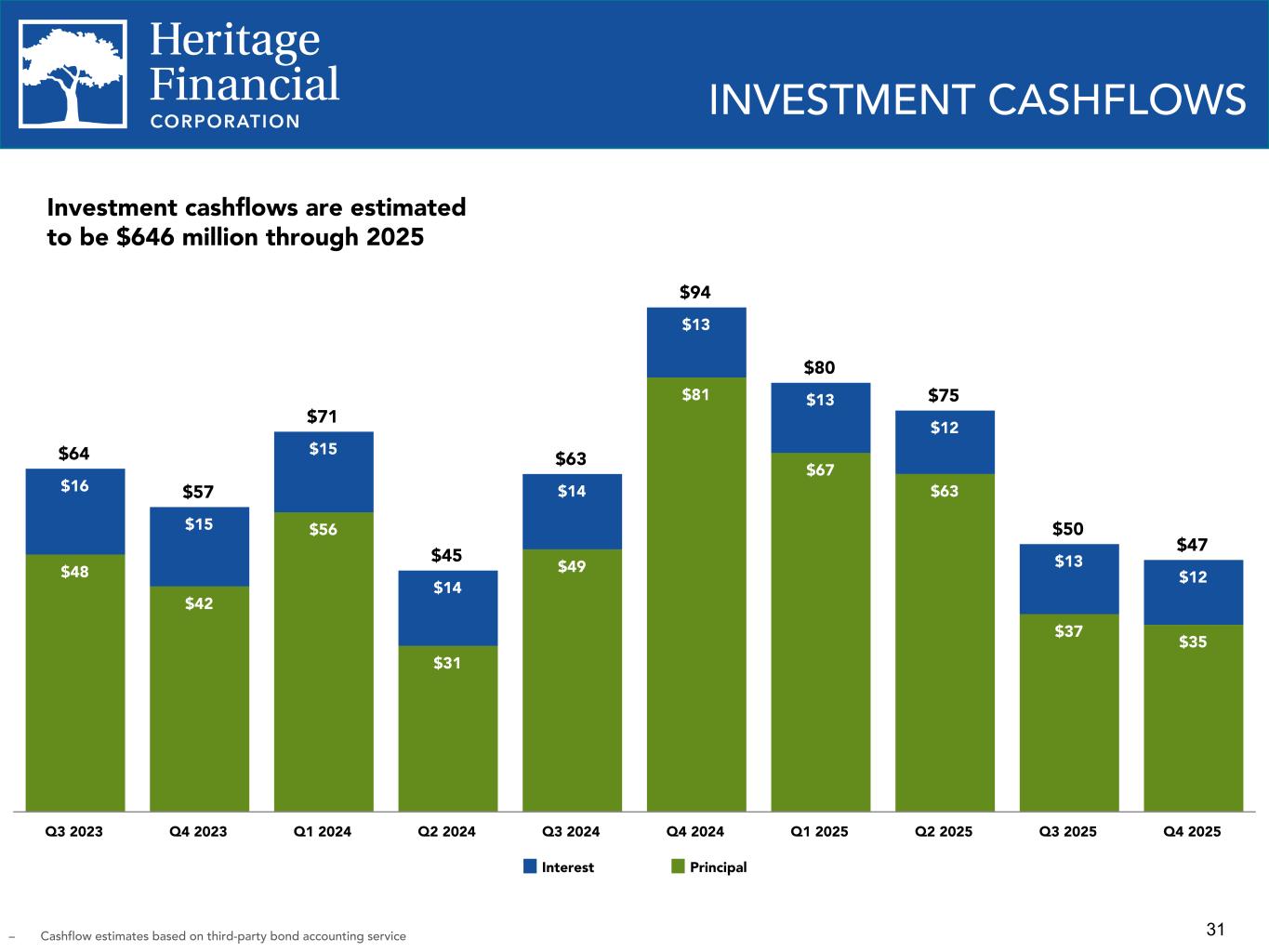 31 $64 $57 $71 $45 $63 $94 $80 $75 $50 $47 $48 $42 $56 $31 $49 $81 $67 $63 $37 $35 $16 $15 $15 $14 $14 $13 $13 $12 $13 $12 Interest Principal Q3 2023 Q4 2023 Q1 2024 Q2 2024 Q3 2024 Q4 2024 Q1 2025 Q2 2025 Q3 2025 Q4 2025 INVESTMENT CASHFLOWS Investment cashflows are estimated to be $646 million through 2025 – Cashflow estimates based on third-party bond accounting service Look in IP or email