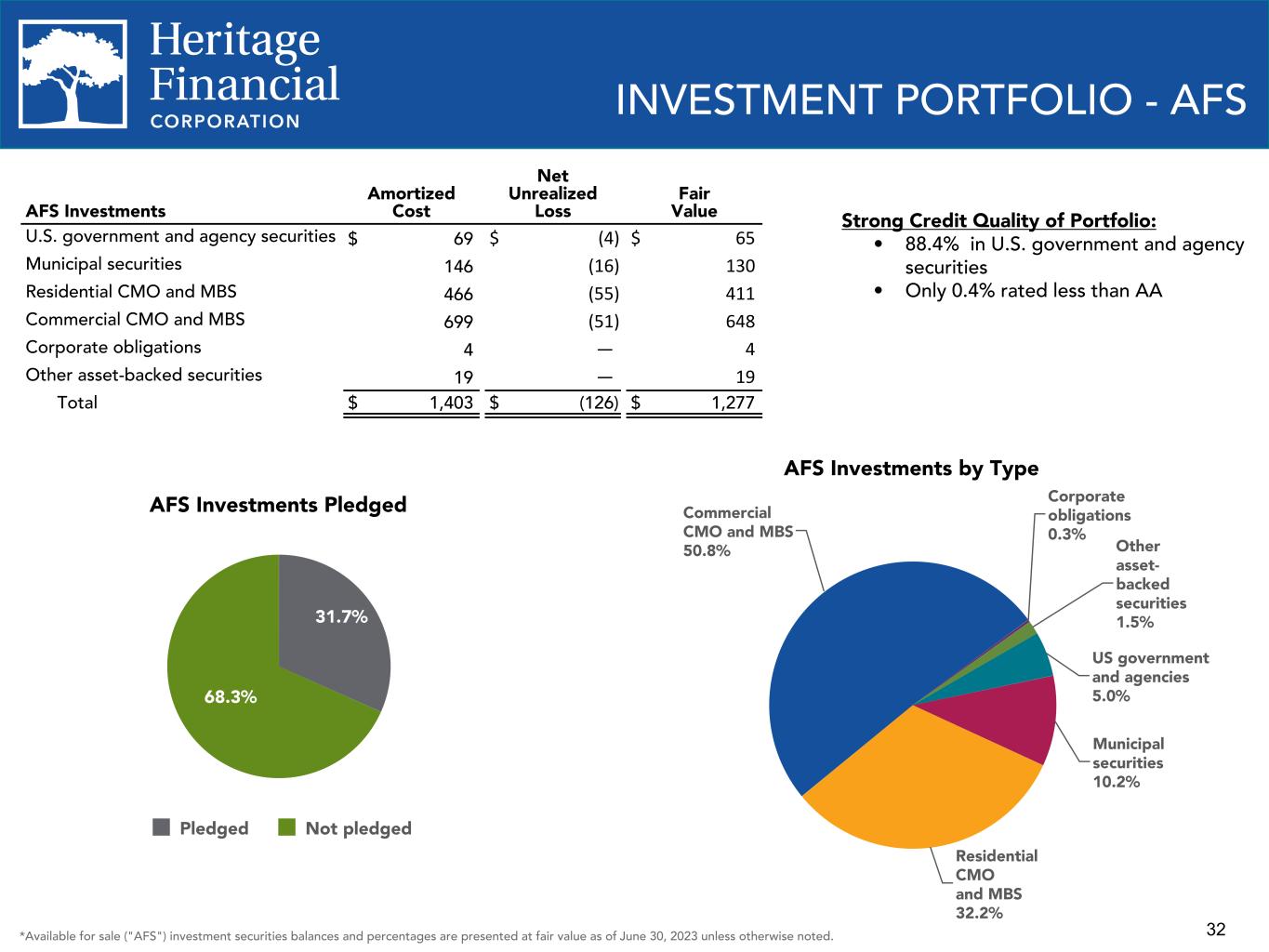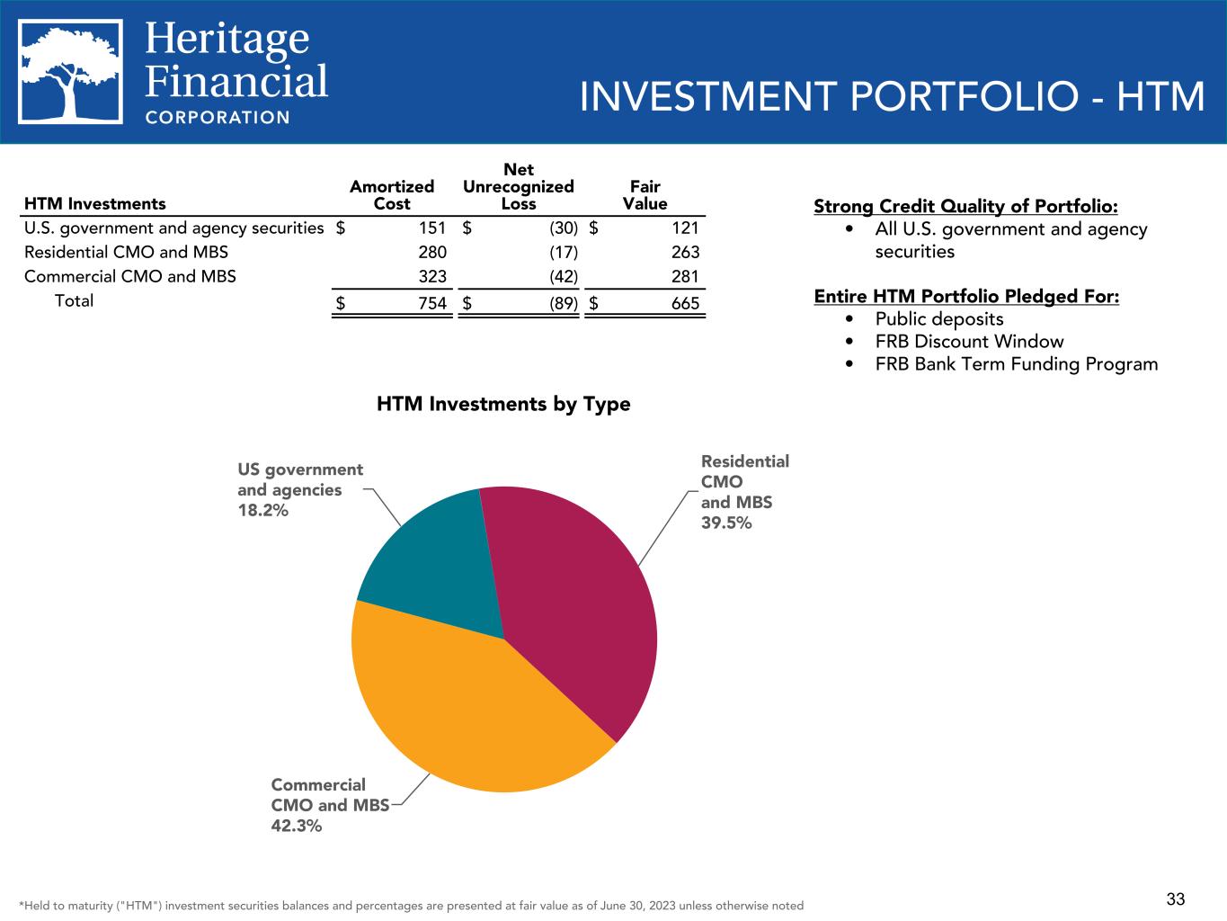 32 INVESTMENT PORTFOLIO - AFS AFS Investments by Type US government and agencies 5.0% Municipal securities 10.2% Residential CMO and MBS 32.2% Commercial CMO and MBS 50.8% Corporate obligations 0.3% Other asset- backed securities 1.5% *Available for sale ("AFS") investment securities balances and percentages are presented at fair value as of June 30, 2023 unless otherwise noted. Strong Credit Quality of Portfolio: • 88.4% in U.S. government and agency securities • Only 0.4% rated less than AA AFS Investments Amortized Cost Net Unrealized Loss Fair Value U.S. government and agency securities $ 69 $ (4) $ 65 Municipal securities 146 (16) 130 Residential CMO and MBS 466 (55) 411 Commercial CMO and MBS 699 (51) 648 Corporate obligations 4 — 4 Other asset-backed securities 19 — 19 Total $ 1,403 $ (126) $ 1,277 AFS Investments Pledged 31.7% 68.3% Pledged Not pledged