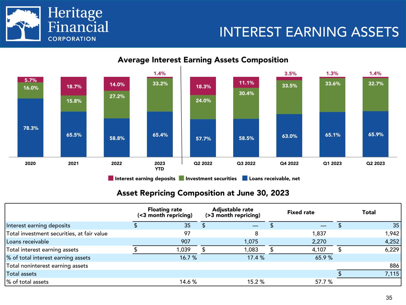 35 Asset Repricing Composition at June 30, 2023 Floating rate (<3 month repricing) Adjustable rate (>3 month repricing) Fixed rate Total Interest earning deposits $ 35 $ — $ — $ 35 Total investment securities, at fair value 97 8 1,837 1,942 Loans receivable 907 1,075 2,270 4,252 Total interest earning assets $ 1,039 $ 1,083 $ 4,107 $ 6,229 % of total interest earning assets 16.7 % 17.4 % 65.9 % Total noninterest earning assets 886 Total assets $ 7,115 % of total assets 14.6 % 15.2 % 57.7 % INTEREST EARNING ASSETS Average Interest Earning Assets Composition 78.3% 65.5% 58.8% 65.4% 57.7% 58.5% 63.0% 65.1% 65.9% 16.0% 15.8% 27.2% 33.2% 24.0% 30.4% 33.5% 33.6% 32.7% 5.7% 18.7% 14.0% 1.4% 18.3% 11.1% 1.3% 1.4% Interest earning deposits Investment securities Loans receivable, net 2020 2021 2022 2023 YTD Q2 2022 Q3 2022 Q4 2022 Q1 2023 Q2 2023 3.5%