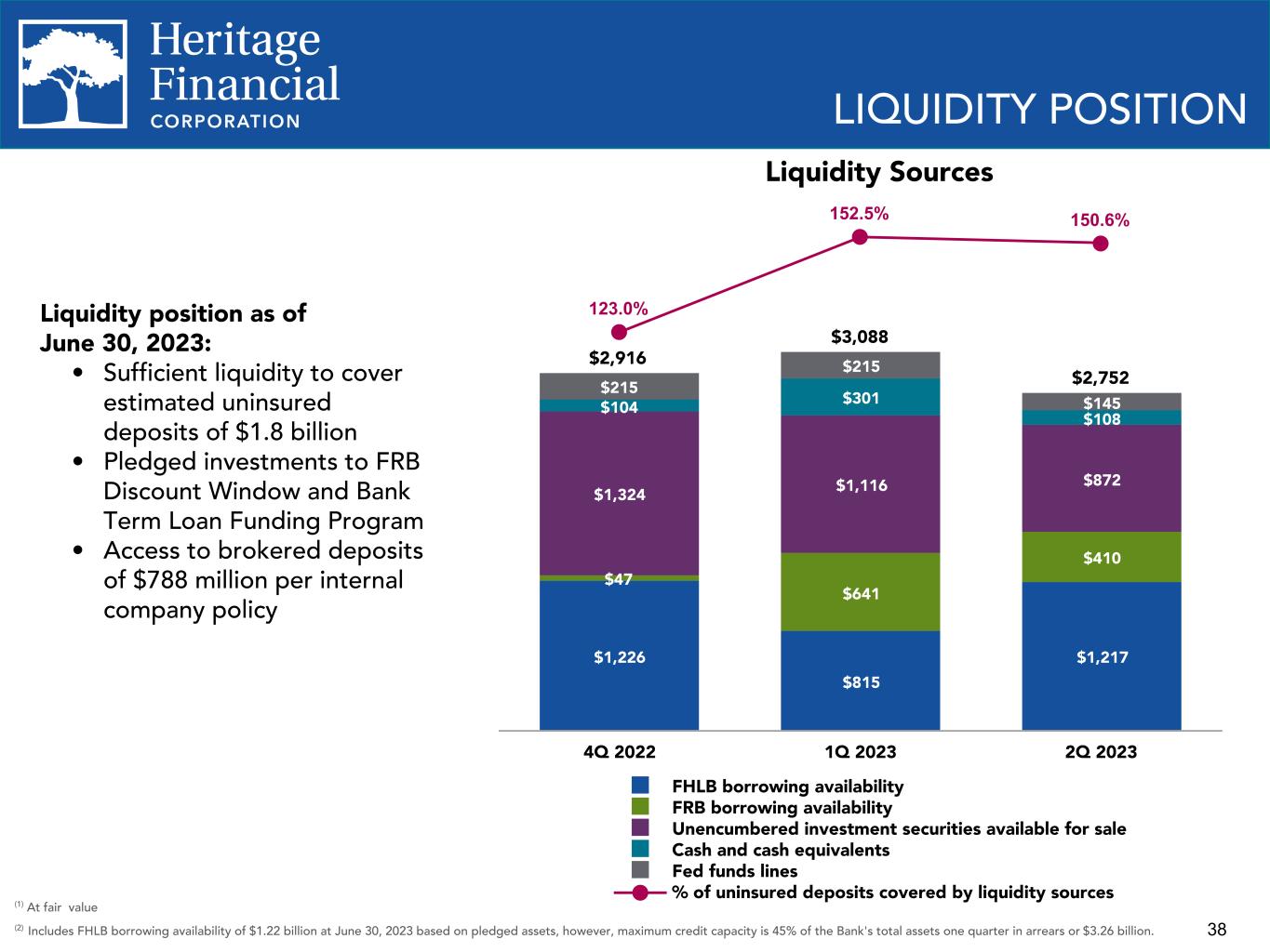 37 Total Risk Based Capital 14% 14.8% 14.0% 14.1% 14.1% 10.0% 10.0% 10.0% 10.0% 10.0% 4.0% 4.8% 4.0% 4.1% 4.1% Well-capitalized Excess capital 2020 2021 2022 Q1 2023 Q2 2023 – Current quarter ratios are estimates pending completion and filing of the Company's regulatory reports. – Refer to Appendix for calculation of non-GAAP financial measures. – Well-capitalized represents FDIC well-capitalized ratio threshold for banks. The minimum capital ratio requirement for Tier 1 leverage and Total risk based capital is 4.0% and 8.0%, respectively. Tier 1 Leverage Ratio 9.0% 8.7% 9.7% 9.9% 9.9% 5.0% 5.0% 5.0% 5.0% 5.0% 4.0% 3.7% 4.7% 4.9% 4.9% Well-capitalized Excess capital 2020 2021 2022 Q1 2023 Q2 2023 CAPITAL RATIOS Equity Ratios 12.4% 11.5% 11.4% 11.4% 11.5% 8.9% 8.4% 8.2% 8.3% 8.3% Stockholders' equity to total assets (GAAP) Tangible common equity ("TCE") to tangible assets (non-GAAP) 2020 2021 2022 Q1 2023 Q2 2023