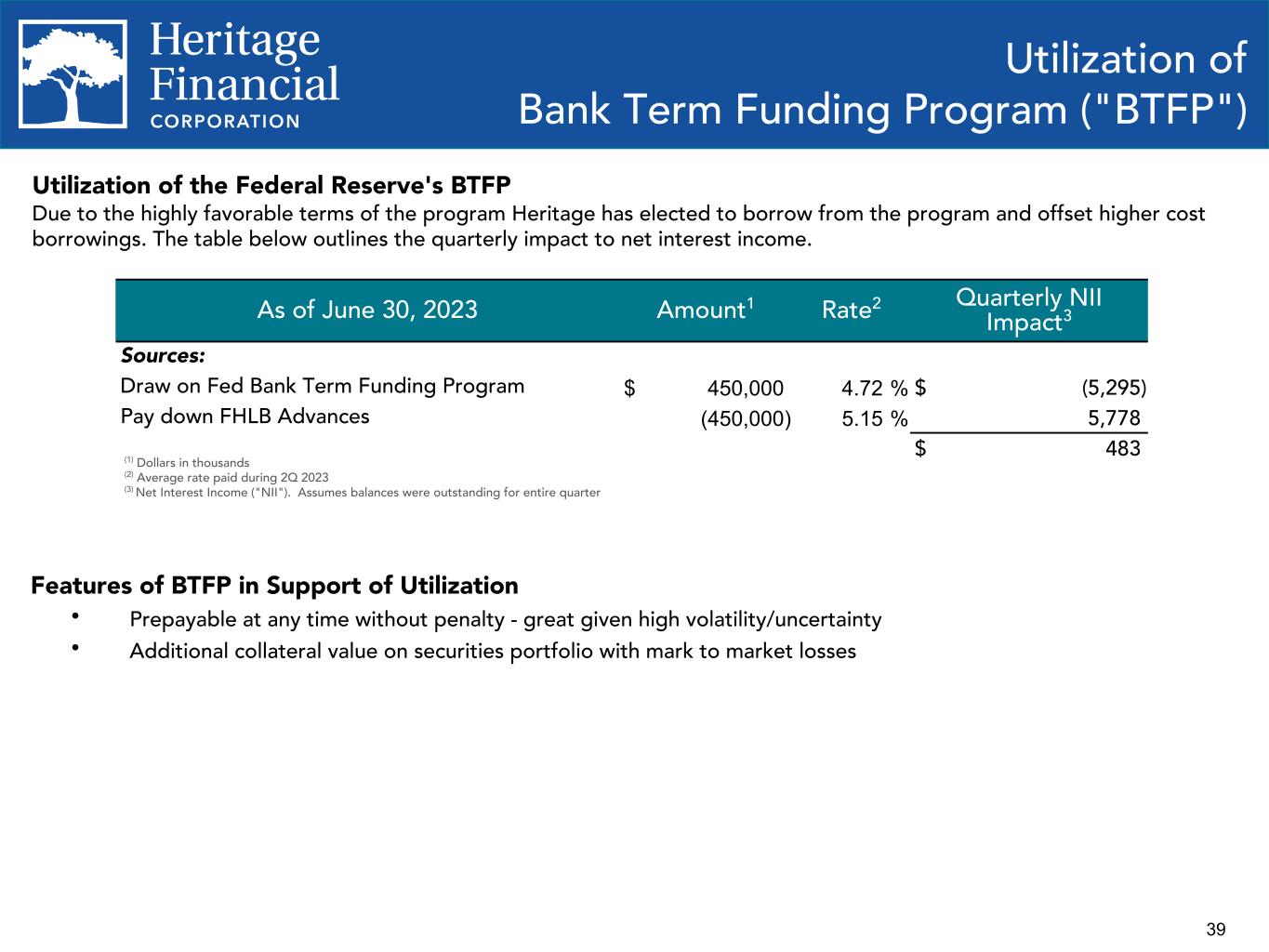 39 Utilization of Bank Term Funding Program ("BTFP") As of June 30, 2023 Amount1 Rate2 Quarterly NII Impact3 Sources: Draw on Fed Bank Term Funding Program $ 450,000 4.72 % $ (5,295) Pay down FHLB Advances (450,000) 5.15 % 5,778 $ 483 (1) Dollars in thousands (2) Average rate paid during 2Q 2023 (3) Net Interest Income ("NII"). Assumes balances were outstanding for entire quarter Utilization of the Federal Reserve's BTFP Due to the highly favorable terms of the program Heritage has elected to borrow from the program and offset higher cost borrowings. The table below outlines the quarterly impact to net interest income. Features of BTFP in Support of Utilization Ÿ Prepayable at any time without penalty - great given high volatility/uncertainty Ÿ Additional collateral value on securities portfolio with mark to market losses