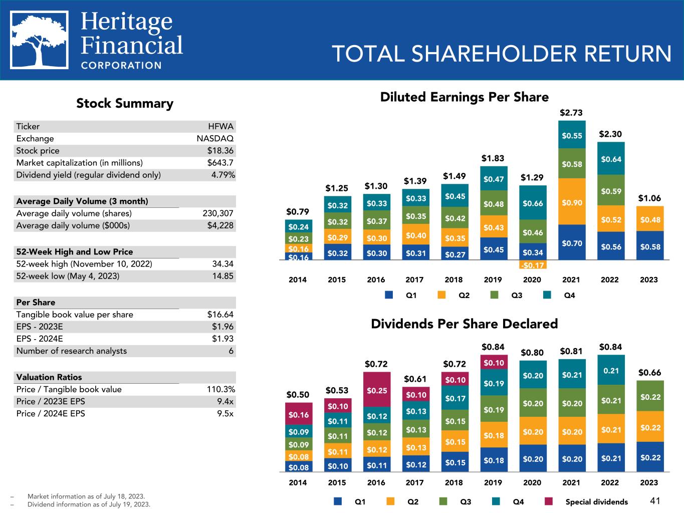 41 TOTAL SHAREHOLDER RETURN Stock Summary Ticker HFWA Exchange NASDAQ Stock price $18.36 Market capitalization (in millions) $643.7 Dividend yield (regular dividend only) 4.79% Average Daily Volume (3 month) Average daily volume (shares) 230,307 Average daily volume ($000s) $4,228 52-Week High and Low Price 52-week high (November 10, 2022) 34.34 52-week low (May 4, 2023) 14.85 Per Share Tangible book value per share $16.64 EPS - 2023E $1.96 EPS - 2024E $1.93 Number of research analysts 6 Valuation Ratios Price / Tangible book value 110.3% Price / 2023E EPS 9.4x Price / 2024E EPS 9.5x Dividends Per Share Declared $0.66 $0.50 $0.53 $0.72 $0.61 $0.72 $0.84 $0.80 $0.81 $0.84 $0.08 $0.10 $0.11 $0.12 $0.15 $0.18 $0.20 $0.20 $0.21 $0.22$0.08 $0.11 $0.12 $0.13 $0.15 $0.18 $0.20 $0.20 $0.21 $0.22 $0.09 $0.11 $0.12 $0.13 $0.15 $0.19 $0.20 $0.20 $0.21 $0.22 $0.09 $0.11 $0.12 $0.13 $0.17 $0.19 $0.20 $0.21 0.21 $0.16 $0.10 $0.25 $0.10 $0.10 $0.10 Q1 Q2 Q3 Q4 Special dividends 2014 2015 2016 2017 2018 2019 2020 2021 2022 2023 Diluted Earnings Per Share – Market information as of July 18, 2023. – Dividend information as of July 19, 2023. $1.06 $0.79 $1.25 $1.30 $1.39 $1.49 $1.83 $1.29 $2.73 $2.30 $0.16 $0.32 $0.30 $0.31 $0.27 $0.45 $0.34 $0.70 $0.56 $0.58$0.16 $0.29 $0.30 $0.40 $0.35 $0.43 -$0.17 $0.90 $0.52 $0.48 $0.23 $0.32 $0.37 $0.35 $0.42 $0.48 $0.46 $0.58 $0.59 $0.24 $0.32 $0.33 $0.33 $0.45 $0.47 $0.66 $0.55 $0.64 Q1 Q2 Q3 Q4 2014 2015 2016 2017 2018 2019 2020 2021 2022 2023 –