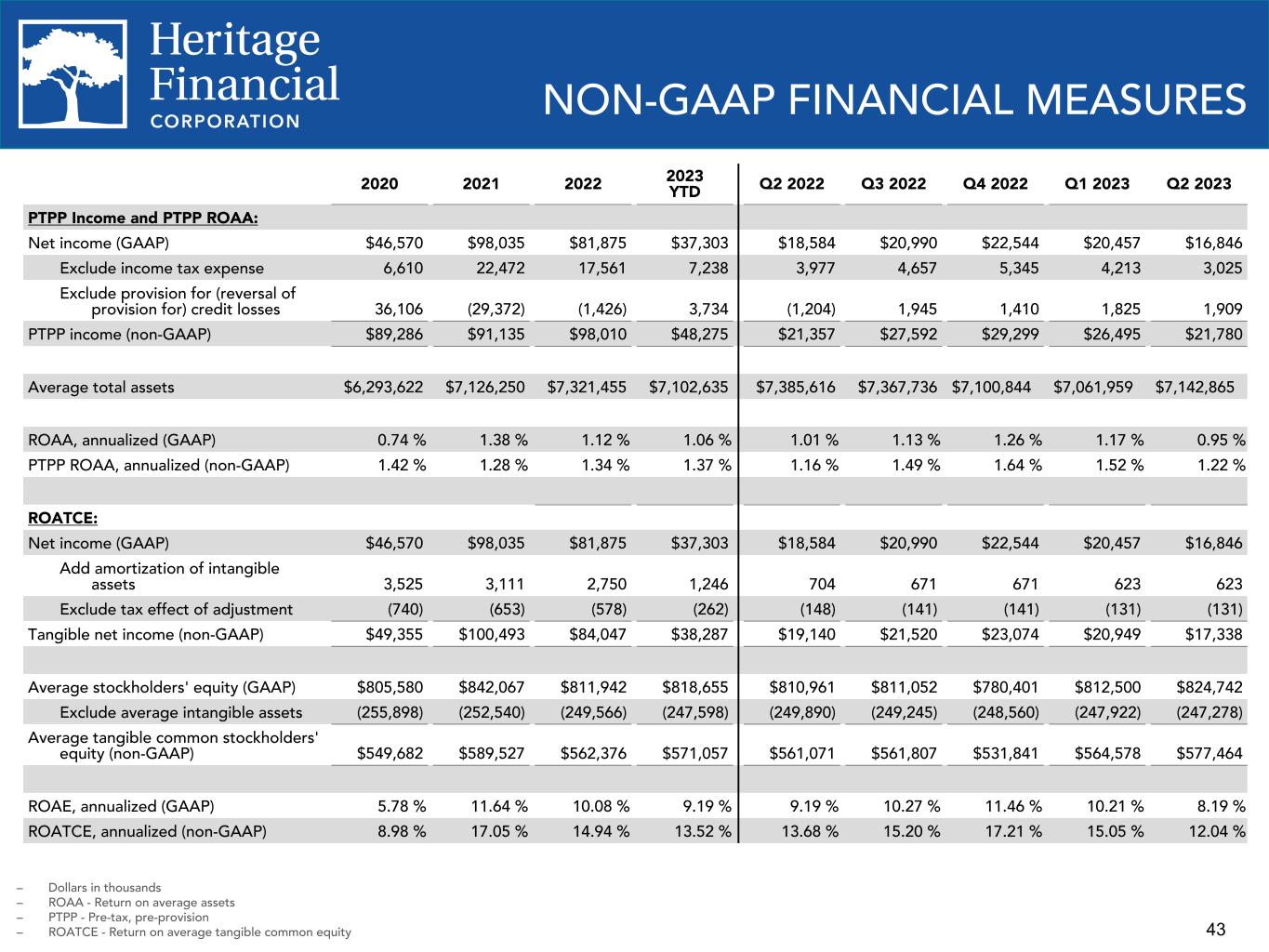 43 NON-GAAP FINANCIAL MEASURES 2020 2021 2022 2023 YTD Q2 2022 Q3 2022 Q4 2022 Q1 2023 Q2 2023 PTPP Income and PTPP ROAA: Net income (GAAP) $46,570 $98,035 $81,875 $37,303 $18,584 $20,990 $22,544 $20,457 $16,846 Exclude income tax expense 6,610 22,472 17,561 7,238 3,977 4,657 5,345 4,213 3,025 Exclude provision for (reversal of provision for) credit losses 36,106 (29,372) (1,426) 3,734 (1,204) 1,945 1,410 1,825 1,909 PTPP income (non-GAAP) $89,286 $91,135 $98,010 $48,275 $21,357 $27,592 $29,299 $26,495 $21,780 Average total assets $6,293,622 $7,126,250 $7,321,455 $7,102,635 $7,385,616 $7,367,736 $7,100,844 $7,061,959 $7,142,865 ROAA, annualized (GAAP) 0.74 % 1.38 % 1.12 % 1.06 % 1.01 % 1.13 % 1.26 % 1.17 % 0.95 % PTPP ROAA, annualized (non-GAAP) 1.42 % 1.28 % 1.34 % 1.37 % 1.16 % 1.49 % 1.64 % 1.52 % 1.22 % ROATCE: Net income (GAAP) $46,570 $98,035 $81,875 $37,303 $18,584 $20,990 $22,544 $20,457 $16,846 Add amortization of intangible assets 3,525 3,111 2,750 1,246 704 671 671 623 623 Exclude tax effect of adjustment (740) (653) (578) (262) (148) (141) (141) (131) (131) Tangible net income (non-GAAP) $49,355 $100,493 $84,047 $38,287 $19,140 $21,520 $23,074 $20,949 $17,338 Average stockholders' equity (GAAP) $805,580 $842,067 $811,942 $818,655 $810,961 $811,052 $780,401 $812,500 $824,742 Exclude average intangible assets (255,898) (252,540) (249,566) (247,598) (249,890) (249,245) (248,560) (247,922) (247,278) Average tangible common stockholders' equity (non-GAAP) $549,682 $589,527 $562,376 $571,057 $561,071 $561,807 $531,841 $564,578 $577,464 ROAE, annualized (GAAP) 5.78 % 11.64 % 10.08 % 9.19 % 9.19 % 10.27 % 11.46 % 10.21 % 8.19 % ROATCE, annualized (non-GAAP) 8.98 % 17.05 % 14.94 % 13.52 % 13.68 % 15.20 % 17.21 % 15.05 % 12.04 % – Dollars in thousands – ROAA - Return on average assets – PTPP - Pre-tax, pre-provision – ROATCE - Return on average tangible common equity