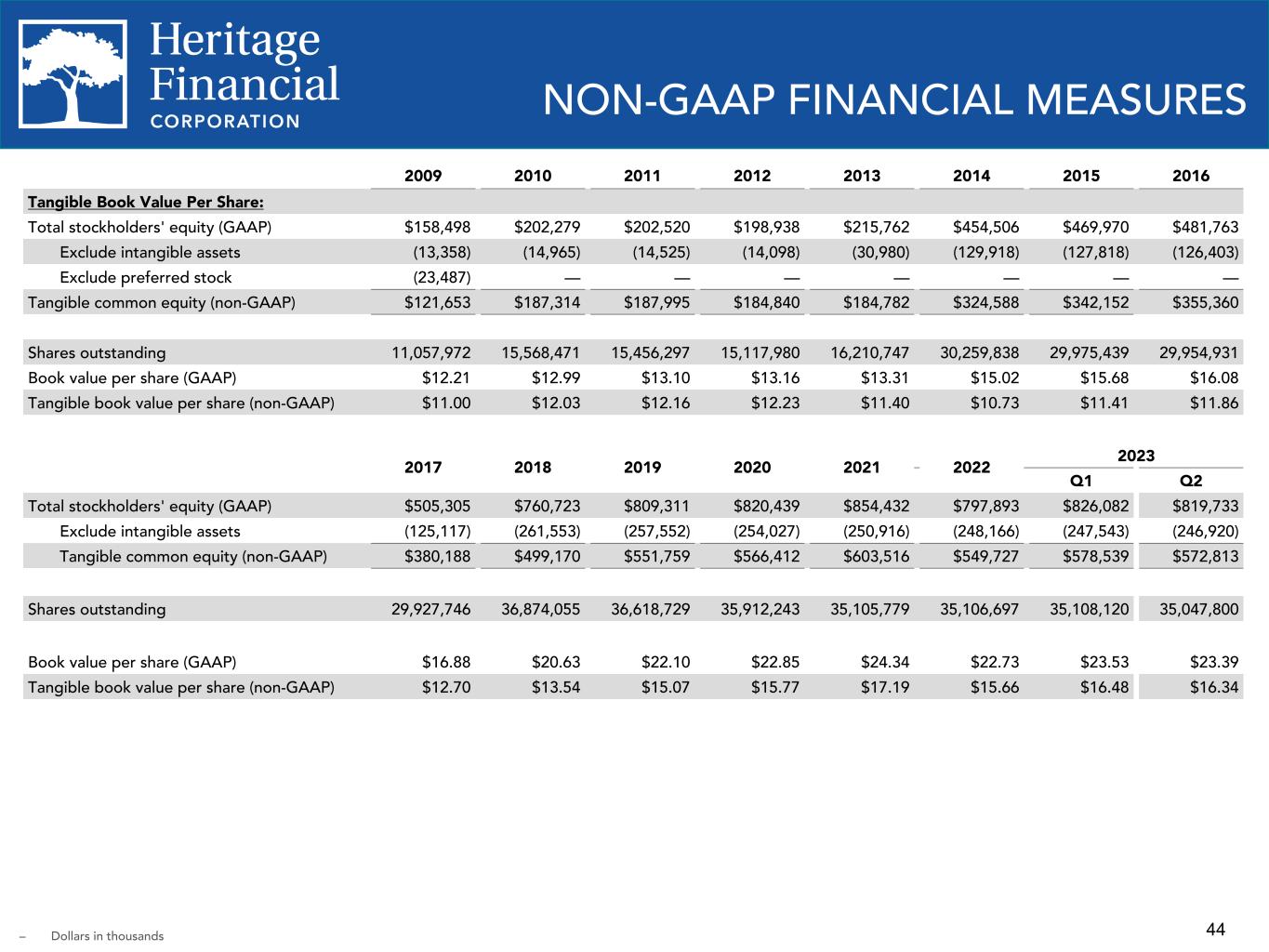44 2009 2010 2011 2012 2013 2014 2015 2016 Tangible Book Value Per Share: Total stockholders' equity (GAAP) $158,498 $202,279 $202,520 $198,938 $215,762 $454,506 $469,970 $481,763 Exclude intangible assets (13,358) (14,965) (14,525) (14,098) (30,980) (129,918) (127,818) (126,403) Exclude preferred stock (23,487) — — — — — — — Tangible common equity (non-GAAP) $121,653 $187,314 $187,995 $184,840 $184,782 $324,588 $342,152 $355,360 Shares outstanding 11,057,972 15,568,471 15,456,297 15,117,980 16,210,747 30,259,838 29,975,439 29,954,931 Book value per share (GAAP) $12.21 $12.99 $13.10 $13.16 $13.31 $15.02 $15.68 $16.08 Tangible book value per share (non-GAAP) $11.00 $12.03 $12.16 $12.23 $11.40 $10.73 $11.41 $11.86 Moved to 2nd slide 2017 2018 2019 2020 2021 2022 2023 Q1 Q2 Total stockholders' equity (GAAP) $505,305 $760,723 $809,311 $820,439 $854,432 $797,893 $826,082 $819,733 Exclude intangible assets (125,117) (261,553) (257,552) (254,027) (250,916) (248,166) (247,543) (246,920) Tangible common equity (non-GAAP) $380,188 $499,170 $551,759 $566,412 $603,516 $549,727 $578,539 $572,813 Shares outstanding 29,927,746 36,874,055 36,618,729 35,912,243 35,105,779 35,106,697 35,108,120 35,047,800 Book value per share (GAAP) $16.88 $20.63 $22.10 $22.85 $24.34 $22.73 $23.53 $23.39 Tangible book value per share (non-GAAP) $12.70 $13.54 $15.07 $15.77 $17.19 $15.66 $16.48 $16.34 NON-GAAP FINANCIAL MEASURES – Dollars in thousands