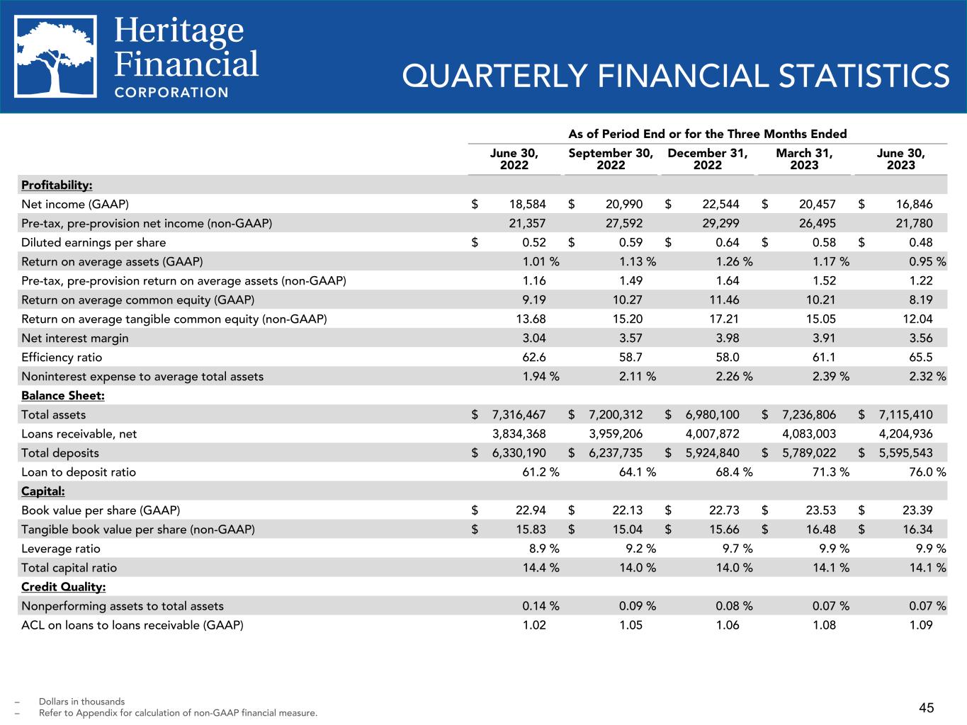 45 As of Period End or for the Three Months Ended June 30, 2022 September 30, 2022 December 31, 2022 March 31, 2023 June 30, 2023 Profitability: Net income (GAAP) $ 18,584 $ 20,990 $ 22,544 $ 20,457 $ 16,846 Pre-tax, pre-provision net income (non-GAAP) 21,357 27,592 29,299 26,495 21,780 Diluted earnings per share $ 0.52 $ 0.59 $ 0.64 $ 0.58 $ 0.48 Return on average assets (GAAP) 1.01 % 1.13 % 1.26 % 1.17 % 0.95 % Pre-tax, pre-provision return on average assets (non-GAAP) 1.16 1.49 1.64 1.52 1.22 Return on average common equity (GAAP) 9.19 10.27 11.46 10.21 8.19 Return on average tangible common equity (non-GAAP) 13.68 15.20 17.21 15.05 12.04 Net interest margin 3.04 3.57 3.98 3.91 3.56 Efficiency ratio 62.6 58.7 58.0 61.1 65.5 Noninterest expense to average total assets 1.94 % 2.11 % 2.26 % 2.39 % 2.32 % Balance Sheet: Total assets $ 7,316,467 $ 7,200,312 $ 6,980,100 $ 7,236,806 $ 7,115,410 Loans receivable, net 3,834,368 3,959,206 4,007,872 4,083,003 4,204,936 Total deposits $ 6,330,190 $ 6,237,735 $ 5,924,840 $ 5,789,022 $ 5,595,543 Loan to deposit ratio 61.2 % 64.1 % 68.4 % 71.3 % 76.0 % Capital: Book value per share (GAAP) $ 22.94 $ 22.13 $ 22.73 $ 23.53 $ 23.39 Tangible book value per share (non-GAAP) $ 15.83 $ 15.04 $ 15.66 $ 16.48 $ 16.34 Leverage ratio 8.9 % 9.2 % 9.7 % 9.9 % 9.9 % Total capital ratio 14.4 % 14.0 % 14.0 % 14.1 % 14.1 % Credit Quality: Nonperforming assets to total assets 0.14 % 0.09 % 0.08 % 0.07 % 0.07 % ACL on loans to loans receivable (GAAP) 1.02 1.05 1.06 1.08 1.09 – Dollars in thousands – Refer to Appendix for calculation of non-GAAP financial measure. QUARTERLY FINANCIAL STATISTICS