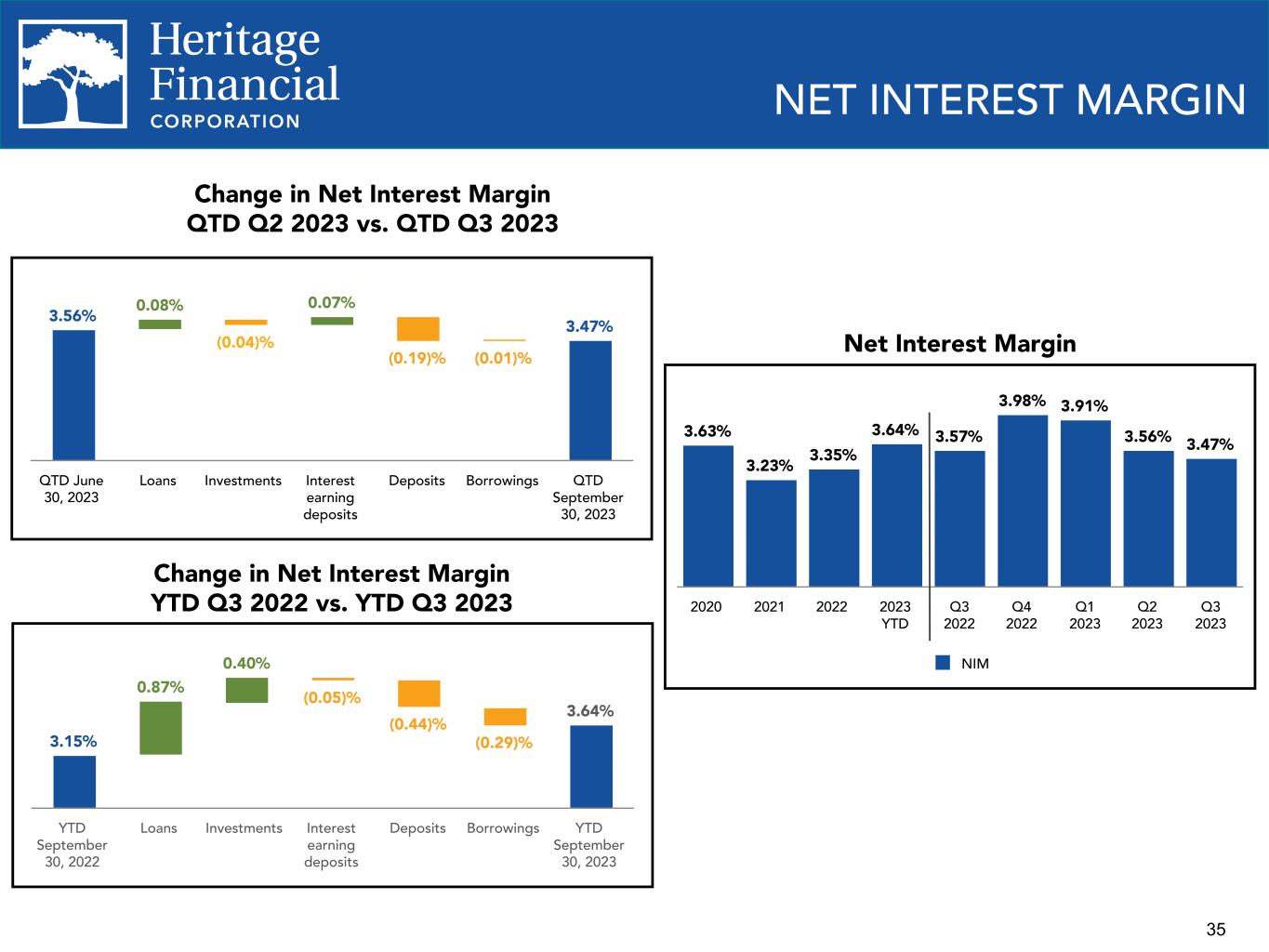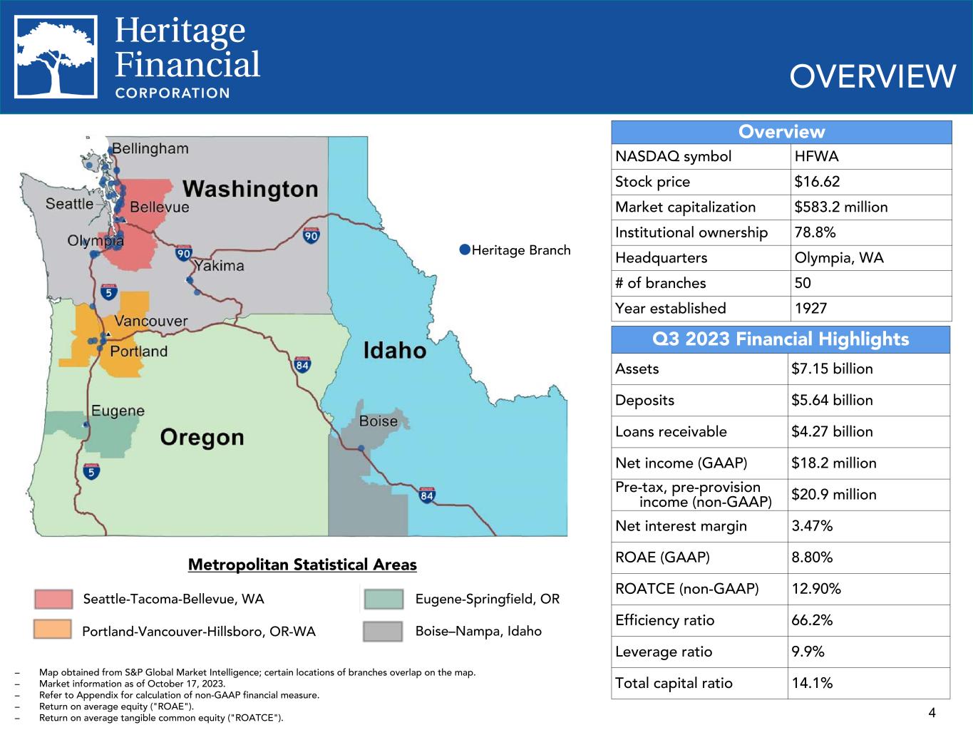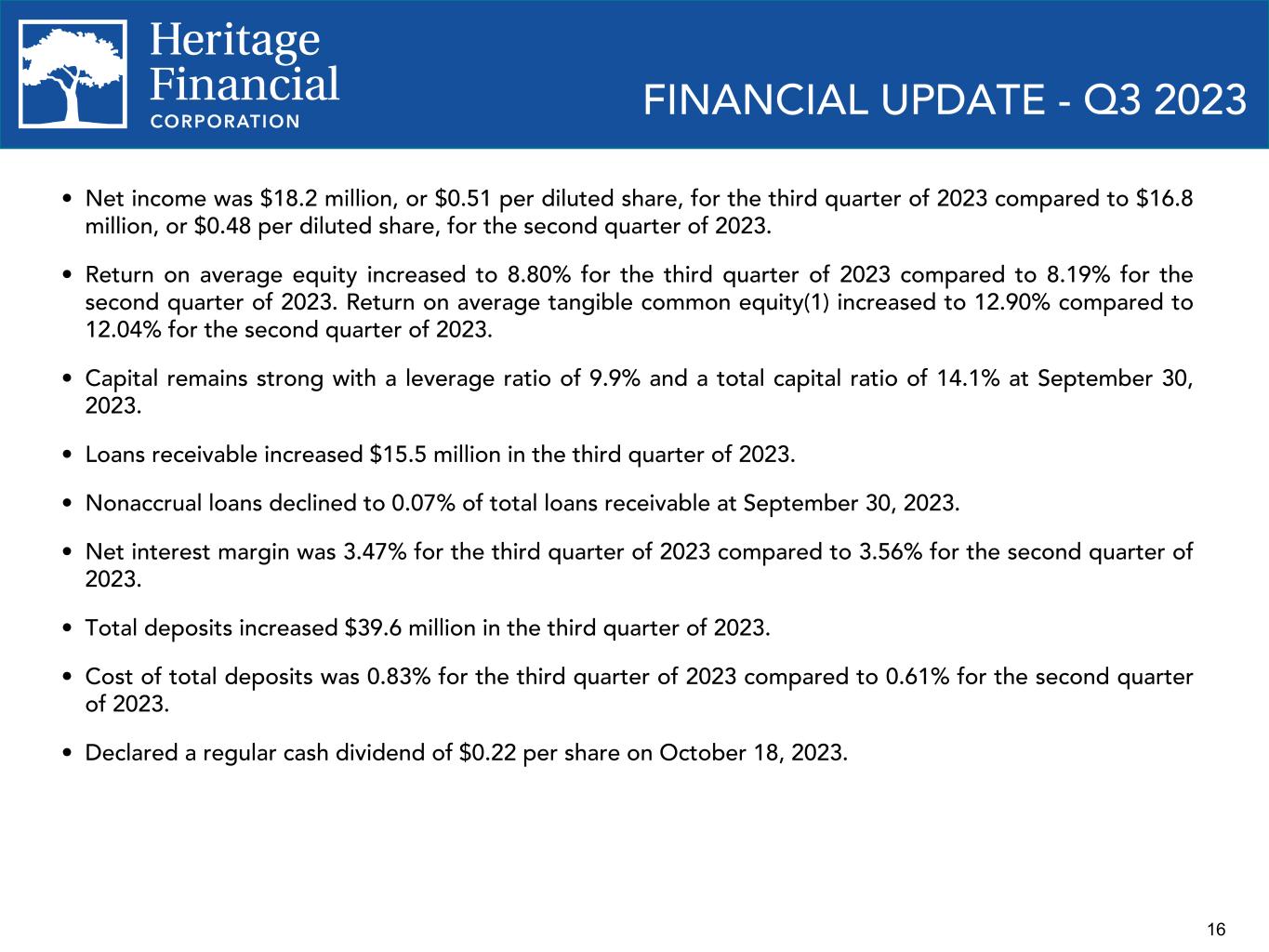 2 This presentation contains “forward-looking statements” within the meaning of the Private Securities Litigation Reform Act of 1995. Forward-looking statements are not statements of historical fact, are based on certain assumptions and often include the words “believes,” “expects,” “anticipates,” “estimates,” “forecasts,” “intends,” “plans,” “targets,” “potentially,” “probably,” “projects,” “outlook” or similar expressions or future or conditional verbs such as “may,” “will,” “should,” “would” and “could.” These statements relate to Heritage Financial Corporation’s (“we”, “us”, “our”, or the “Company”) financial condition, results of operations, beliefs, plans, objectives, goals, expectations, assumptions and statements about future performance or business. These forward-looking statements are subject to known and unknown risks, uncertainties and other factors that could cause our actual results for future periods to differ materially from those expressed in any forward-looking statements by, or on behalf of, the Company and could negatively affect the Company’s operating results and stock price performance. Factors that may cause such a difference include, but are not limited to: • potential adverse impacts to economic conditions nationally or in our local market areas, other markets where the Company has lending relationships, or other aspects of the Company’s business operations or financial markets, including, without limitation, as a result of employment levels, labor shortages and the effects of inflation, a potential recession or slowed economic growth; • changes in the interest rate environment, including the recent increases in the Board of Governors of the Federal Reserve System benchmark rate and duration at which such increased interest rate levels are maintained, which could adversely affect our revenues and expenses, the value of assets and obligations, and the availability and cost of capital and liquidity; • the impact of continuing inflation and the current and future monetary policies of the Federal Reserve in response thereto; • the impact of bank failures or adverse developments at other banks and related negative publicity about the banking industry in general on investor and depositor sentiment regarding the stability and liquidity of banks; • the effects of any federal government shutdown; • legislative or regulatory changes that adversely affect our business, including changes in banking, securities and tax law, in regulatory policies and principles, or the interpretation of regulatory capital or other rules; • credit and interest rate risks associated with the Company’s businesses, customers, borrowings, repayment, investment, and deposit practices; • fluctuations in deposits; • liquidity issues, including our ability to borrow funds or raise additional capital, if necessary; • disruptions, security breaches, or other adverse events, failures or interruptions in, or attacks on, our information technology systems or on the third-party vendors who perform several of our critical processing functions; • effects of critical accounting policies and judgments, including the use of estimates in determining fair value of certain of our assets, which estimates may prove to be incorrect and result in significant declines in valuation; and • the effects of climate change, severe weather events, natural disasters, pandemics, epidemics and other public health crises, acts of war or terrorism, and other external events on our business. Further, certain risks and important factors that could affect the Company’s future results are identified in its Annual Report on Form 10-K for the year ended December 31, 2022 and other reports filed by the Company with the Securities and Exchange Commission, including among other things under the heading “Risk Factors” in such Annual Report on Form 10-K. Any forward-looking statement speaks only as of the date on which it is made, and the Company undertakes no obligation to update any forward- looking statement, whether to reflect events or circumstances after the date on which the statement is made, to reflect new information or the occurrence of unanticipated events, or otherwise. Non-GAAP Financial Information The Company reports its results in accordance with United States generally accepted accounting principles (“GAAP”). However, management believes that certain non-GAAP performance measures used in managing the business may provide meaningful information about underlying trends in its business. Non-GAAP financial measures should be viewed in addition to, and not as an alternative for, the Company’s reported results prepared in accordance with GAAP. Slides containing a discussion and reconciliation of non-GAAP financial measures are contained at the end of this presentation. All dollars throughout the entire presentation are in millions unless otherwise noted, except per share amounts. FORWARD LOOKING STATEMENTS
