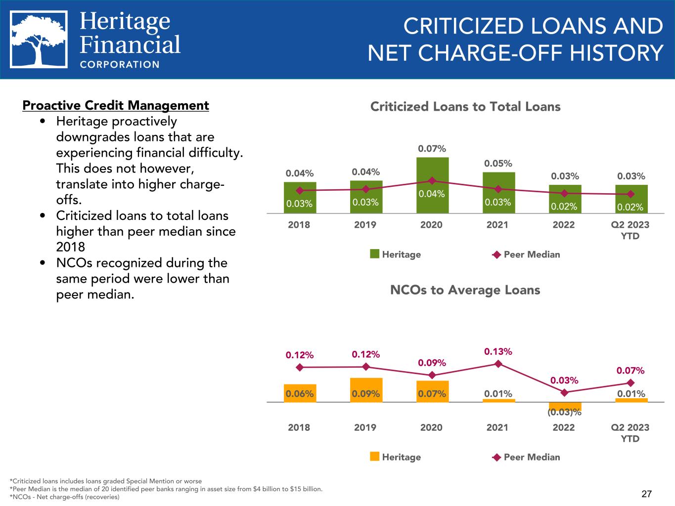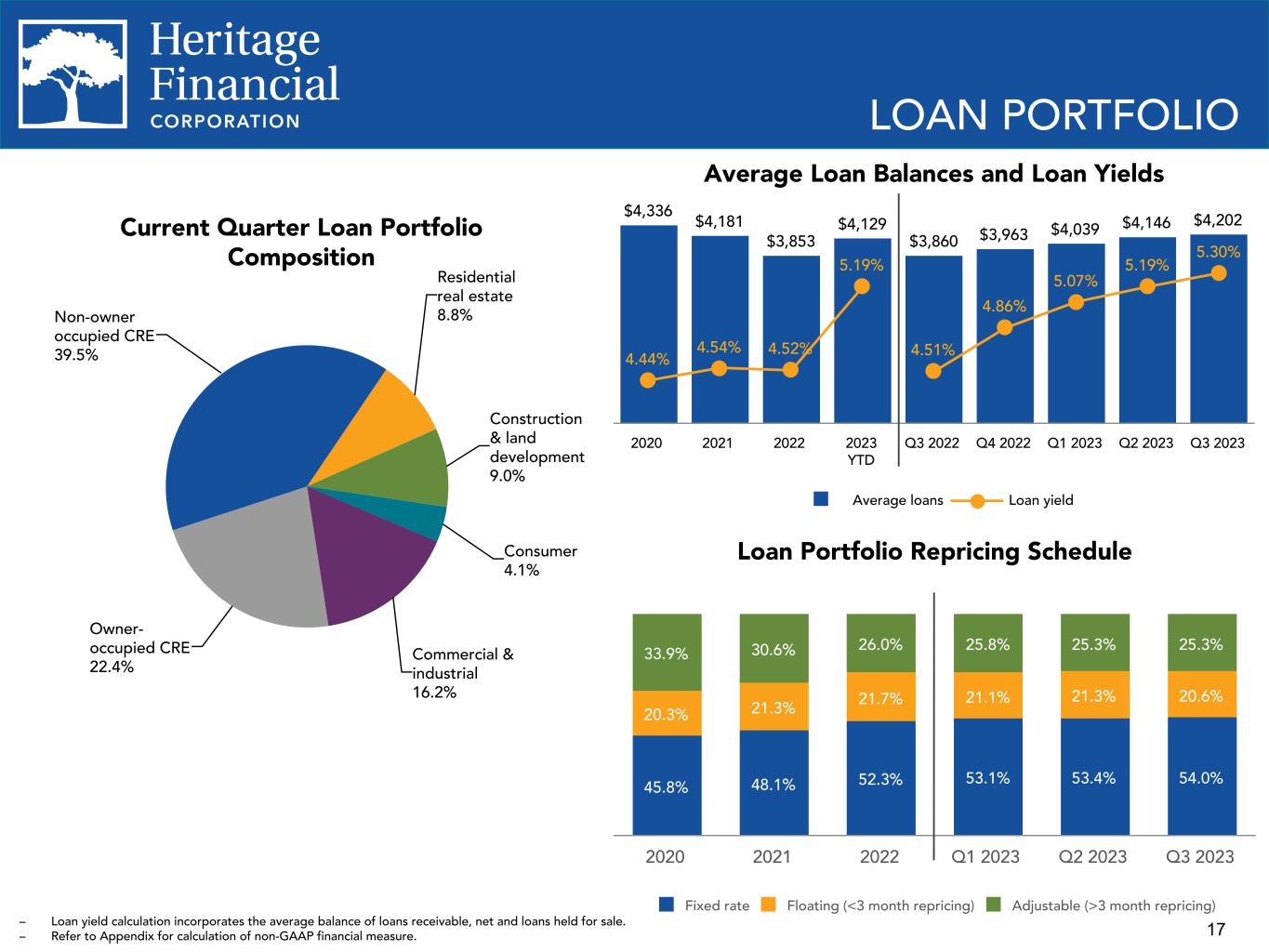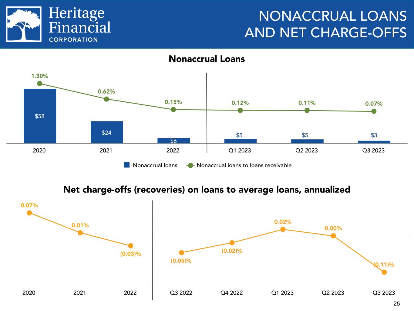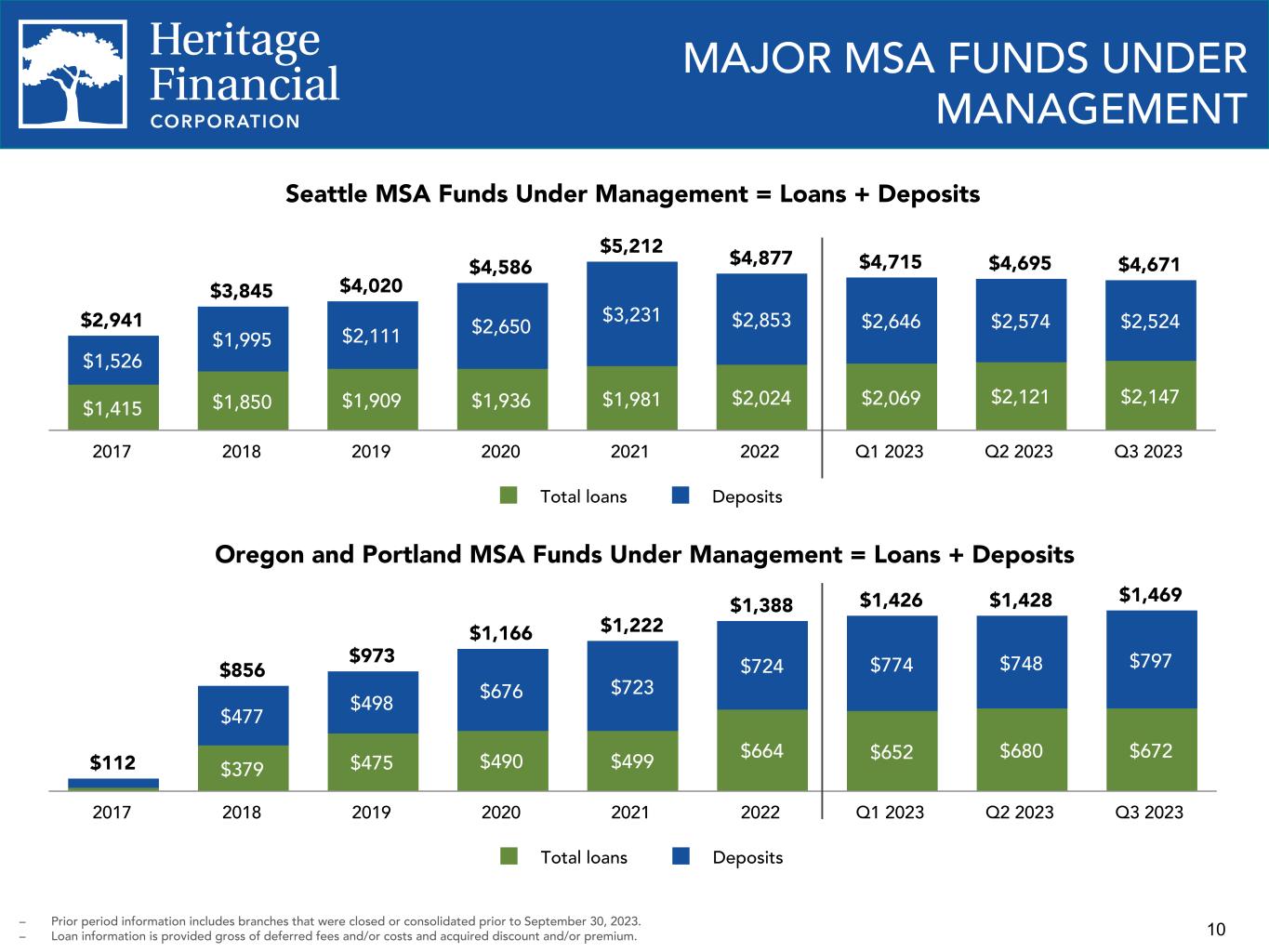 2 This presentation contains “forward-looking statements” within the meaning of the Private Securities Litigation Reform Act of 1995. Forward-looking statements are not statements of historical fact, are based on certain assumptions and often include the words “believes,” “expects,” “anticipates,” “estimates,” “forecasts,” “intends,” “plans,” “targets,” “potentially,” “probably,” “projects,” “outlook” or similar expressions or future or conditional verbs such as “may,” “will,” “should,” “would” and “could.” These statements relate to Heritage Financial Corporation’s (“we”, “us”, “our”, or the “Company”) financial condition, results of operations, beliefs, plans, objectives, goals, expectations, assumptions and statements about future performance or business. These forward-looking statements are subject to known and unknown risks, uncertainties and other factors that could cause our actual results for future periods to differ materially from those expressed in any forward-looking statements by, or on behalf of, the Company and could negatively affect the Company’s operating results and stock price performance. Factors that may cause such a difference include, but are not limited to: • potential adverse impacts to economic conditions nationally or in our local market areas, other markets where the Company has lending relationships, or other aspects of the Company’s business operations or financial markets, including, without limitation, as a result of employment levels, labor shortages and the effects of inflation, a potential recession or slowed economic growth; • changes in the interest rate environment, including the recent increases in the Board of Governors of the Federal Reserve System benchmark rate and duration at which such increased interest rate levels are maintained, which could adversely affect our revenues and expenses, the value of assets and obligations, and the availability and cost of capital and liquidity; • the impact of continuing inflation and the current and future monetary policies of the Federal Reserve in response thereto; • the impact of bank failures or adverse developments at other banks and related negative publicity about the banking industry in general on investor and depositor sentiment regarding the stability and liquidity of banks; • the effects of any federal government shutdown; • legislative or regulatory changes that adversely affect our business, including changes in banking, securities and tax law, in regulatory policies and principles, or the interpretation of regulatory capital or other rules; • credit and interest rate risks associated with the Company’s businesses, customers, borrowings, repayment, investment, and deposit practices; • fluctuations in deposits; • liquidity issues, including our ability to borrow funds or raise additional capital, if necessary; • disruptions, security breaches, or other adverse events, failures or interruptions in, or attacks on, our information technology systems or on the third-party vendors who perform several of our critical processing functions; • effects of critical accounting policies and judgments, including the use of estimates in determining fair value of certain of our assets, which estimates may prove to be incorrect and result in significant declines in valuation; and • the effects of climate change, severe weather events, natural disasters, pandemics, epidemics and other public health crises, acts of war or terrorism, and other external events on our business. Further, certain risks and important factors that could affect the Company’s future results are identified in its Annual Report on Form 10-K for the year ended December 31, 2022 and other reports filed by the Company with the Securities and Exchange Commission, including among other things under the heading “Risk Factors” in such Annual Report on Form 10-K. Any forward-looking statement speaks only as of the date on which it is made, and the Company undertakes no obligation to update any forward- looking statement, whether to reflect events or circumstances after the date on which the statement is made, to reflect new information or the occurrence of unanticipated events, or otherwise. Non-GAAP Financial Information The Company reports its results in accordance with United States generally accepted accounting principles (“GAAP”). However, management believes that certain non-GAAP performance measures used in managing the business may provide meaningful information about underlying trends in its business. Non-GAAP financial measures should be viewed in addition to, and not as an alternative for, the Company’s reported results prepared in accordance with GAAP. Slides containing a discussion and reconciliation of non-GAAP financial measures are contained at the end of this presentation. All dollars throughout the entire presentation are in millions unless otherwise noted, except per share amounts. FORWARD LOOKING STATEMENTS