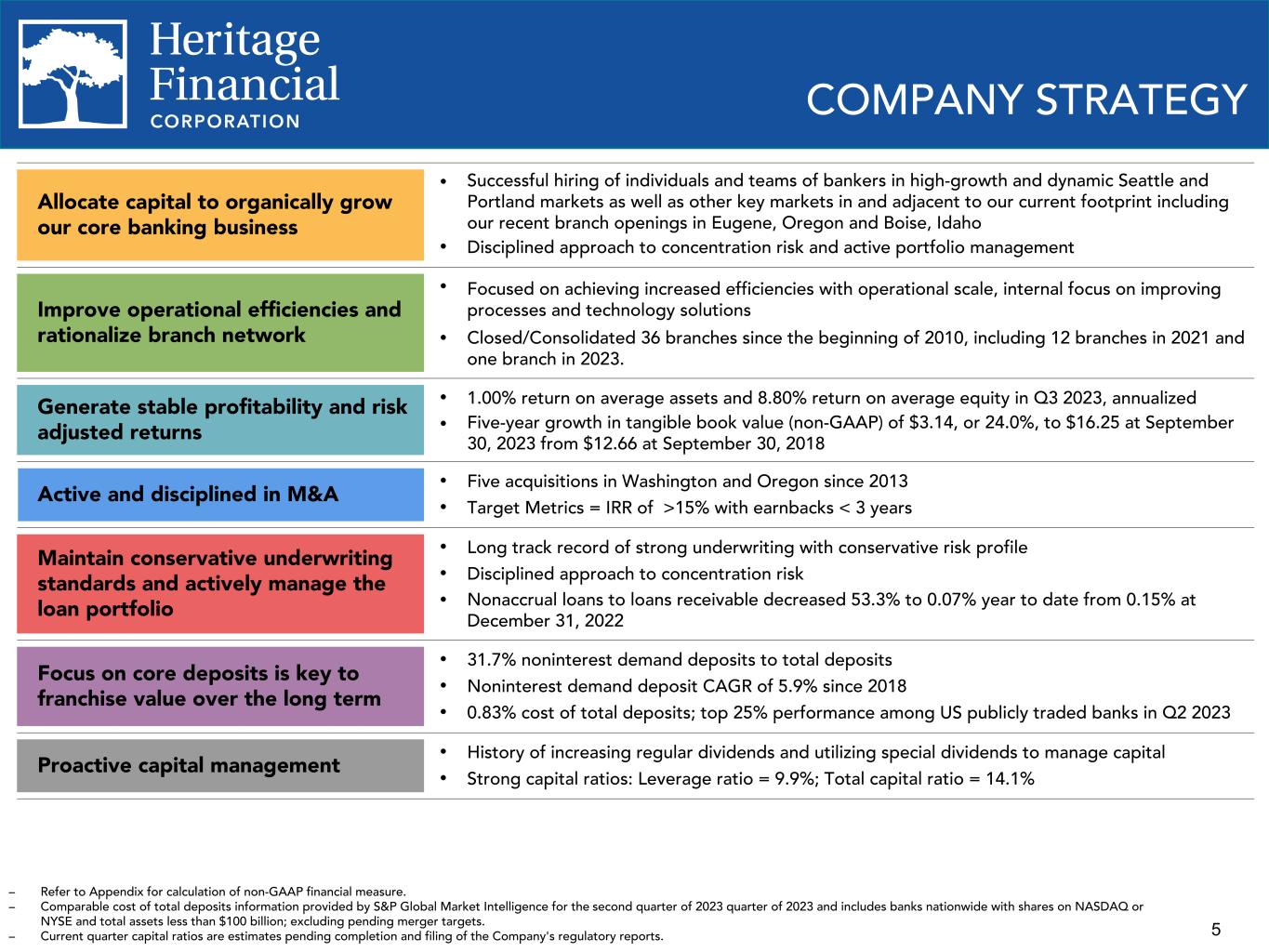 4 OVERVIEW Overview NASDAQ symbol HFWA Stock price $16.62 Market capitalization $583.2 million Institutional ownership 78.8% Headquarters Olympia, WA # of branches 50 Year established 1927 Q3 2023 Financial Highlights Assets $7.15 billion Deposits $5.64 billion Loans receivable $4.27 billion Net income (GAAP) $18.2 million Pre-tax, pre-provision income (non-GAAP) $20.9 million Net interest margin 3.47% ROAE (GAAP) 8.80% ROATCE (non-GAAP) 12.90% Efficiency ratio 66.2% Leverage ratio 9.9% Total capital ratio 14.1% – Map obtained from S&P Global Market Intelligence; certain locations of branches overlap on the map. – Market information as of October 17, 2023. – Refer to Appendix for calculation of non-GAAP financial measure. – Return on average equity ("ROAE"). – Return on average tangible common equity ("ROATCE"). Metropolitan Statistical Areas Seattle-Tacoma-Bellevue, WA Portland-Vancouver-Hillsboro, OR-WA Eugene-Springfield, OR Boise–Nampa, Idaho Heritage Branch