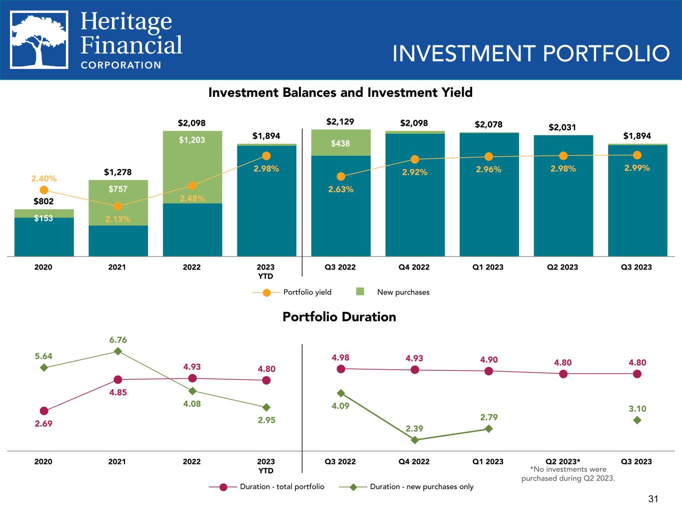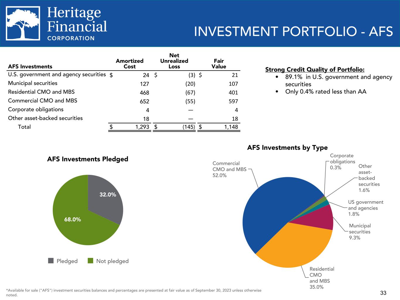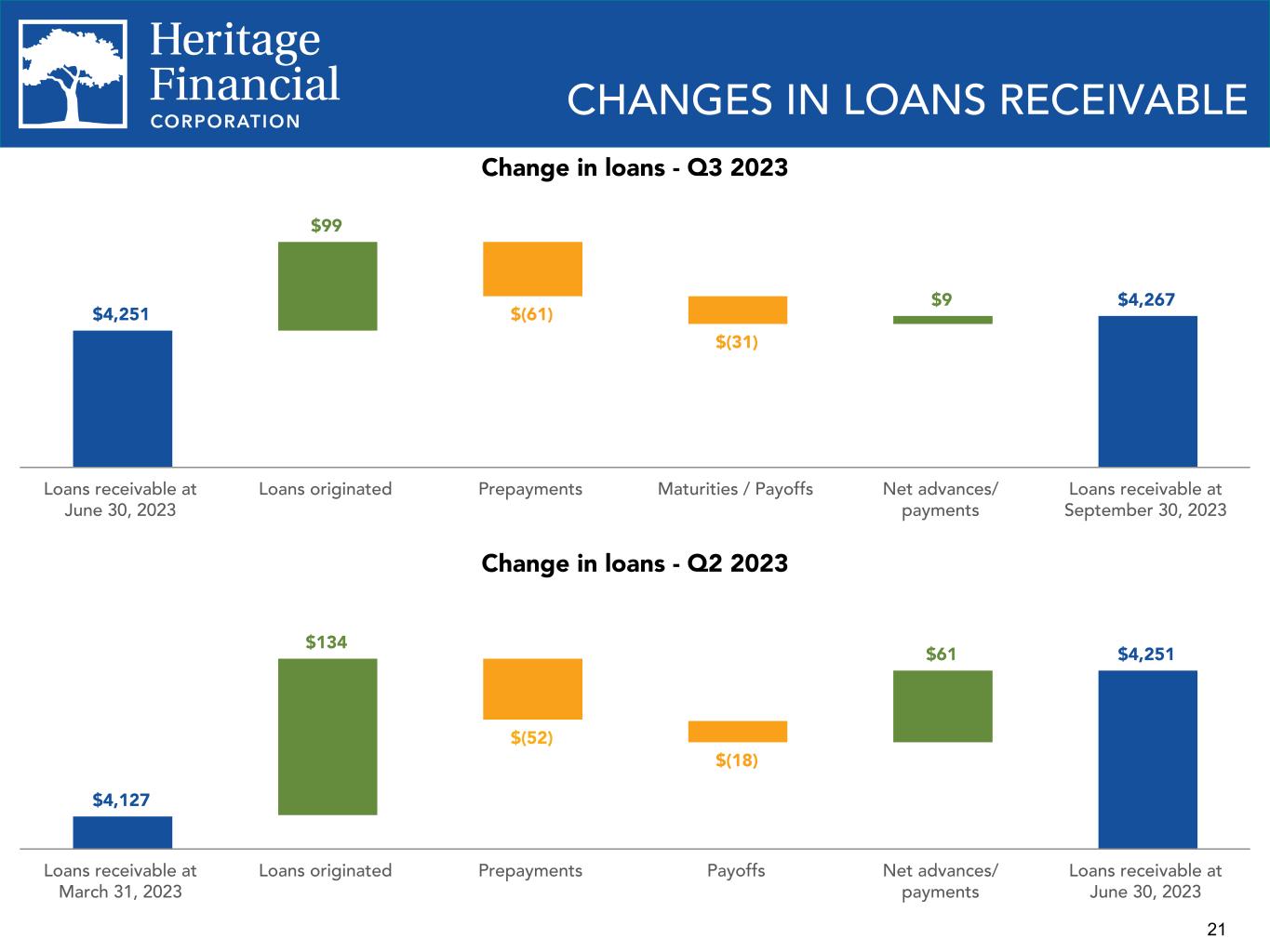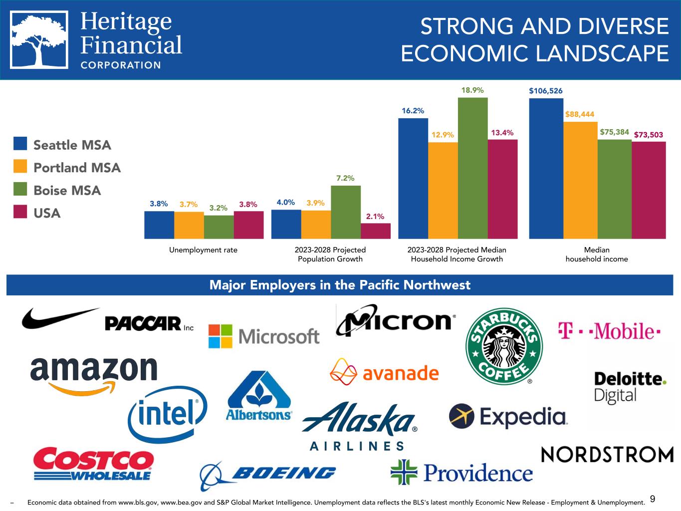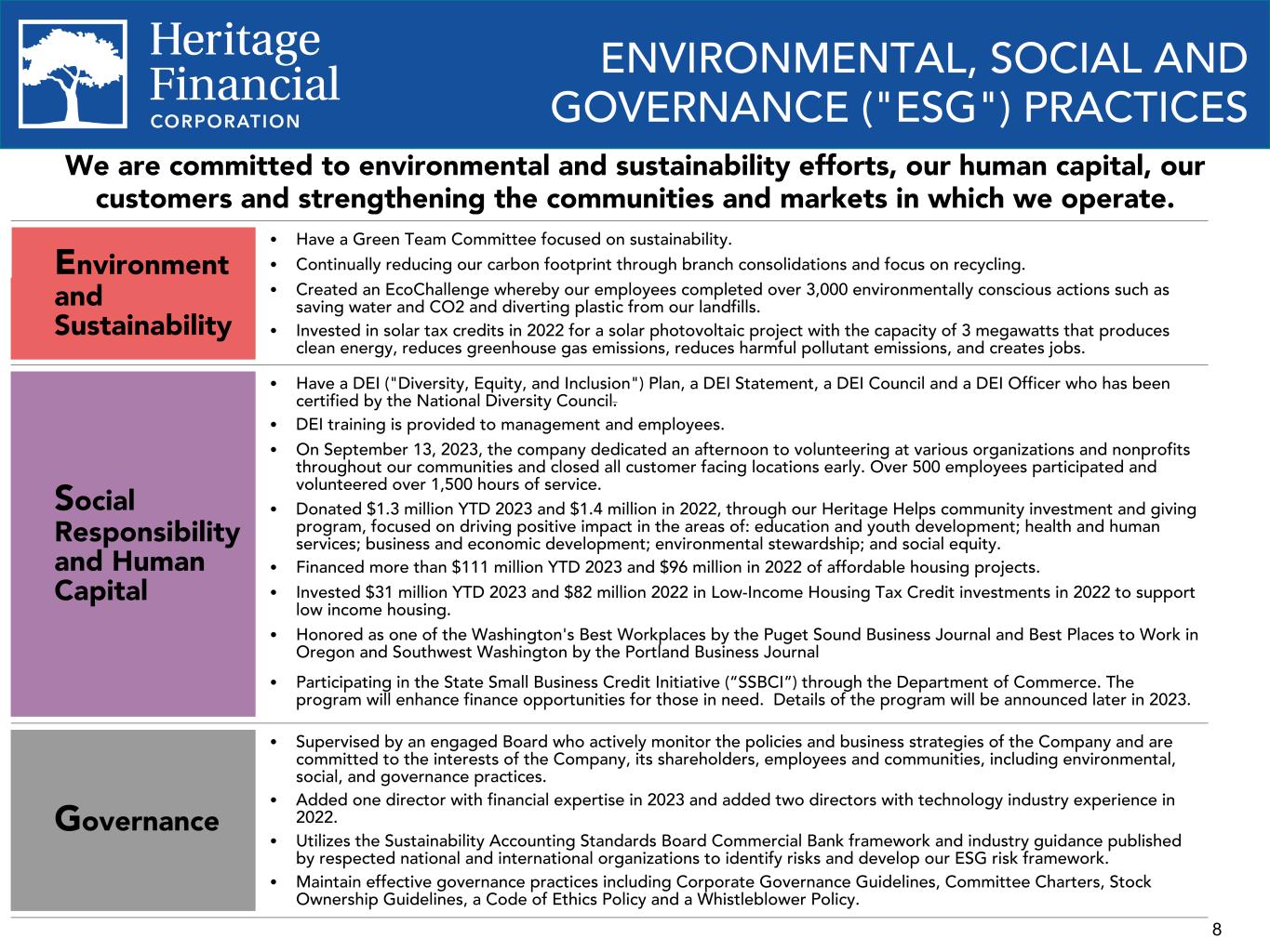 8 ENVIRONMENTAL, SOCIAL AND GOVERNANCE ("ESG") PRACTICES We are committed to environmental and sustainability efforts, our human capital, our customers and strengthening the communities and markets in which we operate. Environment and Sustainability Ÿ Have a Green Team Committee focused on sustainability. Ÿ Continually reducing our carbon footprint through branch consolidations and focus on recycling. Ÿ Created an EcoChallenge whereby our employees completed over 3,000 environmentally conscious actions such as saving water and CO2 and diverting plastic from our landfills. Ÿ Invested in solar tax credits in 2022 for a solar photovoltaic project with the capacity of 3 megawatts that produces clean energy, reduces greenhouse gas emissions, reduces harmful pollutant emissions, and creates jobs. Social Responsibility and Human Capital Ÿ Have a DEI ("Diversity, Equity, and Inclusion") Plan, a DEI Statement, a DEI Council and a DEI Officer who has been certified by the National Diversity Council. Ÿ DEI training is provided to management and employees. Ÿ On September 13, 2023, the company dedicated an afternoon to volunteering at various organizations and nonprofits throughout our communities and closed all customer facing locations early. Over 500 employees participated and volunteered over 1,500 hours of service. Ÿ Donated $1.3 million YTD 2023 and $1.4 million in 2022, through our Heritage Helps community investment and giving program, focused on driving positive impact in the areas of: education and youth development; health and human services; business and economic development; environmental stewardship; and social equity. Ÿ Financed more than $111 million YTD 2023 and $96 million in 2022 of affordable housing projects. Ÿ Invested $31 million YTD 2023 and $82 million 2022 in Low-Income Housing Tax Credit investments in 2022 to support low income housing. Ÿ Honored as one of the Washington's Best Workplaces by the Puget Sound Business Journal and Best Places to Work in Oregon and Southwest Washington by the Portland Business Journal Ÿ Participating in the State Small Business Credit Initiative (“SSBCI”) through the Department of Commerce. The program will enhance finance opportunities for those in need. Details of the program will be announced later in 2023. Governance Ÿ Supervised by an engaged Board who actively monitor the policies and business strategies of the Company and are committed to the interests of the Company, its shareholders, employees and communities, including environmental, social, and governance practices. Ÿ Added one director with financial expertise in 2023 and added two directors with technology industry experience in 2022. Ÿ Utilizes the Sustainability Accounting Standards Board Commercial Bank framework and industry guidance published by respected national and international organizations to identify risks and develop our ESG risk framework. Ÿ Maintain effective governance practices including Corporate Governance Guidelines, Committee Charters, Stock Ownership Guidelines, a Code of Ethics Policy and a Whistleblower Policy.