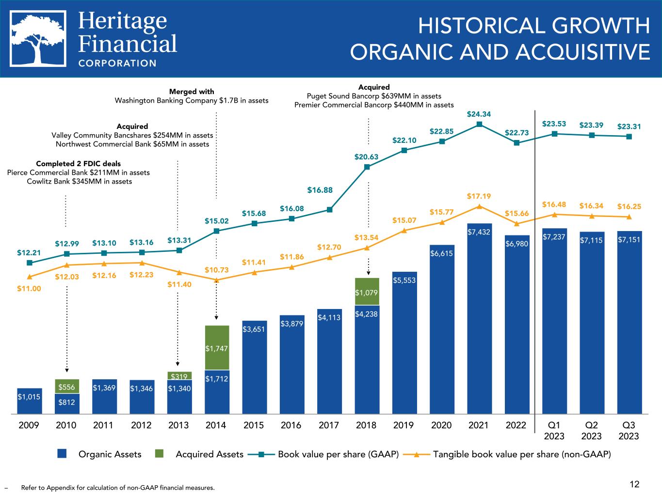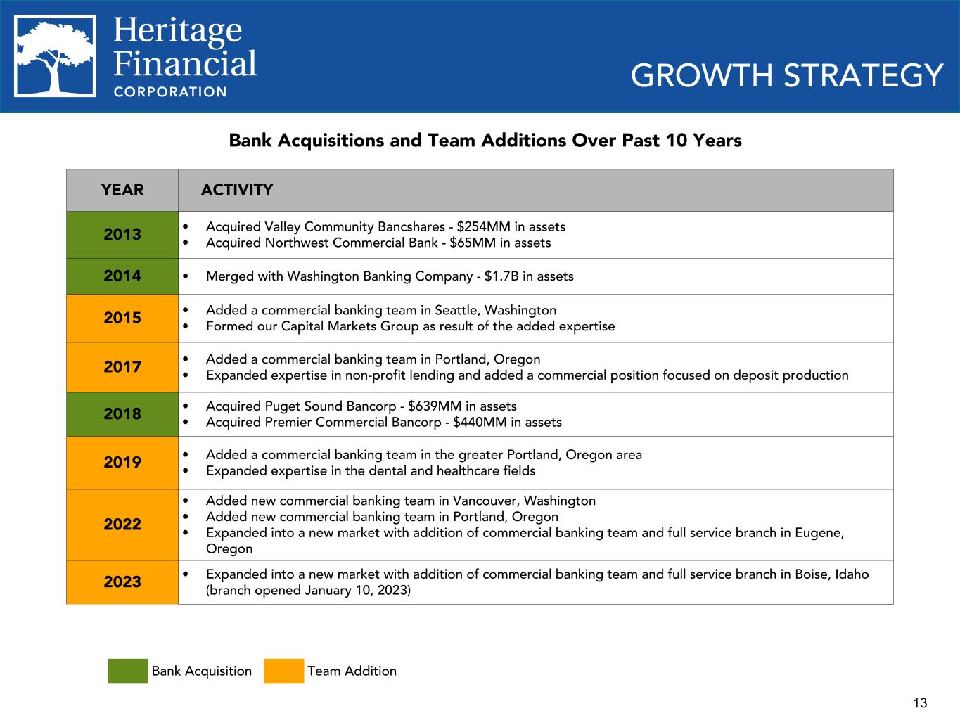 12 $1,015 $812 $1,369 $1,346 $1,340 $1,712 $3,651 $3,879 $4,113 $4,238 $5,553 $6,615 $7,432 $6,980 $7,237 $7,115 $7,151 $556 $319 $1,747 $1,079 $12.21 $12.99 $13.10 $13.16 $13.31 $15.02 $15.68 $16.08 $20.63 $22.10 $22.85 $24.34 $22.73 $23.53 $23.39 $23.31 $11.00 $12.03 $12.16 $12.23 $11.40 $10.73 $11.41 $11.86 $12.70 $13.54 $15.07 $15.77 $17.19 $15.66 $16.48 $16.34 $16.25 Organic Assets Acquired Assets Book value per share (GAAP) Tangible book value per share (non-GAAP) 2009 2010 2011 2012 2013 2014 2015 2016 2017 2018 2019 2020 2021 2022 Q1 2023 Q2 2023 Q3 2023 Completed 2 FDIC deals Pierce Commercial Bank $211MM in assets Cowlitz Bank $345MM in assets Acquired Puget Sound Bancorp $639MM in assets Premier Commercial Bancorp $440MM in assets HISTORICAL GROWTH ORGANIC AND ACQUISITIVE Merged with Washington Banking Company $1.7B in assets Acquired Valley Community Bancshares $254MM in assets Northwest Commercial Bank $65MM in assets – Refer to Appendix for calculation of non-GAAP financial measures. $16.88
