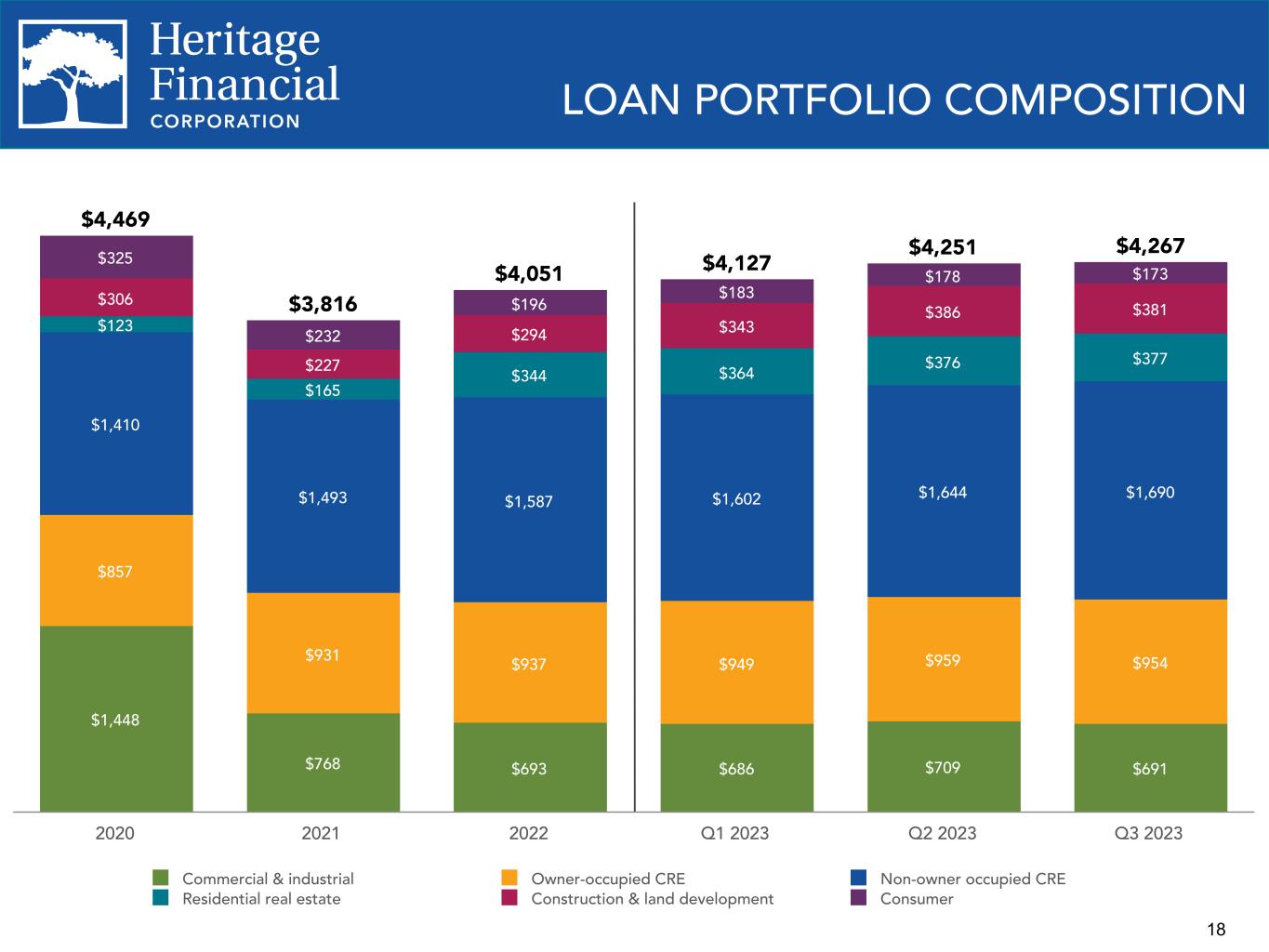 17 Average Loan Balances and Loan Yields $4,336 $4,181 $3,853 $4,129 $3,860 $3,963 $4,039 $4,146 $4,202 4.44% 4.54% 4.52% 5.19% 4.51% 4.86% 5.07% 5.19% 5.30% Average loans Loan yield 2020 2021 2022 2023 YTD Q3 2022 Q4 2022 Q1 2023 Q2 2023 Q3 2023 Commercial & industrial 16.2% Owner- occupied CRE 22.4% Non-owner occupied CRE 39.5% Residential real estate 8.8% Construction & land development 9.0% Consumer 4.1% LOAN PORTFOLIO Current Quarter Loan Portfolio Composition Loan Portfolio Repricing Schedule 33.9% 30.6% 26.0% 25.8% 25.3% 25.3% 20.3% 21.3% 21.7% 21.1% 21.3% 20.6% 45.8% 48.1% 52.3% 53.1% 53.4% 54.0% Fixed rate Floating (<3 month repricing) Adjustable (>3 month repricing) 2020 2021 2022 Q1 2023 Q2 2023 Q3 2023 – Loan yield calculation incorporates the average balance of loans receivable, net and loans held for sale. – Refer to Appendix for calculation of non-GAAP financial measure.