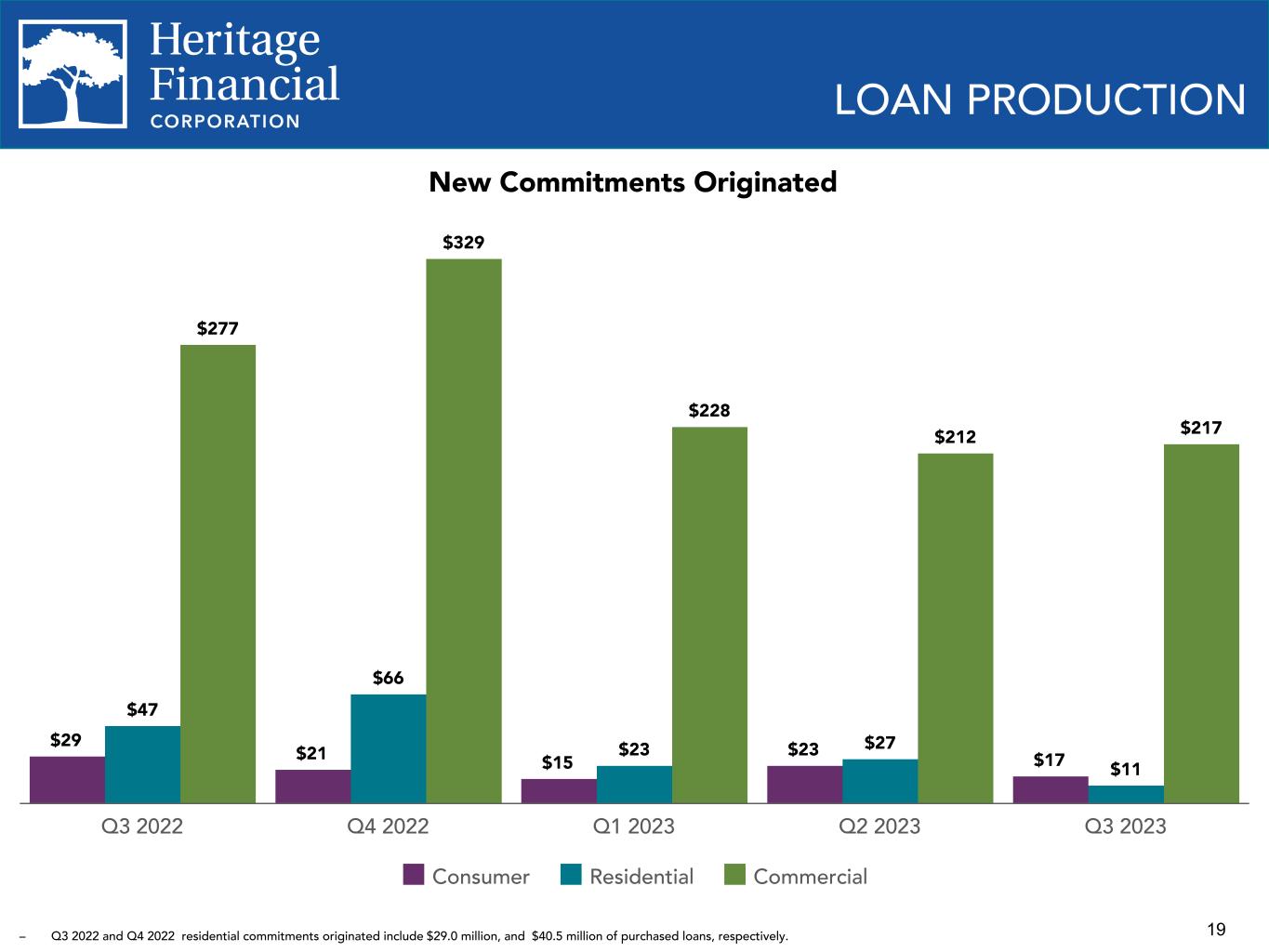 18 LOAN PORTFOLIO COMPOSITION $4,469 $3,816 $4,051 $4,127 $4,251 $4,267 $1,448 $768 $693 $686 $709 $691 $857 $931 $937 $949 $959 $954 $1,410 $1,493 $1,587 $1,602 $1,644 $1,690 $123 $165 $344 $364 $376 $377 $306 $227 $294 $343 $386 $381 $325 $232 $196 $183 $178 $173 Commercial & industrial Owner-occupied CRE Non-owner occupied CRE Residential real estate Construction & land development Consumer 2020 2021 2022 Q1 2023 Q2 2023 Q3 2023