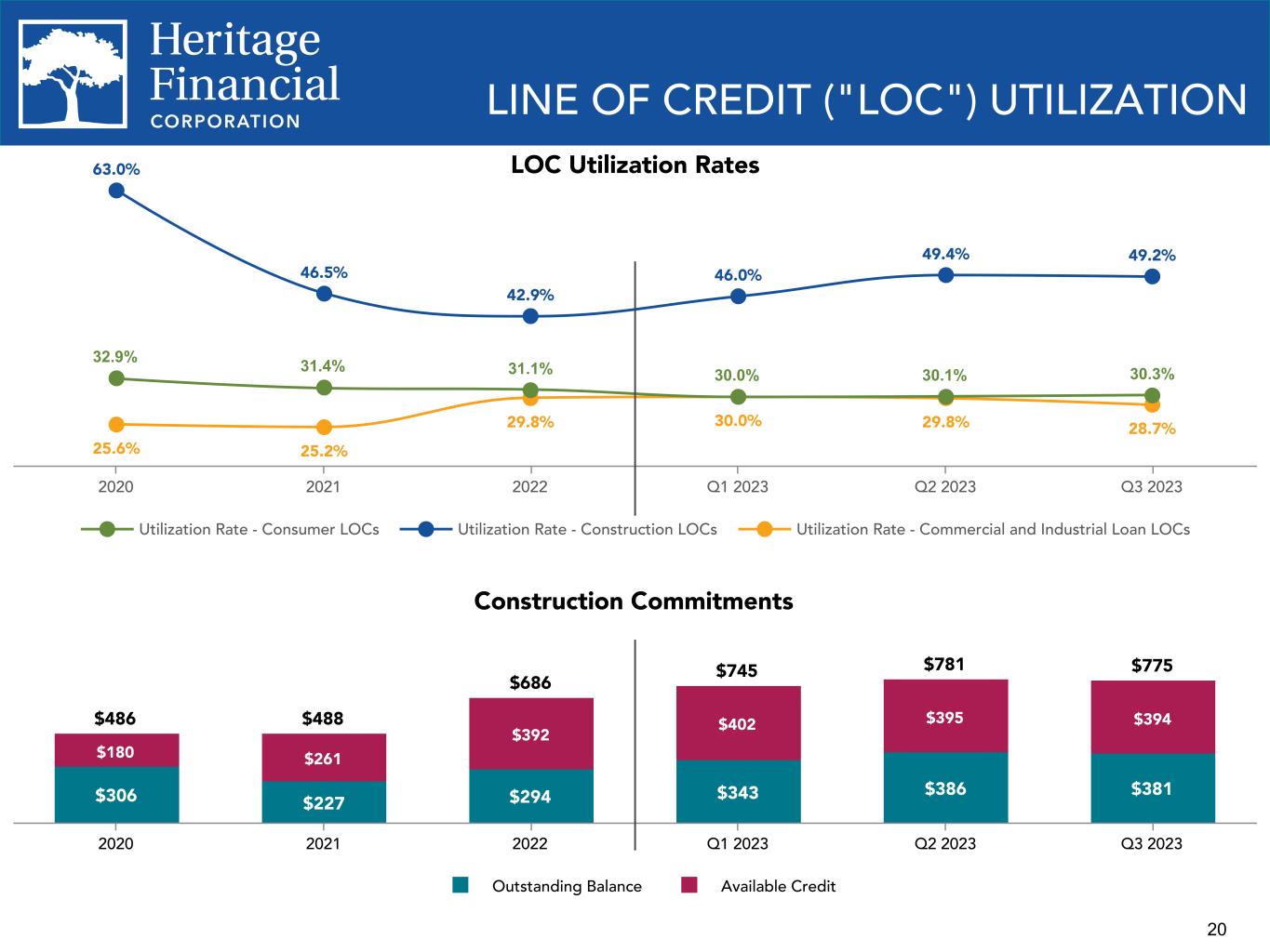 19 New Commitments Originated $29 $21 $15 $23 $17 $47 $66 $23 $27 $11 $277 $329 $228 $212 $217 Consumer Residential Commercial Q3 2022 Q4 2022 Q1 2023 Q2 2023 Q3 2023 LOAN PRODUCTION – Q3 2022 and Q4 2022 residential commitments originated include $29.0 million, and $40.5 million of purchased loans, respectively.