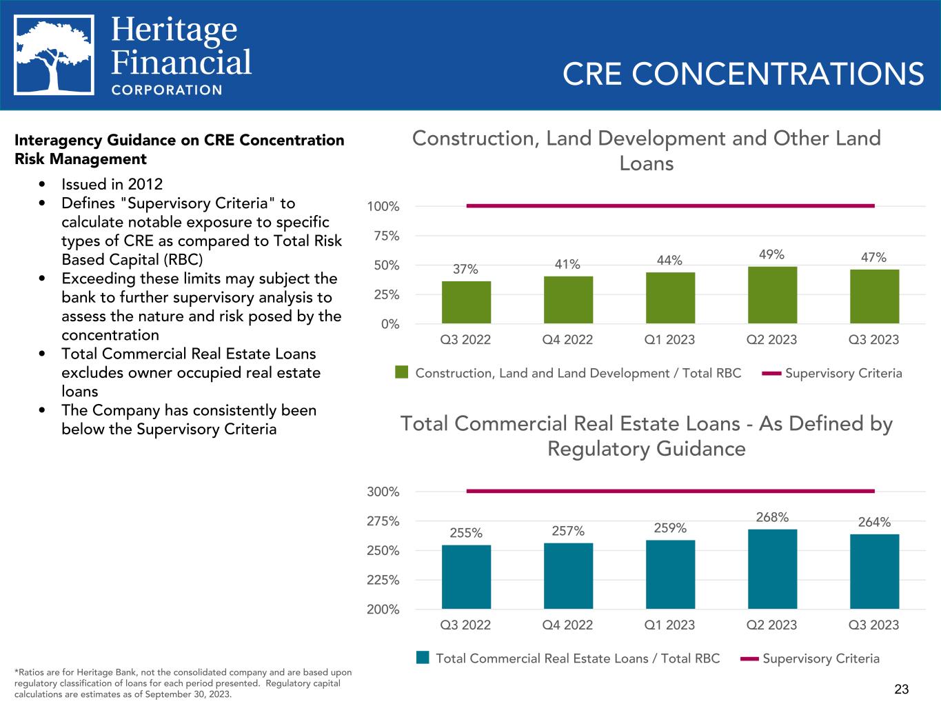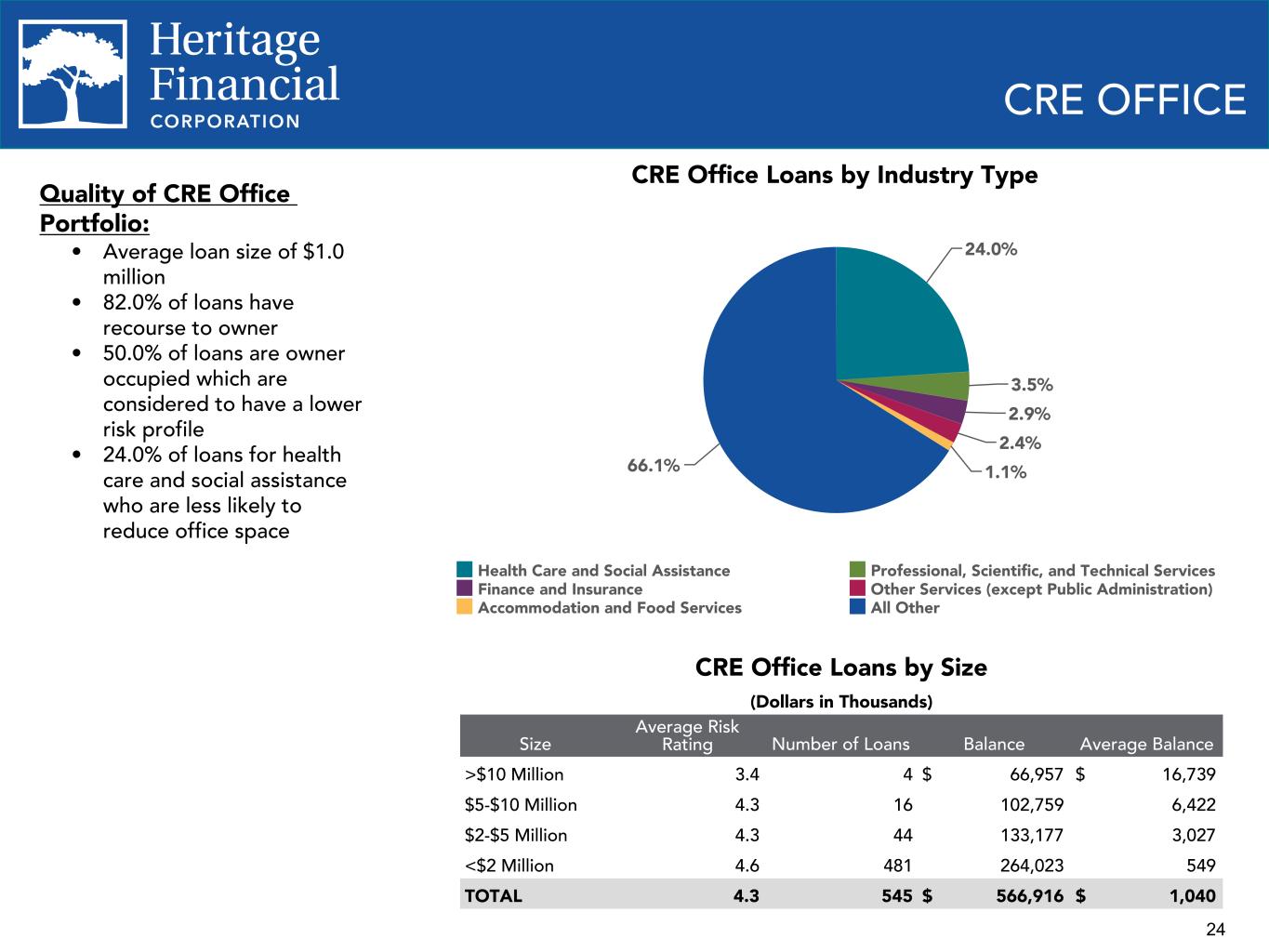 23 CRE CONCENTRATIONS Total Commercial Real Estate Loans - As Defined by Regulatory Guidance 255% 257% 259% 268% 264% Total Commercial Real Estate Loans / Total RBC Supervisory Criteria Q3 2022 Q4 2022 Q1 2023 Q2 2023 Q3 2023 200% 225% 250% 275% 300% Construction, Land Development and Other Land Loans 37% 41% 44% 49% 47% Construction, Land and Land Development / Total RBC Supervisory Criteria Q3 2022 Q4 2022 Q1 2023 Q2 2023 Q3 2023 0% 25% 50% 75% 100% Interagency Guidance on CRE Concentration Risk Management • Issued in 2012 • Defines "Supervisory Criteria" to calculate notable exposure to specific types of CRE as compared to Total Risk Based Capital (RBC) • Exceeding these limits may subject the bank to further supervisory analysis to assess the nature and risk posed by the concentration • Total Commercial Real Estate Loans excludes owner occupied real estate loans • The Company has consistently been below the Supervisory Criteria *Ratios are for Heritage Bank, not the consolidated company and are based upon regulatory classification of loans for each period presented. Regulatory capital calculations are estimates as of September 30, 2023.