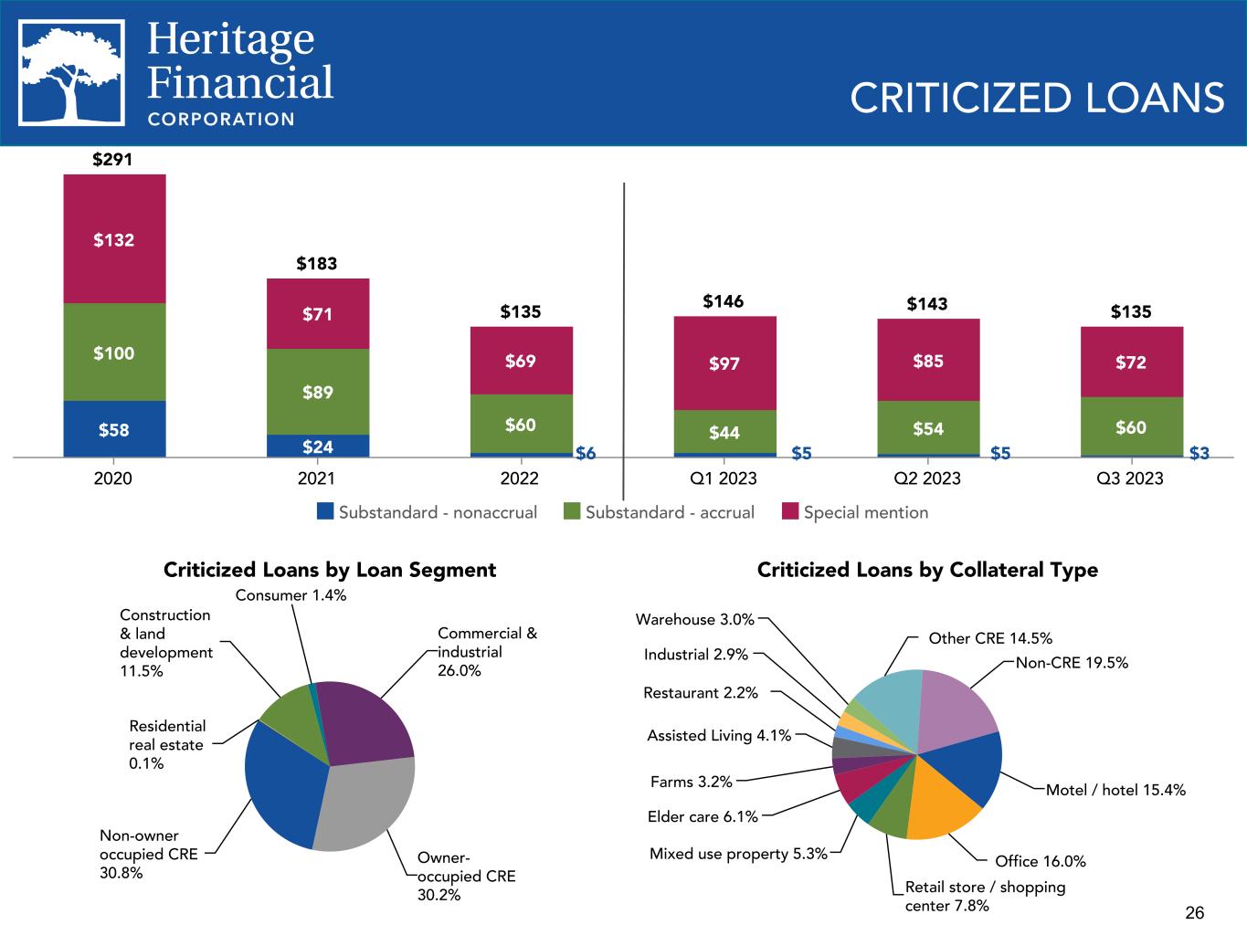 25 Net charge-offs (recoveries) on loans to average loans, annualized 0.07% 0.01% (0.03)% (0.05)% (0.02)% 0.02% 0.00% (0.11)% 2020 2021 2022 Q3 2022 Q4 2022 Q1 2023 Q2 2023 Q3 2023 Nonaccrual Loans $58 $24 $6 Nonaccrual loans Nonaccrual loans to loans receivable 2020 2021 2022 Q1 2023 Q2 2023 Q3 2023 1.30% 0.62% 0.15% 0.12% 0.11% 0.07% NONACCRUAL LOANS AND NET CHARGE-OFFS $5$5 $3
