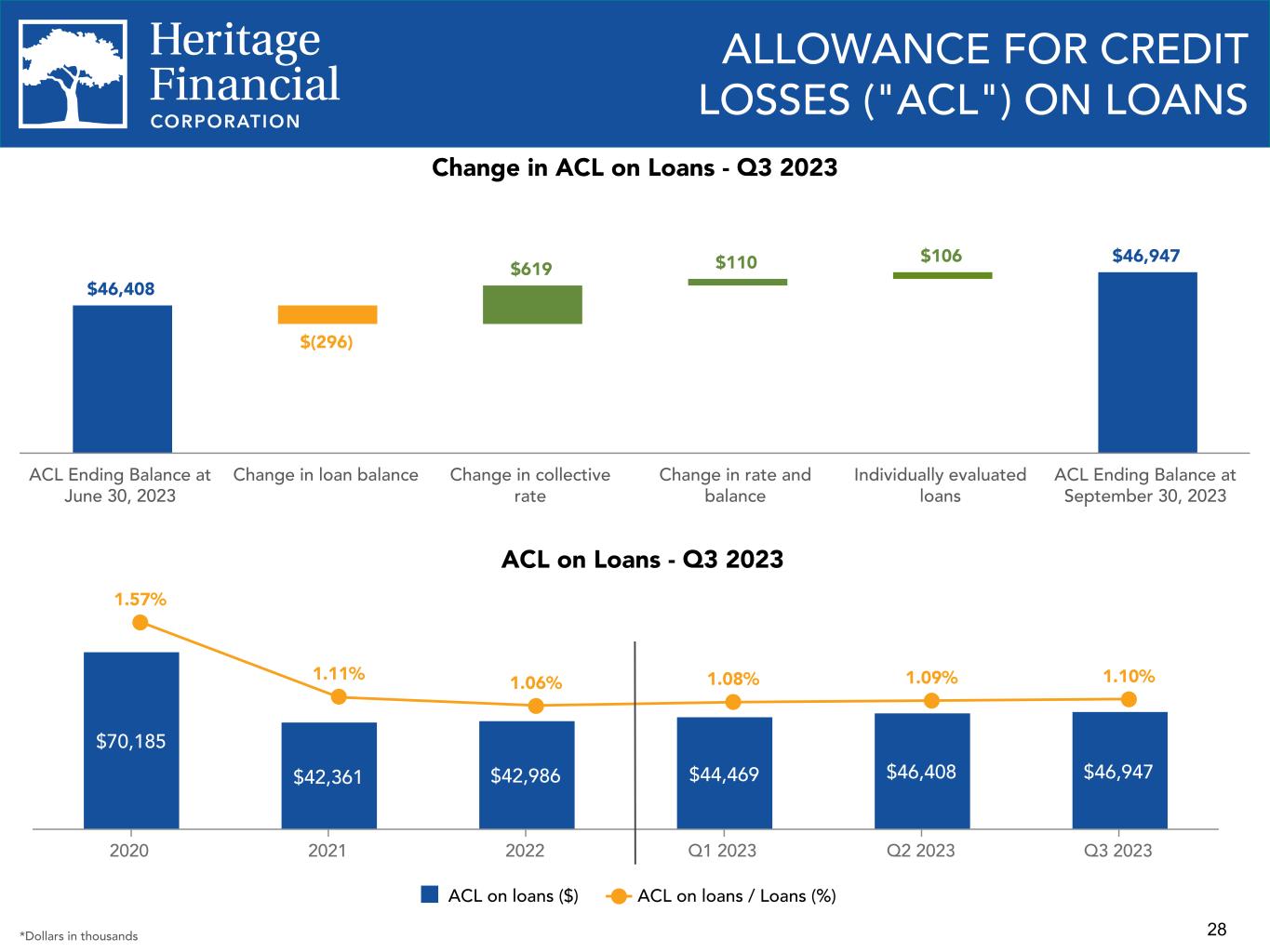 28 1.57% 1.11% 1.06% 1.08% 1.09% 1.10% $70,185 $42,361 $42,986 $44,469 $46,408 $46,947 ACL on loans ($) ACL on loans / Loans (%) 2020 2021 2022 Q1 2023 Q2 2023 Q3 2023 ACL on Loans - Q3 2023 ALLOWANCE FOR CREDIT LOSSES ("ACL") ON LOANS $46,408 $(296) $619 $110 $106 $46,947 ACL Ending Balance at June 30, 2023 Change in loan balance Change in collective rate Change in rate and balance Individually evaluated loans ACL Ending Balance at September 30, 2023 Change in ACL on Loans - Q3 2023 *Dollars in thousands