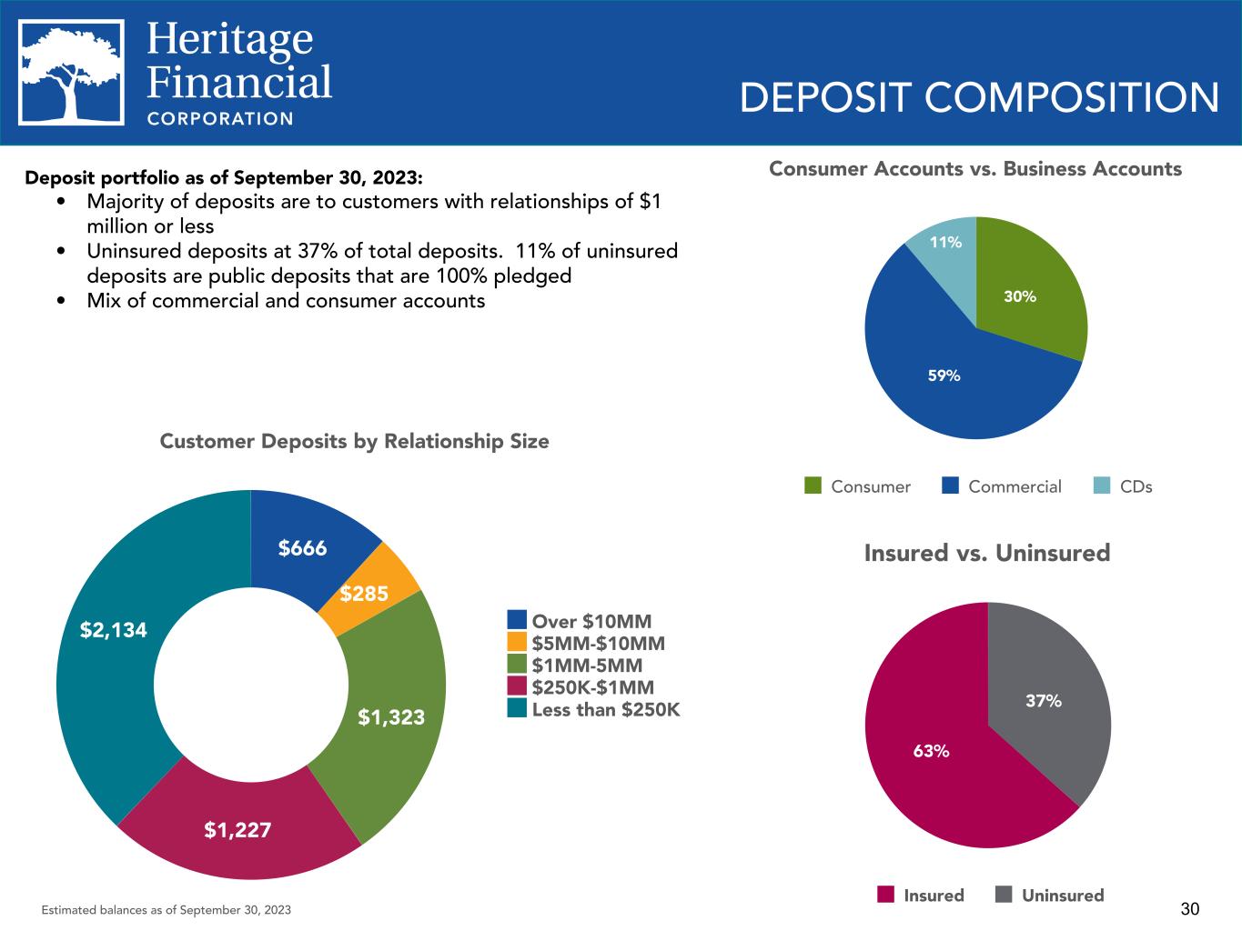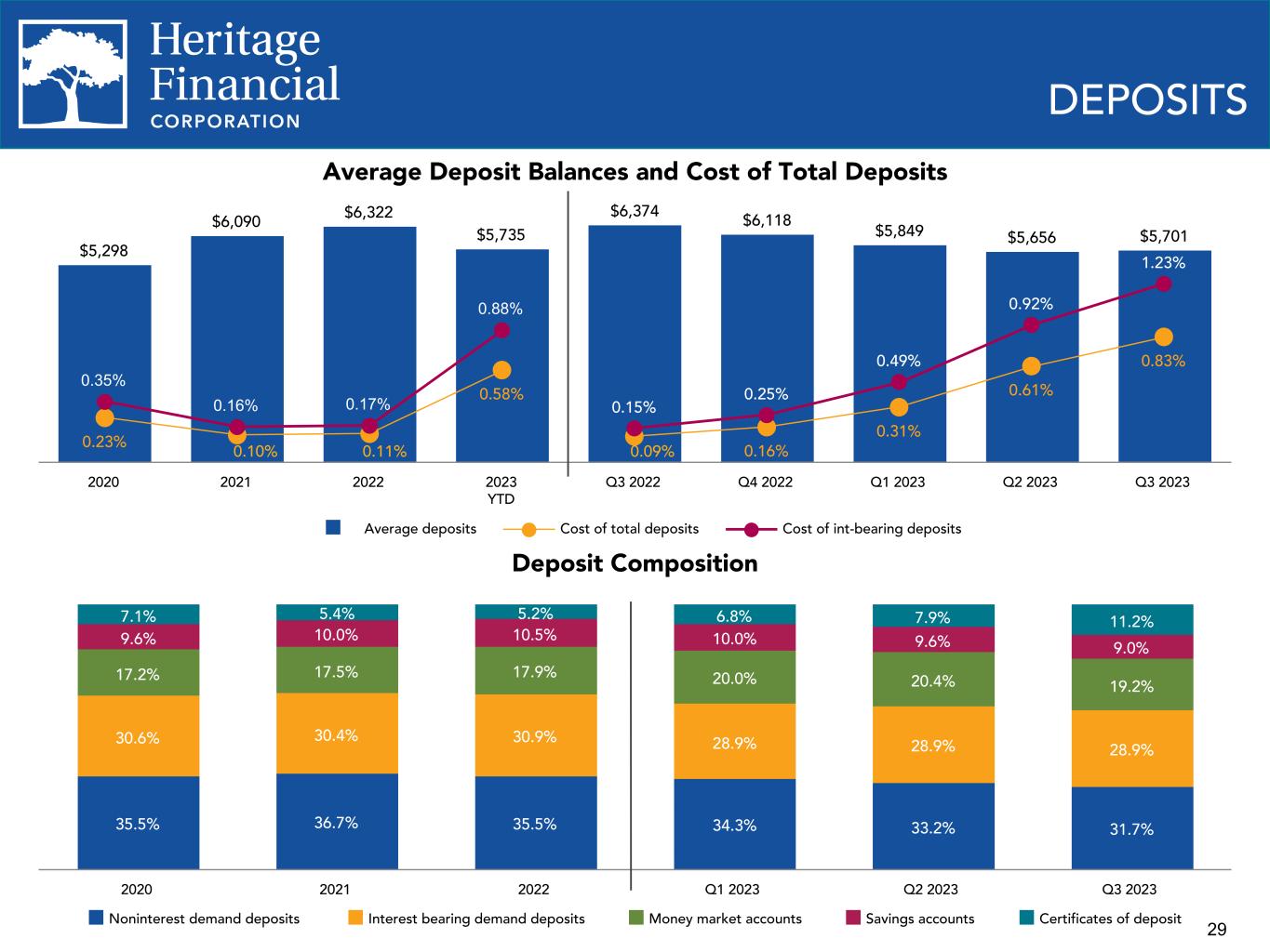 29 $5,298 $6,090 $6,322 $5,735 $6,374 $6,118 $5,849 $5,656 $5,701 0.23% 0.58% 0.16% 0.31% 0.61% 0.83% 0.15% 0.25% 0.49% 0.92% 1.23% 0.35% 0.16% 0.17% 0.88% Average deposits Cost of total deposits Cost of int-bearing deposits 2020 2021 2022 2023 YTD Q3 2022 Q4 2022 Q1 2023 Q2 2023 Q3 2023 Deposit Composition DEPOSITS Average Deposit Balances and Cost of Total Deposits 35.5% 36.7% 35.5% 34.3% 33.2% 31.7% 30.6% 30.4% 30.9% 28.9% 28.9% 28.9% 17.2% 17.5% 17.9% 20.0% 20.4% 19.2% 9.6% 10.0% 10.5% 10.0% 9.6% 9.0% 7.1% 5.4% 5.2% 6.8% 7.9% 11.2% Noninterest demand deposits Interest bearing demand deposits Money market accounts Savings accounts Certificates of deposit 2020 2021 2022 Q1 2023 Q2 2023 Q3 2023 0.09%0.11%0.10%