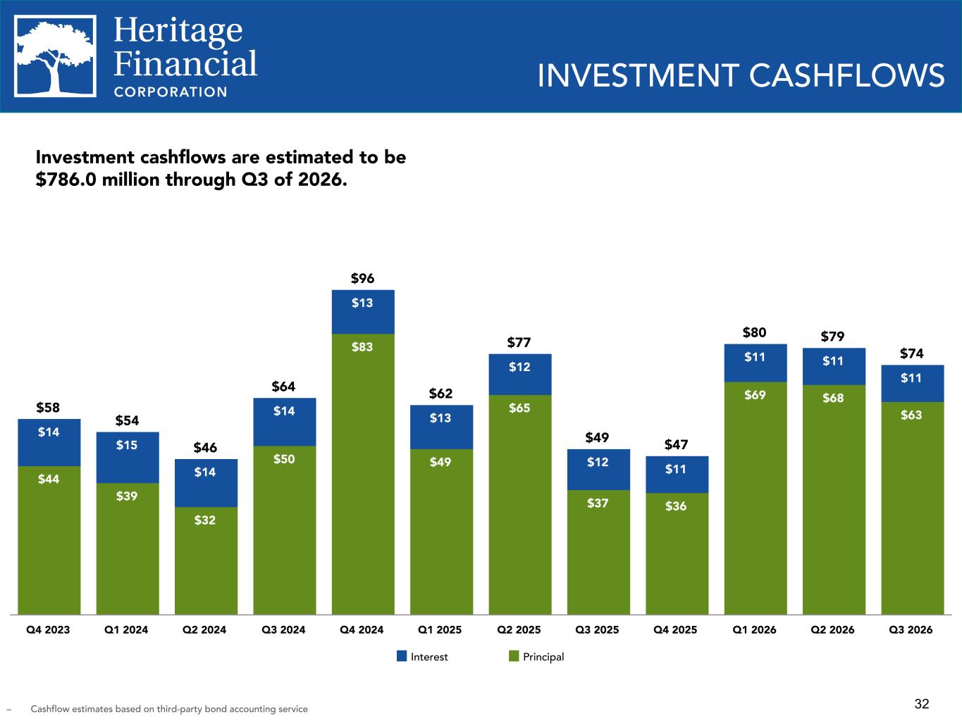32 $58 $54 $46 $64 $96 $62 $77 $49 $47 $80 $79 $74 $44 $39 $32 $50 $83 $49 $65 $37 $36 $69 $68 $63 $14 $15 $14 $14 $13 $13 $12 $12 $11 $11 $11 $11 Interest Principal Q4 2023 Q1 2024 Q2 2024 Q3 2024 Q4 2024 Q1 2025 Q2 2025 Q3 2025 Q4 2025 Q1 2026 Q2 2026 Q3 2026 INVESTMENT CASHFLOWS Investment cashflows are estimated to be $786.0 million through Q3 of 2026. – Cashflow estimates based on third-party bond accounting service