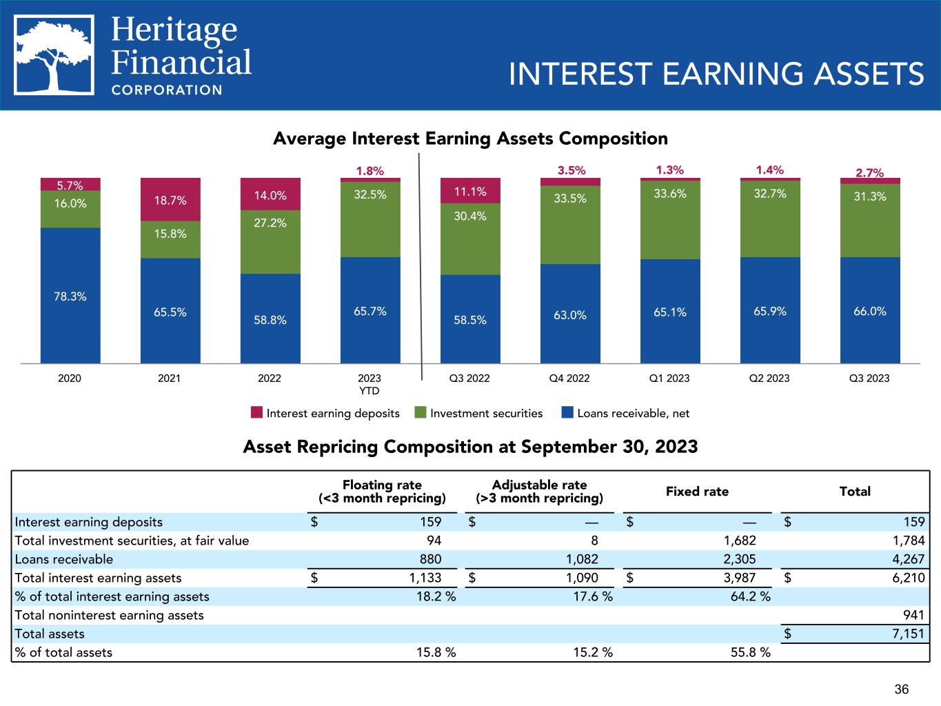 35 3.15% 0.87% 0.40% (0.05)% (0.44)% (0.29)% 3.64% YTD September 30, 2022 Loans Investments Interest earning deposits Deposits Borrowings YTD September 30, 2023 3.63% 3.23% 3.35% 3.64% 3.57% 3.98% 3.91% 3.56% 3.47% NIM 2020 2021 2022 2023 YTD Q3 2022 Q4 2022 Q1 2023 Q2 2023 Q3 2023 NET INTEREST MARGIN Change in Net Interest Margin QTD Q2 2023 vs. QTD Q3 2023 Change in Net Interest Margin YTD Q3 2022 vs. YTD Q3 2023 Net Interest Margin 3.56% 0.08% (0.04)% 0.07% (0.19)% (0.01)% 3.47% QTD June 30, 2023 Loans Investments Interest earning deposits Deposits Borrowings QTD September 30, 2023