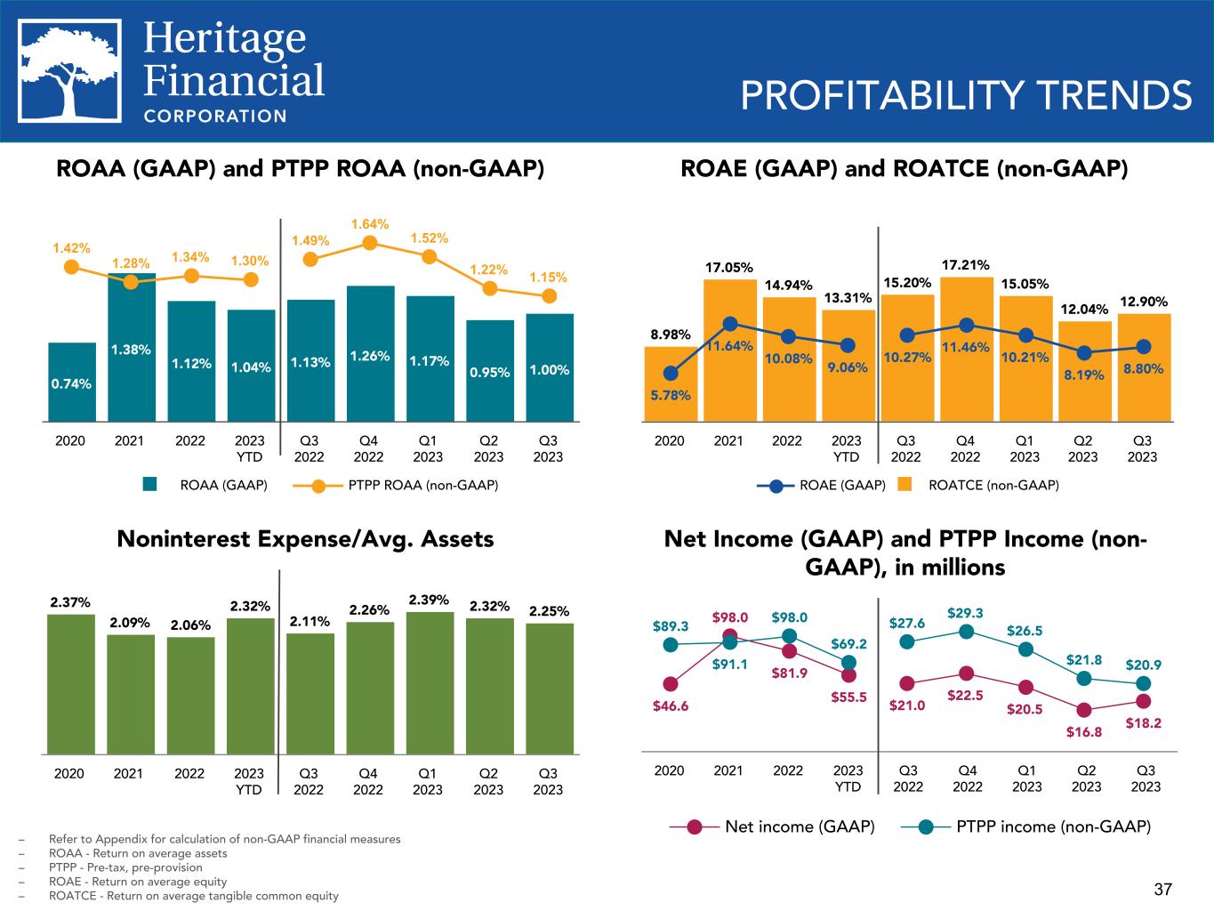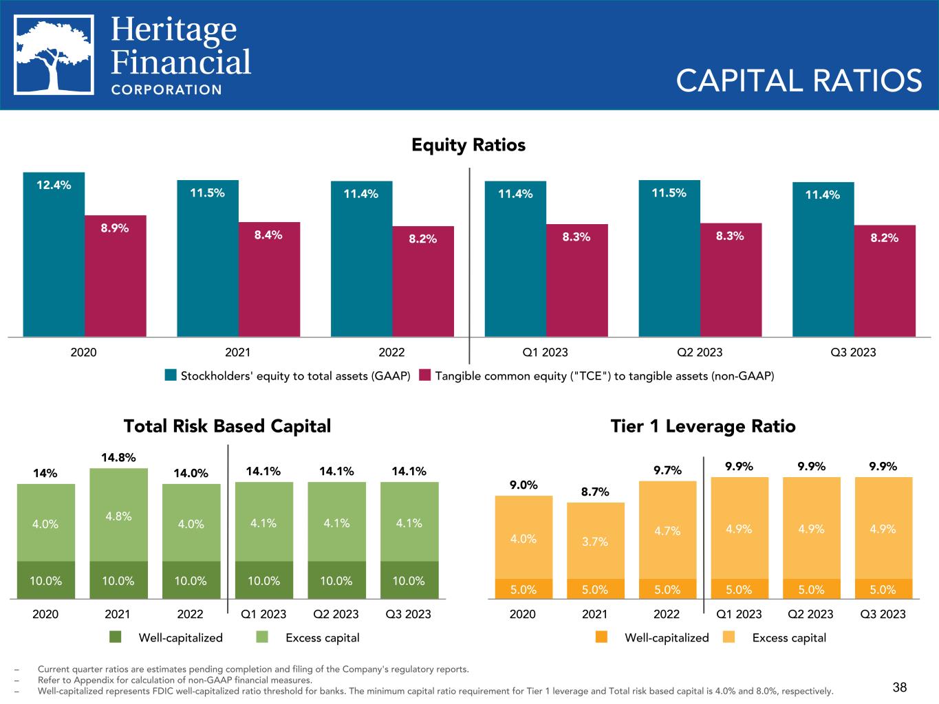 37 $46.6 $98.0 $81.9 $55.5 $89.3 $91.1 $98.0 $69.2 Net income (GAAP) PTPP income (non-GAAP) 2020 2021 2022 2023 YTD Q3 2022 Q4 2022 Q1 2023 Q2 2023 Q3 2023 $21.0 $22.5 $20.5 $16.8 $18.2 $27.6 $29.3 $26.5 $21.8 $20.9 PROFITABILITY TRENDS ROAE (GAAP) and ROATCE (non-GAAP) Noninterest Expense/Avg. Assets ROAA (GAAP) and PTPP ROAA (non-GAAP) 0.74% 1.38% 1.12% 1.04% 1.13% 1.26% 1.17% 0.95% 1.00% 1.42% 1.28% 1.34% 1.30% 1.49% 1.64% 1.52% 1.22% 1.15% ROAA (GAAP) PTPP ROAA (non-GAAP) 2020 2021 2022 2023 YTD Q3 2022 Q4 2022 Q1 2023 Q2 2023 Q3 2023 Net Income (GAAP) and PTPP Income (non- GAAP), in millions 8.98% 17.05% 14.94% 13.31% 15.20% 17.21% 15.05% 12.04% 12.90% 5.78% 11.64% 10.08% 9.06% 10.27% 11.46% 10.21% 8.19% 8.80% ROAE (GAAP) ROATCE (non-GAAP) 2020 2021 2022 2023 YTD Q3 2022 Q4 2022 Q1 2023 Q2 2023 Q3 2023 2.37% 2.09% 2.06% 2.32% 2.11% 2.26% 2.39% 2.32% 2.25% 2020 2021 2022 2023 YTD Q3 2022 Q4 2022 Q1 2023 Q2 2023 Q3 2023 – Refer to Appendix for calculation of non-GAAP financial measures – ROAA - Return on average assets – PTPP - Pre-tax, pre-provision – ROAE - Return on average equity – ROATCE - Return on average tangible common equity