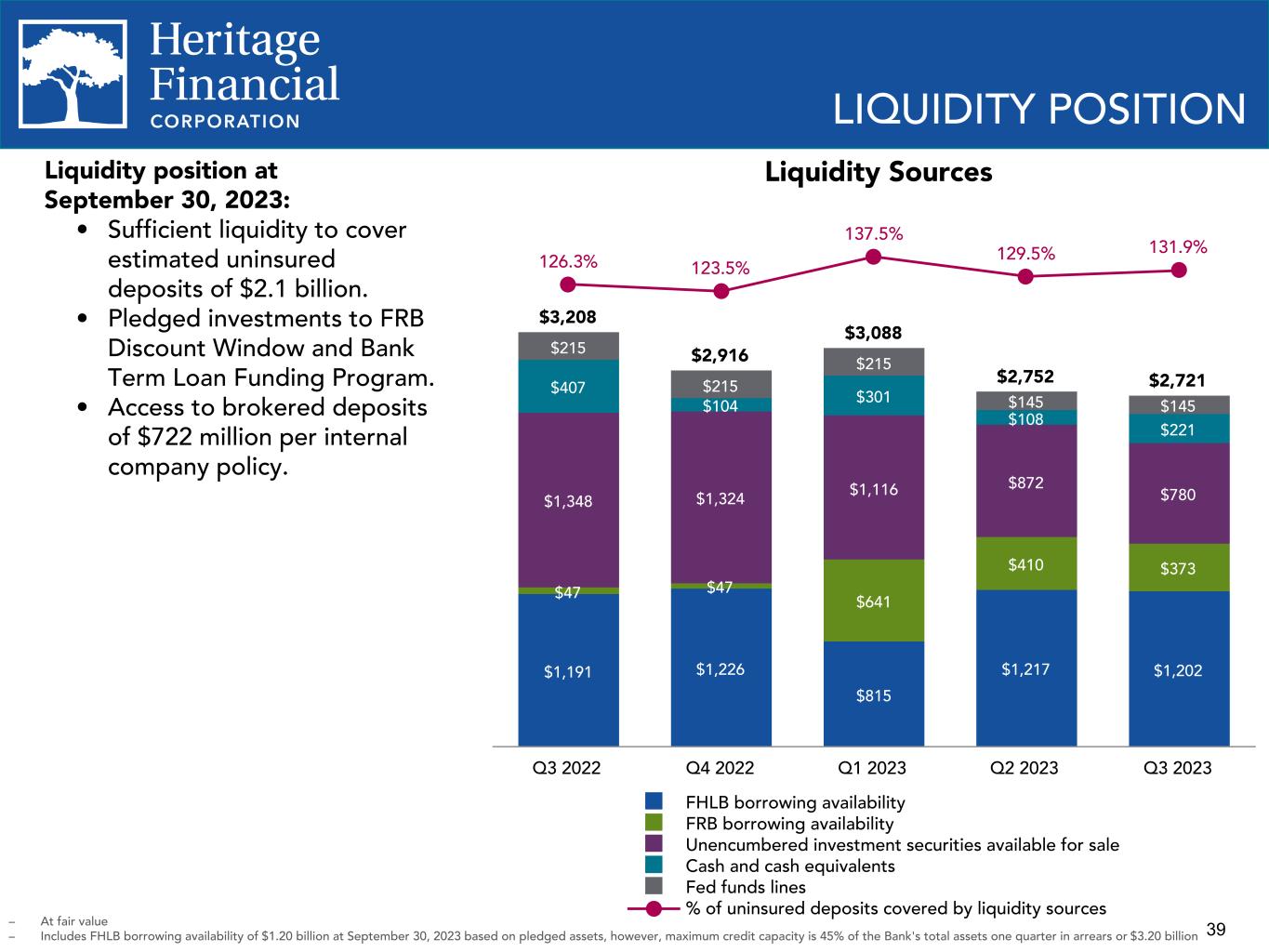 39 LIQUIDITY POSITION – At fair value – Includes FHLB borrowing availability of $1.20 billion at September 30, 2023 based on pledged assets, however, maximum credit capacity is 45% of the Bank's total assets one quarter in arrears or $3.20 billion Liquidity position at September 30, 2023: • Sufficient liquidity to cover estimated uninsured deposits of $2.1 billion. • Pledged investments to FRB Discount Window and Bank Term Loan Funding Program. • Access to brokered deposits of $722 million per internal company policy. $3,208 $2,916 $3,088 $2,752 $2,721 $1,191 $1,226 $815 $1,217 $1,202 $47 $47 $641 $410 $373 $1,348 $1,324 $1,116 $872 $780 $407 $104 $301 $108 $221 $215 $215 $215 $145 $145 126.3% 123.5% 137.5% 129.5% 131.9% FHLB borrowing availability FRB borrowing availability Unencumbered investment securities available for sale Cash and cash equivalents Fed funds lines % of uninsured deposits covered by liquidity sources Q3 2022 Q4 2022 Q1 2023 Q2 2023 Q3 2023 Liquidity Sources